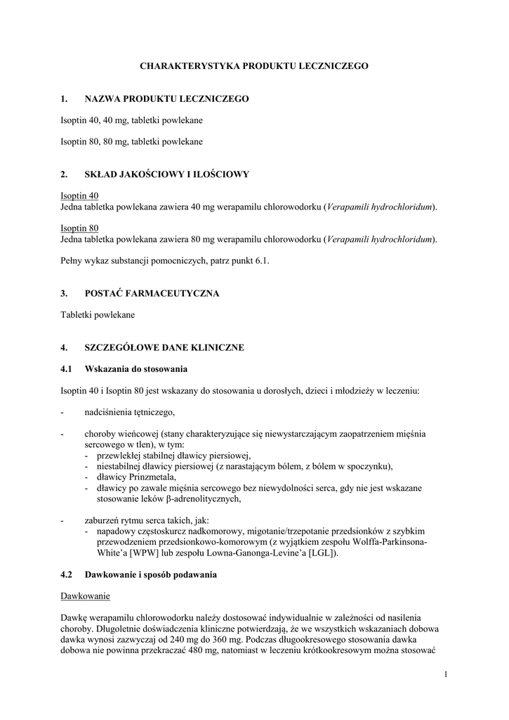 CHARAKTERYSTYKA PRODUKTU LECZNICZEGO 1. NAZWA PRODUKTU LECZNICZEGO Isoptin 40, 40 mg, tabletki powlekane Isoptin 80, 80 mg, tabletki powlekane 2. SKŁAD JAKOŚCIOWY I ILOŚCIOWY Isoptin 40 Jedna tabletka powlekana zawiera 40 mg werapamilu chlorowodorku (Verapamili hydrochloridum). Isoptin 80 Jedna tabletka powlekana zawiera 80 mg werapamilu chlorowodorku (Verapamili hydrochloridum). Pełny wykaz substancji pomocniczych, patrz punkt 6.1. 3. POSTAĆ FARMACEUTYCZNA Tabletki powlekane 4. SZCZEGÓŁOWE DANE KLINICZNE 4.1 Wskazania do stosowania Isoptin 40 i Isoptin 80 jest wskazany do stosowania u dorosłych, dzieci i młodzieży w leczeniu: - nadciśnienia tętniczego, - choroby wieńcowej (stany charakteryzujące się niewystarczającym zaopatrzeniem mięśnia sercowego w tlen), w tym: - przewlekłej stabilnej dławicy piersiowej, - niestabilnej dławicy piersiowej (z narastającym bólem, z bólem w spoczynku), - dławicy Prinzmetala, - dławicy po zawale mięśnia sercowego bez niewydolności serca, gdy nie jest wskazane stosowanie leków β-adrenolitycznych, - zaburzeń rytmu serca takich, jak: - napadowy częstoskurcz nadkomorowy, migotanie/trzepotanie przedsionków z szybkim przewodzeniem przedsionkowo-komorowym (z wyjątkiem zespołu Wolffa-ParkinsonaWhite’a [WPW] lub zespołu Lowna-Ganonga-Levine’a [LGL]). 4.2 Dawkowanie i sposób podawania Dawkowanie Dawkę werapamilu chlorowodorku należy dostosować indywidualnie w zależności od nasilenia choroby. Długoletnie doświadczenia kliniczne potwierdzają, że we wszystkich wskazaniach dobowa dawka wynosi zazwyczaj od 240 mg do 360 mg. Podczas długookresowego stosowania dawka dobowa nie powinna przekraczać 480 mg, natomiast w leczeniu krótkookresowym można stosować 1 większą dawkę. Czas stosowania produktu leczniczego jest nieograniczony. Po długim stosowaniu nie wolno gwałtownie odstawiać werapamilu chlorowodorku. Zaleca się stopniowe zmniejszanie dawki. Werapamilu chlorowodorek tabletki powlekane 40 mg należy stosować u pacjentów, którzy mogą wykazać zadowalającą odpowiedź na małe dawki (np. pacjenci z niewydolnością wątroby lub w podeszłym wieku). U pacjentów wymagających większych dawek (np. 240 mg do 480 mg werapamilu chlorowodorku na dobę) należy stosować produkt leczniczy Isoptin 80 tabletki powlekane 80 mg, Isoptin SR tabletki o przedłużonym uwalnianiu 120 mg lub Isoptin SR-E 240 tabletki o przedłużonym uwalnianiu 240 mg. Dorośli i młodzież o masie ciała ponad 50 kg Nadciśnienie: 120 mg do 480 mg na dobę w trzech dawkach podzielonych. Choroba wieńcowa, napadowy częstoskurcz nadkomorowy, migotanie przedsionków i trzepotanie przedsionków: 120 mg do 480 mg na dobę w trzech lub czterech dawkach podzielonych. Specjalne populacje Dzieci i młodzież (wyłącznie w zaburzeniach rytmu serca) Wiek do 6 lat: 80 mg do 120 mg werapamilu chlorowodorku na dobę w dwóch lub trzech dawkach podzielonych. Wiek od 6 do 14 lat: 80 mg do 360 mg werapamilu chlorowodorku na dobę w dwóch, trzech lub czterech dawkach podzielonych. Zaburzenia czynności nerek Aktualne dostępne dane przedstawiono w punkcie 4.4. Podczas stosowania werapamilu chlorowodorku u pacjentów z zaburzeniami czynności nerek należy zachować ostrożność i dokładnie monitorować stan pacjenta. Zaburzenia czynności wątroby U pacjentów z niewydolnością wątroby, metabolizm leku jest w różnym stopniu zaburzony w zależności od stopnia niewydolności wątroby, co sprawia, że werapamilu chlorowodorek działa silniej i dłużej. Z tego względu należy zachować szczególną ostrożność podczas określania dawki u pacjentów z niewydolnością wątroby i w początkowym okresie leczenia podawać małe dawki (patrz punkt 4.4). Sposób podawania Podanie doustne. Tabletki należy połykać w całości (nie ssać, ani nie rozgryzać), popijając odpowiednią ilością płynu, najlepiej w trakcie lub bezpośrednio po posiłku. 4.3 Przeciwwskazania - Nadwrażliwość na werapamilu chlorowodorek lub na którąkolwiek substancję pomocniczą wymienioną w punkcie 6.1. Wstrząs kardiogenny. Blok przedsionkowo-komorowy II° lub III° (z wyjątkiem pacjentów ze sprawnym stymulatorem serca). Zespół chorego węzła zatokowego (z wyjątkiem pacjentów ze sprawnym stymulatorem serca). Niewydolność serca ze zmniejszeniem frakcji wyrzutowej poniżej 35% oraz (lub) ciśnieniem zaklinowania w tętnicy płucnej powyżej 20 mmHg (jeśli nie jest wtórne do częstoskurczu nadkomorowego ustępującego po leczeniu werapamilem). Migotanie/trzepotanie przedsionków z obecnością dodatkowej drogi przewodzenia (np. zespół Wolffa-Parkinsona-White’a [WPW], zespół Lowna-Ganonga-Levine’a [LGL]). W przypadku podania werapamilu chlorowodorku u tych pacjentów istnieje ryzyko wystąpienia tachyarytmii komorowej, w tym migotania komór. - - 2 Jednoczesne przyjmowanie iwabradyny (patrz punkt 4.5). 4.4 Specjalne ostrzeżenia i środki ostrożności dotyczące stosowania Ostry zawał mięśnia sercowego Stosować z zachowaniem ostrożności w ostrym zawale mięśnia sercowego powikłanym rzadkoskurczem, znacznym niedociśnieniem tętniczym lub zaburzeniami czynności lewej komory. Blok serca/blok przedsionkowo-komorowy Io/rzadkoskurcz/asystolia Werapamilu chlorowodorek działa na węzeł przedsionkowo-komorowy oraz węzeł zatokowoprzedsionkowy i wydłuża czas przewodzenia przedsionkowo-komorowego. Należy stosować z zachowaniem ostrożności, ponieważ w przypadku wystąpienia bloku przedsionkowo-komorowego IIo lub IIIo (przeciwwskazanie) lub jednowiązkowego, dwuwiązkowego lub trójwiązkowego bloku pęczka Hisa należy zaprzestać stosowania i, w razie potrzeby, wdrożyć odpowiednie leczenie. Werapamilu chlorowodorek działa na węzeł przedsionkowo-komorowy i węzeł zatokowoprzedsionkowy i w rzadkich przypadkach może powodować blok przedsionkowo-komorowy IIo lub IIIo, rzadkoskurcz, a w skrajnych przypadkach – asystolię. Jest to ba