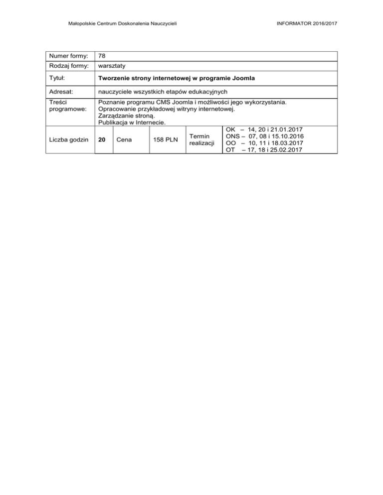 Małopolskie Centrum Doskonalenia Nauczycieli INFORMATOR 2016/2017 Numer formy: 78 Rodzaj formy: warsztaty Tytuł: Tworzenie strony internetowej w programie Joomla Adresat: nauczyciele wszystkich etapów edukacyjnych Treści programowe: Poznanie programu CMS Joomla i możliwości jego wykorzystania. Opracowanie przykładowej witryny internetowej. Zarządzanie stroną. Publikacja w Internecie. OK – 14, 20 i 21.01.2017 Termin ONS – 07, 08 i 15.10.2016 20 Cena 158 PLN realizacji OO – 10, 11 i 18.03.2017 OT – 17, 18 i 25.02.2017 Liczba godzin