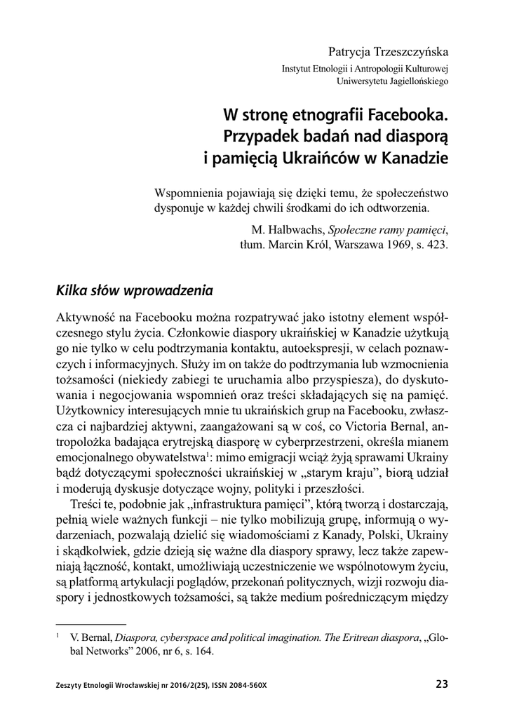 Patrycja Trzeszczyńska Instytut Etnologii i Antropologii Kulturowej Uniwersytetu Jagiellońskiego W stronę etnografii Facebooka. Przypadek badań nad diasporą i pamięcią Ukraińców w Kanadzie Wspomnienia pojawiają się dzięki temu, że społeczeństwo dysponuje w każdej chwili środkami do ich odtworzenia. M. Halbwachs, Społeczne ramy pamięci, tłum. Marcin Król, Warszawa 1969, s. 423. Kilka słów wprowadzenia Aktywność na Facebooku można rozpatrywać jako istotny element współczesnego stylu życia. Członkowie diaspory ukraińskiej w Kanadzie użytkują go nie tylko w celu podtrzymania kontaktu, autoekspresji, w celach poznawczych i informacyjnych. Służy im on także do podtrzymania lub wzmocnienia tożsamości (niekiedy zabiegi te uruchamia albo przyspiesza), do dyskutowania i negocjowania wspomnień oraz treści składających się na pamięć. Użytkownicy interesujących mnie tu ukraińskich grup na Facebooku, zwłaszcza ci najbardziej aktywni, zaangażowani są w coś, co Victoria Bernal, antropolożka badająca erytrejską diasporę w cyberprzestrzeni, określa mianem emocjonalnego obywatelstwa1: mimo emigracji wciąż żyją sprawami Ukrainy bądź dotyczącymi społeczności ukraińskiej w „starym kraju”, biorą udział i moderują dyskusje dotyczące wojny, polityki i przeszłości. Treści te, podobnie jak „infrastruktura pamięci”, którą tworzą i dostarczają, pełnią wiele ważnych funkcji – nie tylko mobilizują grupę, informują o wydarzeniach, pozwalają dzielić się wiadomościami z Kanady, Polski, Ukrainy i skądkolwiek, gdzie dzieją się ważne dla diaspory sprawy, lecz także zapewniają łączność, kontakt, umożliwiają uczestniczenie we wspólnotowym życiu, są platformą artykulacji poglądów, przekonań politycznych, wizji rozwoju diaspory i jednostkowych tożsamości, są także medium pośredniczącym między 1 V. Bernal, Diaspora, cyberspace and political imagination. The Eritrean diaspora, „Global Networks” 2006, nr 6, s. 164. Zeszyty Etnologii Wrocławskiej nr 2016/2(25), ISSN 2084-560X 23 Patrycja Trzeszczyńska życiem etnicznym, odbywającym się w pozawirtualnej przestrzeni a przestrzenią braku aktywności, sferą domową, prywatną. Zgodnie z sugestią antropologów zajmujących się Internetem odrzucam anachroniczną już dziś dychotomię: realny i wirtualny2. Świat online stał się współcześnie integralną częścią codziennego życia, więc utrzymanie tej dychotomii nie jest już możliwe ani konieczne. Można być zatem w danym momencie online lub offline (choć popularność smartfonów zdaje się temu zaprzeczać, jako że nieustannie jesteśmy online, mając Internet w telefonie), jednak utrzymywanie podziału na realne i wirtualne przestrzenie nie ma dziś już mocy. Podczas badań w diasporze ukraińskiej w Kanadzie przekonałam się, jak mocno Internet obecny jest dziś w życiu społecznym, w codzienności, w każdej chwili życia jednostek. Facebook traktuję w swoich badaniach jako narzędzie, źródło danych i kontekst. Pierwsze zastrzeżenie dotyczy kanału komunikacji, drugie – danych pozwalających wnioskować o zasobach, treści i kształcie pamięci interesującej mnie grupy, trzecie natomiast oznacza dostarczenie kontekstu3. Jest to materiał uzupełniający do głównego nurtu etnograficznych badań terenowych, które prowadzę od 2014 r. w ukraińskiej diasporze w Kanadzie4. Jak piszą David Piacenti, Luis Rivas i Josef Garret, zwolennicy prowadzenia badań w środowisku Facebooka, „etnografia Facebooka” to nowa, poststrukturalistyczna metodologia, która przekracza dotychczasowe uwikłania autorytetu badacza zajmującego uprzywilejowaną pozycję wobec badanych oraz obala tradycyjne 2 3 4 24 A.C. Garcia, A.I. Standlee, J. Bechkoff, Y. Cui, Ethnographic Approaches to the Internet and Computer-Mediated Communication, „Journal of Contemporary Ethnography” 2009, Vol. 38 (1), s. 52–84; S. Dalsgaard, The Ethnographic Use of Facebook in Everyday Life, „Anthropological Forum” 2016, nr 26 (1), s. 96–114. S. Baker, Conceptualising the use of Facebook in ethnographic research. As tool, as data and as contex, „Ethnography and Education” 2013, Vol. 8, No. 2, s. 131–145. W 2014 r. przebywałam na półrocznym stażu naukowym w Canadian Institute of Ukrainian Studies na Univeristy of Alberta w Edmonton jako stypendystka programu „Mobilność Plus” MNiSW, z czego cztery miesiące spędziłam w Edmonton, a dwa w Toronto wśród tamtejszej społeczności Ukraińców z Polski, którzy przybyli do Kanady w latach 80. XX wieku. W 2015 r. otrzymałam stypendium Petro Jacyk Program for the Study of Ukraine w Centre for Russian and East European Studies w University of Toronto, które pozwoliło mi na kontynuację badań w Toronto, a w 2016 r. dzięki stypendium Canadian Institute of Ukrainian Studies ponownie odwiedziłam Edmonton i zakończyłam badania w Toronto. Łącznie moje badania w Kanadzie trwały nieco ponad rok. Por. P. Trzeszczyńska, „My jeździmy do Polski, bo my tam mamy wspomnienia”. O pamięci Ukraińców z Polski w Kanadzie. Komunikat z badań terenowych, „Prace Etnograficzne” 2014, t. 42, z. 3, s. 257–278. W stronę etnografii Facebooka strukturalistyczne dychotomie, wciąż, ich zdaniem, obecne w etnograficznej metodologii: badacz–badany, obserwator–obserwowany, podmiot–przedmiot, formalizm nauki–nieformalność życia5. Co więcej, w przestrzeni Facebooka badacz włącza zarówno profesjonalne, jak i osobiste „ja” w warstwy doświadczenia, przekracza uwikłania czasu i przestrzeni właściwe dla tradycyjnych badań, a jego teren staje się wielostanowiskowy (multi-sited). W tak pojętej rozszerzonej etnografii (expanded ethnography) badacz sytuuje się jednocześnie w pozycji obserwatora i uczestnika, i musi jakoś ustosunkować się do zaniku podziału na sferę prywatną i publiczną. Musi pogodzić się z tym, że nie ma tu ko