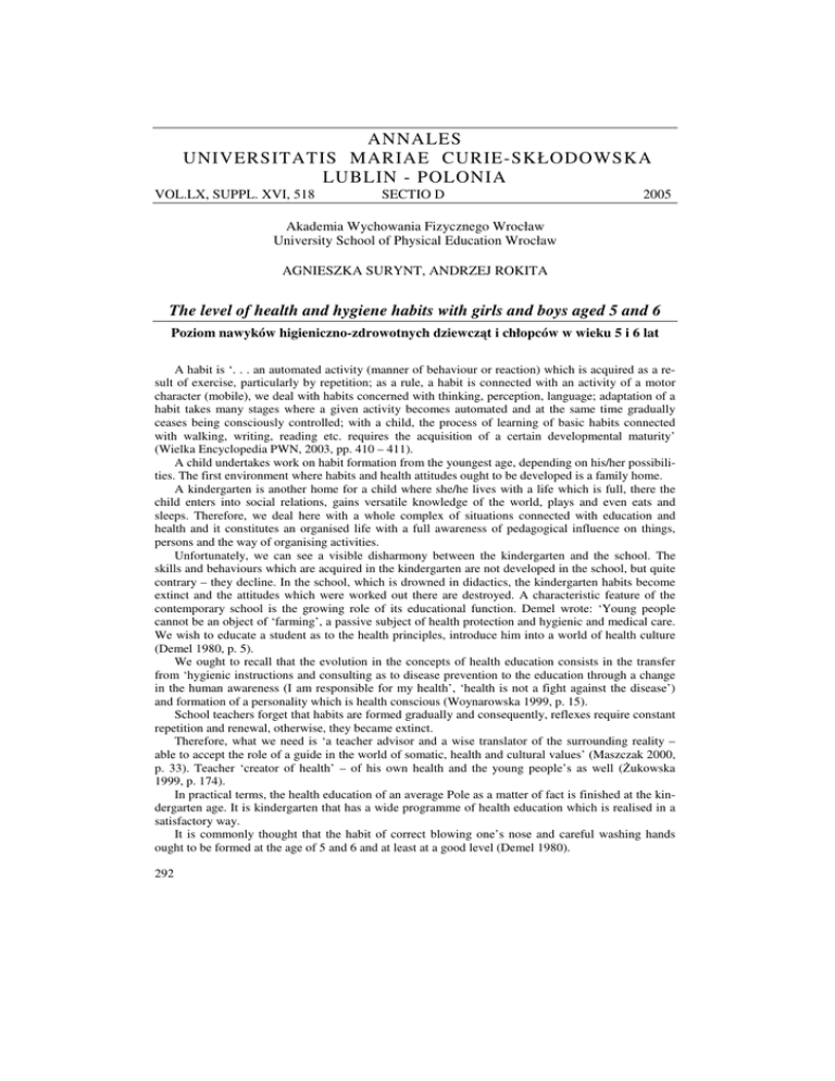 ANNALES UNIVERSITATIS MARIAE CURIE-SKŁODOWSKA LUBLIN - POLONIA VOL.LX, SUPPL. XVI, 518 SECTIO D 2005 Akademia Wychowania Fizycznego Wrocław University School of Physical Education Wrocław AGNIESZKA SURYNT, ANDRZEJ ROKITA The level of health and hygiene habits with girls and boys aged 5 and 6 Poziom nawyków higieniczno-zdrowotnych dziewcząt i chłopców w wieku 5 i 6 lat A habit is ‘. . . an automated activity (manner of behaviour or reaction) which is acquired as a result of exercise, particularly by repetition; as a rule, a habit is connected with an activity of a motor character (mobile), we deal with habits concerned with thinking, perception, language; adaptation of a habit takes many stages where a given activity becomes automated and at the same time gradually ceases being consciously controlled; with a child, the process of learning of basic habits connected with walking, writing, reading etc. requires the acquisition of a certain developmental maturity’ (Wielka Encyclopedia PWN, 2003, pp. 410 – 411). A child undertakes work on habit formation from the youngest age, depending on his/her possibilities. The first environment where habits and health attitudes ought to be developed is a family home. A kindergarten is another home for a child where she/he lives with a life which is full, there the child enters into social relations, gains versatile knowledge of the world, plays and even eats and sleeps. Therefore, we deal here with a whole complex of situations connected with education and health and it constitutes an organised life with a full awareness of pedagogical influence on things, persons and the way of organising activities. Unfortunately, we can see a visible disharmony between the kindergarten and the school. The skills and behaviours which are acquired in the kindergarten are not developed in the school, but quite contrary – they decline. In the school, which is drowned in didactics, the kindergarten habits become extinct and the attitudes which were worked out there are destroyed. A characteristic feature of the contemporary school is the growing role of its educational function. Demel wrote: ‘Young people cannot be an object of ‘farming’, a passive subject of health protection and hygienic and medical care. We wish to educate a student as to the health principles, introduce him into a world of health culture (Demel 1980, p. 5). We ought to recall that the evolution in the concepts of health education consists in the transfer from ‘hygienic instructions and consulting as to disease prevention to the education through a change in the human awareness (I am responsible for my health’, ‘health is not a fight against the disease’) and formation of a personality which is health conscious (Woynarowska 1999, p. 15). School teachers forget that habits are formed gradually and consequently, reflexes require constant repetition and renewal, otherwise, they became extinct. Therefore, what we need is ‘a teacher advisor and a wise translator of the surrounding reality – able to accept the role of a guide in the world of somatic, health and cultural values’ (Maszczak 2000, p. 33). Teacher ‘creator of health’ – of his own health and the young people’s as well (Żukowska 1999, p. 174). In practical terms, the health education of an average Pole as a matter of fact is finished at the kindergarten age. It is kindergarten that has a wide programme of health education which is realised in a satisfactory way. It is commonly thought that the habit of correct blowing one’s nose and careful washing hands ought to be formed at the age of 5 and 6 and at least at a good level (Demel 1980). 292 But is it really so? Do children at the kindergarten age have fully formed basic habits of hygiene and health? In order to find an answer to this question, we decided to start research whose aim was to determine the level of acquiring two basic habits connected with hygiene and health: correct washing of hands and careful cleaning of the upper airways by the children aged 5 and 6. METHOD AND RESEARCH MATERIAL In order to acquire reliable data as to correct washing of hands and careful cleaning of the upper airways we employed the method of direct observation of children who performed the task set before them. The examination took place in a kindergarten bathroom where we prepared special stands for the realisation. First, the children were subjected to the test of blowing one’s nose, next, washing hands. All the children participating in the examination performed the tests separately. In the examination we employed previously designed observation sheets which took into account, previously singled out as significant, the particular elements of the performance of the activity of blowing one’s secretion from the nose and washing hands. In the observation sheet for cleaning the upper airways we included the following elements: is the child in possession of a tissue, does he spread the tissue, put it towards the nose, blocks one of the nostrils and blows the other one, carefully wipes the nose, throws the tissue away. In the case of washing hands, the observation sheet consisted of the following elements: does the child turn the tap on, gets the hands wet, uses the soap, washes hands, rinse hands carefully, turns the tap off, dries hands until they are completely dry. The research was conducted in the autumn of 2004 in three randomly chosen kindergartens in Wrocław. Our research comprised 44 children aged 5 (22 girls and 20 boys) and 58 children aged 6 (35 girls and 23 boys). Results of the examinations The observation we conducted revealed that among the five year olds, both girls and boys alike, the level of the acquisition of the ability to clean the upper airways is unsatisfactory (tab.1). In a group of 44 children aged 5 only three were in possession of a tissue (2 girls, 1 boy). This means that over 90% of the examined 5 year olds did not have their own tissues.