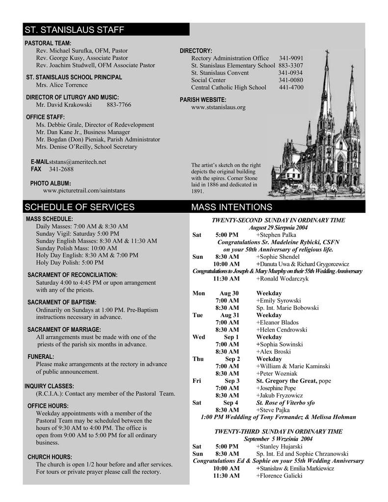 ST. STANISLAUS STAFF PASTORAL TEAM: Rev. Michael Surufka, OFM, Pastor Rev. George Kusy, Associate Pastor Rev. Joachim Studwell, OFM Associate Pastor ST. STANISLAUS SCHOOL PRINCIPAL Mrs. Alice Torrence DIRECTORY: Rectory Administration Office St. Stanislaus Elementary School St. Stanislaus Convent Social Center Central Catholic High School DIRECTOR OF LITURGY AND MUSIC: Mr. David Krakowski 883-7766 PARISH WEBSITE: www.ststanislaus.org 341-9091 883-3307 341-0934 341-0080 441-4700 OFFICE STAFF: Ms. Debbie Grale, Director of Redevelopment Mr. Dan Kane Jr., Business Manager Mr. Bogdan (Don) Pieniak, Parish Administrator Mrs. Denise O’Reilly, School Secretary [email protected] FAX 341-2688 PHOTO ALBUM: www.picturetrail.com/saintstans The artist’s sketch on the right depicts the original building with the spires. Corner Stone laid in 1886 and dedicated in 1891. SCHEDULE OF SERVICES MASS INTENTIONS MASS SCHEDULE: Daily Masses: 7:00 AM & 8:30 AM Sunday Vigil: Saturday 5:00 PM Sunday English Masses: 8:30 AM & 11:30 AM Sunday Polish Mass: 10:00 AM Holy Day English: 8:30 AM & 7:00 PM Holy Day Polish: 5:00 PM TWENTY-SECOND SUNDAY IN ORDINARY TIME August 29 Sierpnia 2004 Sat 5:00 PM +Stephen Palka Congratulations Sr. Madeleine Rybicki, CSFN on your 50th Anniversary of religious life. Sun 8:30 AM +Sophie Shendel 10:00 AM +Danuta Uwa & Richard Grygorcewicz Congratulations to Joseph & Mary Murphy on their 55th Wedding Anniversary 11:30 AM +Ronald Wodarczyk SACRAMENT OF RECONCILIATION: Saturday 4:00 to 4:45 PM or upon arrangement with any of the priests. SACRAMENT OF BAPTISM: Ordinarily on Sundays at 1:00 PM. Pre-Baptism instructions necessary in advance. SACRAMENT OF MARRIAGE: All arrangements must be made with one of the priests of the parish six months in advance. FUNERAL: Please make arrangements at the rectory in advance of public announcement. INQUIRY CLASSES: (R.C.I.A.): Contact any member of the Pastoral Team. OFFICE HOURS: Weekday appointments with a member of the Pastoral Team may be scheduled between the hours of 9:30 AM to 4:00 PM. The office is open from 9:00 AM to 5:00 PM for all ordinary business. CHURCH HOURS: The church is open 1/2 hour before and after services. For tours or private prayer please call the rectory. Mon Aug 30 Weekday 7:00 AM +Emily Syrowski 8:30 AM Sp. Int. Marie Bobowski Tue Aug 31 Weekday 7:00 AM +Eleanor Blados 8:30 AM +Helen Cendrowski Wed Sep 1 Weekday 7:00 AM +Sophia Sowinski 8:30 AM +Alex Broski Thu Sep 2 Weekday 7:00 AM +William & Marie Kaminski 8:30 AM +Peter Wozniak Fri Sep 3 St. Gregory the Great, pope 7:00 AM +Josephine Pope 8:30 AM +Jakub Fryzowicz Sat Sep 4 St. Rose of Viterbo sfo 8:30 AM +Steve Pajka 1:00 PM Weddding of Tony Fernandez & Melissa Hohman TWENTY-THIRD SUNDAY IN ORDINARY TIME September 5 Wrzeœnia 2004 Sat 5:00 PM +Stanley Hujarski Sun 8:30 AM Sp. Int. Ed and Sophie Chrzanowski Congratulations Ed & Sophie on your 55th Wedding Anniversary 10:00 AM +Stanis³aw & Emilia Markiewicz 11:30 AM +Florence Galicki MUSIC – TWENTY-SECOND SUNDAY IN ORDINARY TIME ENGLISH MASS Processional: All Are Welcome #193 Offertory: Here I Am, Lord #210 Communion: Draw Near #237 Recessional: God’s Blessing Sends Us Forth #302 POLSKA MSZA ŒWIÊTA Procesja: Gwiazdo œliczna #214 Ofiarowanie: Wszystko Tobie #173 Na Komuniê: Jeden Chleb #150 Zakoñczenie: Apel Jasnogórski #198 WELCOME SCHEDULE FOR THE WEEK Mon Tues Wed Thu 6:45 PM 7:00PM 6:30 PM 8:00 PM 3:30 PM 6:30 PM BINGO in the social center. English Choir rehearses in the church. Youth Group meeting in the all purpose room. A.A. & Al-Anon in the social center. Church Cleanup Crew works until 5:15, followed by fellowship Polish Festival/Volunteer Meeting in the convectory. Tony Fernandez and Melissa Hohman St. Stanislaus is reaching out in service to our diverse neighborhood peoples. Please be generous in your support of the many good works of our Parish. St. Stanislaus depends upon the regular support of its membership and the generosity of those who visit here. Please look upon your financial gift or sacrifice as a way of giving praise to God along with the many from earlier generations who have worshiped and prayed here for 130 years. A Special Visitor on a Special Feast Who, what, where and when? Bishop Anthony Pilla, The Feast of the Nativity of Mary (Wednesday, September 8), at an evening Mass at our Shrine at 7:00PM. There – now you know. You may recall that back on May 8th, at our official Shrine designation liturgy, Bishop Pevec read the formal proclamation of our church’s elevation to the status of ‘shrine.’ His action that day was as representative of the Ordinary of the Diocese of Cleveland, Bishop Anthony Pilla. It just so happened that Bishop Pilla had to be in Rome for his ad limina meeting with Pope John Paul II thus, he was unable to share the joy of that most important day in the history of our parish. You might wonder the significance of the Feast of the Nativity of Mary. It just so happens to be the feastday on which in 1253 Stanislaus Szczepanowski was canonized. It occurred in Assisi at the direction of Pope Innocent IV. By 1253 paganism was pretty much contained in most of the Polish territories, but not totally. The canonization of Stanislaus would help in this matter bolstered by the cult’s imagery and fantastic stories about the new saint. Whether it had been part of a larger plan of those present to invoke Mary’s aid in their evangelization is not known, but it can be understood as it must be lauded. The Entrance Antiphon for her feast on that day praises the birth of the Virgin Mary, “of whom was born the sun of justice, Christ our Lord.” Together with our Shepherd, Bishop Pilla, we will celebrate the liturgy at which the Sun of Justice is sacrificed, we will honor His Mother and, we will commemorate the canonization of the patron of our parish, St. Stanislaus, Bishop and Martyr. I know it’s a Wednesday evening, but this is not an everyday event. Please come and sh