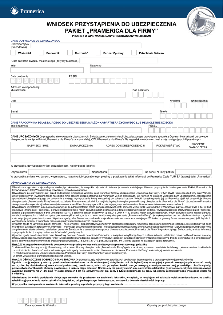 WNIOSEK PRZYSTĄPIENIA DO UBEZPIECZENIA PAKIET „PRAMERICA DLA FIRMY” PROSIMY O WPISYWANIE DANYCH DRUKOWANYMI LITERAMI DANE DOTYCZĄCE UBEZPIECZONEGO Ubezpieczający (Pracodawca) Właściciel Pracownik Małżonek* Partner Życiowy Pełnoletnie Dziecko *Data zawarcia związku małżeńskiego (dotyczy Małżonka) Imię Nazwisko Data urodzenia D D M M R R R R PESEL Adres do korespondencji: Miejscowość Kod pocztowy Ulica Nr domu E-mail Nr mieszkania Telefon DANE PRACOWNIKA ZGŁASZAJĄCEGO DO UBEZPIECZENIA MAŁŻONKA/PARTNERA ŻYCIOWEGO LUB PEŁNOLETNIE DZIECKO Imię i nazwisko PESEL DANE UPOSAŻONYCH (w przypadku niewskazania Uposażonych, Świadczenie z tytułu śmierci Ubezpieczonego przysługuje zgodnie z Ogólnymi warunkami grupowego ubezpieczenia na życie Pakiet „Pramerica dla Firmy” (zwanymi dalej „OWU Pramerica dla Firmy”). Na wypadek mojej śmierci wskazuję następujących Uposażonych: NAZWISKO I IMIĘ DATA URODZENIA ADRES DO KORESPONDENCJI POKREWIEŃSTWO PROCENT ŚWIADCZENIA W przypadku, gdy Uposażony jest cudzoziemcem, należy podać jego/jej: Obywatelstwo Nr paszportu lub serię i nr karty pobytu W przypadku zmiany ww. danych, w tym adresu, nazwiska lub Uposażonego, prosimy o przekazanie takiej informacji do Pramerica Życie TUiR SA (zwanej dalej „Pramerica”). OŚWIADCZENIA UBEZPIECZONEGO Oświadczam, zgodnie z moją najlepszą wiedzą i przekonaniem, że wszystkie odpowiedzi i informacje zawarte w niniejszym Wniosku przystąpienia do ubezpieczenia Pakiet „Pramerica dla Firmy” (zwanym dalej Wnioskiem) są prawdziwe i prawidłowo zapisane. Oświadczam, że otrzymałem/(-am) przed podpisaniem niniejszego Wniosku treść warunków Umowy ubezpieczenia „Pramerica dla Firmy”, w tym OWU Pramerica dla Firmy oraz Warunki umów dodatkowych i wyrażam zgodę na objęcie mnie ochroną ubezpieczeniową na warunkach w nich określonych, jak również na ustaloną wysokość Sum ubezpieczenia. Jednocześnie upoważniam Ubezpieczającego do potrącania z mojego wynagrodzenia kwoty niezbędnej do pokrycia kosztów Składki i przekazywania jej do Pramerica (jeśli tak przewiduje Umowa ubezpieczenia „Pramerica dla Firmy”) oraz do udzielenia Pramerica wszelkich informacji niezbędnych do wykonywania Umowy ubezpieczenia „Pramerica dla Firmy”. Upoważniam Pramerica do wysyłania korespondencji adresowanej do mnie na adres Ubezpieczającego, a Ubezpieczającego upoważniam do odbioru w moim imieniu ww. korespondencji. Oświadczam, iż zostałem/(-am) poinformowany/(-a), że administratorem moich danych osobowych jest Pramerica Życie TUiR SA z siedzibą w Warszawie, przy al. Jana Pawła II 17, 00-854 Warszawa (zwana dalej Pramerica), o prawie dostępu do treści moich danych oraz ich poprawiania, a także o dobrowolności ich podania. Wyrażam zgodę na przetwarzanie przez Pramerica, zgodnie z przepisami ustawy z dnia 29 sierpnia 1997 r. o ochronie danych osobowych (tj. Dz.U. z 2014 r. 1182 ze zm.) moich danych osobowych, w tym danych o stanie mojego zdrowia, w celach związanych z działalnością ubezpieczeniową Pramerica, w tym z zawarciem Umowy ubezpieczenia „Pramerica dla Firmy” i jej wykonywaniem oraz w celach archiwalnych zgodnie z obowiązującymi przepisami prawa. Wyrażam zgodę, aby Pramerica przekazała moje dane osobowe zawarte w niniejszym Wniosku za granicę firmie reasekuracyjnej, jeśli będzie to wymagane w związku z warunkami reasekuracji ryzyk ubezpieczeniowych Pramerica. Wyrażam zgodę na uzyskanie przez Pramerica – na jej wniosek – od podmiotów wykonujących działalność leczniczą w rozumieniu przepisów o działalności leczniczej, które udzielały lub będą mi udzielały świadczeń zdrowotnych, informacji – w tym kopii dokumentacji medycznej – o okolicznościach związanych z oceną ryzyka ubezpieczeniowego i weryfikacją podanych przeze mnie danych o moim stanie zdrowia, ustaleniem prawa do Świadczenia z zawartej na moją rzecz Umowy ubezpieczenia „Pramerica dla Firmy” i wysokością tego Świadczenia, a także informacji o przyczynie śmierci, z wyłączeniem wyników badań genetycznych. Wyrażam zgodę na udostępnianie przez Narodowy Fundusz Zdrowia na wniosek Pramerica, w związku z weryfikacją danych o stanie zdrowia, ustaleniem prawa do Świadczenia z zawartej Umowy ubezpieczenia „Pramerica dla Firmy” i wysokości tego Świadczenia, danych (w tym nazw i adresów) świadczeniodawców w rozumieniu ustawy z dnia 27 sierpnia 2004 r. o świadczeniach opieki zdrowotnej finansowanych ze środków publicznych (Dz.U. z 2004 r., nr 210, poz. 2135 z późn. zm.), którzy udzielali mi świadczeń opieki zdrowotnej. UWAGA! W przypadku nieudzielenia pełnomocnictwa prosimy o skreślenie poniższego akapitu oznaczonego gwiazdką. * Udzielam Ubezpieczającemu (tj. Pracodawcy, który zawarł Umowę ubezpieczenia „Pramerica dla Firmy”) pełnomocnictwa, z prawem do udzielenia dalszego pełnomocnictwa do składania w moim imieniu oświadczeń woli w zakresie wyrażania zgody na dokonanie zmian Umowy ubezpieczenia „Pramerica dla Firmy” w okresie jej trwania w zakresie: 1. modyfikacji warunków Umowy ubezpieczenia „Pramerica dla Firmy” oraz Warunków umów dodatkowych, 2. zmian w wysokości Sum ubezpieczenia oraz Składki. UWAGA! OŚWIADCZENIE DOBREGO STANU ZDROWIA (w przypadku, gdy którekolwiek z poniższych oświadczeń jest niezgodne z prawdą prosimy o jego wykreślenie). Zgodnie z moją najlepszą wiedzą i przekonaniem oświadczam, że nie miałem/(-am) dolegliwości ani nie byłem/(-am) leczony/(-a) z powodu następujących schorzeń: wady serca, choroby niedokrwiennej serca, choroby wieńcowej, zawału serca, udaru mózgu, wylewu krwi do mózgu, cukrzycy, choroby nowotworowej, przewlekłych chorób wątroby, przewlekłych chorób nerek, choroby psychicznej, a także w ciągu ostatnich 12 miesięcy nie przebywałem/(-am) na zwolnieniu lekarskim (z powodu choroby lub nieszczęśliwego wypadku) dłuższym n