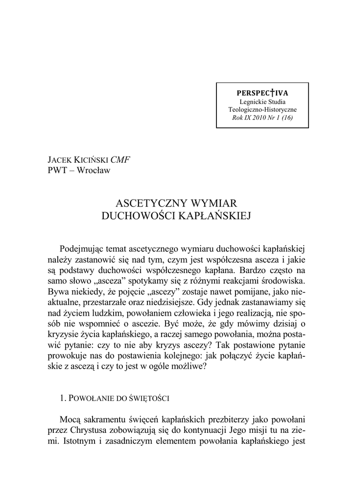 PERSPEC † IVA Legnickie Studia Teologiczno-Historyczne Rok IX 2010 Nr 1 (16) JACEK KICIŃSKI CMF PWT – Wrocław ASCETYCZNY WYMIAR DUCHOWOŚCI KAPŁAŃSKIEJ Podejmując temat ascetycznego wymiaru duchowości kapłańskiej należy zastanowić się nad tym, czym jest współczesna asceza i jakie są podstawy duchowości współczesnego kapłana. Bardzo często na samo słowo „asceza” spotykamy się z różnymi reakcjami środowiska. Bywa niekiedy, że pojęcie „ascezy” zostaje nawet pomijane, jako nieaktualne, przestarzałe oraz niedzisiejsze. Gdy jednak zastanawiamy się nad życiem ludzkim, powołaniem człowieka i jego realizacją, nie sposób nie wspomnieć o ascezie. Być może, że gdy mówimy dzisiaj o kryzysie życia kapłańskiego, a raczej samego powołania, można postawić pytanie: czy to nie aby kryzys ascezy? Tak postawione pytanie prowokuje nas do postawienia kolejnego: jak połączyć życie kapłańskie z ascezą i czy to jest w ogóle możliwe? 1. POWOŁANIE DO ŚWIĘTOŚCI Mocą sakramentu święceń kapłańskich prezbiterzy jako powołani przez Chrystusa zobowiązują się do kontynuacji Jego misji tu na ziemi. Istotnym i zasadniczym elementem powołania kapłańskiego jest 30 JACEK KICIŃSKI CMF nieustanne przyczynianie się do chwały Bożej, uświęcenia osobistego i zbawienia tych, którzy powierzeni są ich posłudze. Potwierdzenie tych słów znajdujemy w Dekrecie o posłudze i życiu kapłanów. Czytamy tam, że kapłani „już w konsekracji chrztu otrzymali, tak jak wszyscy chrześcijanie, znak i dar tak wielkiego powołania i łaski, aby nawet w słabości ludzkiej mogli i byli zobowiązani dążyć do doskonałości według słów Pana: «Bądźcie wy tedy doskonali, jako i Ojciec wasz niebieski doskonały jest» (Mt 5, 48)” (PO 12). Powołanie kapłańskie jest zatem drogą Chrystusowego powołania, który „wydał samego siebie, aby nas wykupić od wszelkiej nieprawości” (Tt 2, 14), wszedł przez mękę do swojej chwały. Konsekwencją tego jest świadomość osobistego namaszczenia i posłania przez samego Chrystusa. On zatem staje się wzorem w podejmowaniu wszelkich działań, by oddać się w pełni na służbę Bogu i ludziom (por. PO 12). Kościół od samego początku, świadom szczególnej godności jaką jest powołanie kapłańskie, zachęca prezbiterów, by z pomocą odpowiednich środków ascetycznych dążyli do osiągnięcia świętości, dzięki której mogą stać się skutecznym narzędziem w służbie całego ludu. Właściwą przestrzenią realizacji tego zadania staje się przede wszystkim wierne wypełnianie obowiązków w Duchu Chrystusowym. Jak podkreśla adhortacja apostolska Pastores dabo vobis, bez odpowiedniej formacji, zarówno w wymiarze ludzkim, duchowym, intelektualnym i pasterskim, realizacja powołania do świętości pozbawiona zostałaby fundamentu. Kapłan bowiem powołany do bycia żywym obrazem Jezusa Chrystusa, Głowy i Pasterza Kościoła, powinien starać się odtworzyć w sobie na miarę możliwości doskonałość samego Jezusa. Zadanie to jest możliwe do realizacji wówczas, gdy wewnętrzną zasadą ożywiającą i kierującą życiem duchowym kapłana będzie miłość. Należy zaznaczyć, że miłość ta winna być zakorzeniona w miłości samego Chrystusa. Określa ona sposób myślenia, działania oraz odnoszenia się do innych. Jest to zatem miłość wzrastająca i jednocześnie wymagająca (zob. PDV 23). 2. ASCEZA DROGĄ DO ŚWIĘTOŚCI – NOWE SPOJRZENIE Należy podkreślić, że realizacja powołania do świętości dokonuje się w określonych warunkach społeczno-kulturowych. Ponadto natura Ascetyczny wymiar duchowości kapłańskiej 31 ludzka jest zraniona i osłabiona konsekwencjami grzechu pierworodnego. Dotyczy to dwóch podstawowych wymiarów egzystencji każdego człowieka: wymiaru wertykalnego i horyzontalnego. Chodzi zatem o relację względem Boga i relację względem człowieka i świata. We wspomnianych wymiarach powstałe „pęknięcie” niesie z sobą konieczność nieustannego wysiłku celem przywrócenia właściwej harmonii w relacji do Boga, człowieka i świata. Poza tym i w samym człowieku nastąpiło poważne „rozdarcie”, którego skutkiem jest różne dążenie ciała i ducha. Zatem świadomość godności kapłańskiej oraz zadań z niej wynikających oraz powołania do świętości jest jedynie punktem wyjścia do podejmowania pracy nad sobą. W zaistniałej sytuacji przychodzi nam z pomocą podstawowe narzędzie, jakie daje Kościół w postaci ascezy chrześcijańskiej. Pojecie ascezy zawiera w sobie istotny element dynamiczny, którego przejawem jest prawo wzrostu. Jest to zatem nieustanny wysiłek człowieka związany z pracą nad sobą we współpracy z łaską Bożą celem zdobycia maksymalnej doskonałości, jaka jest możliwa do osiągnięcia w wymiarze ziemskiej egzystencji. Skądinąd należy wskazać, że asceza jest podstawowym środkiem umożliwiającym poznanie samego siebie, wskazującym na istotne kierunki pracy nad sobą. Minione czasy, a zwłaszcza do Soboru Watykańskiego II, charakteryzowały się promowaniem negatywnego wymiaru życia ascetycznego. Choć trzeba powiedzieć, że i dziś można to zauważyć w przepowiadaniu współczesnych „sług Ewangelii”. Tendencje te wiążą się z postawą nieustannego wyrzeczenia, umartwienia, ogołocenia. Była to swoistego rodzaju „teologia krzyża”. Wykładnikiem tak rozumianej ascezy były słowa: „Jeśli kto chce pójść za Mną (…) niech weźmie krzyż swój i niech Mnie naśladuje” (Mt 16, 24). Niestety zapomniano, że źródłem właściwie pojętej ascezy jest wymiar oblubieńczy – mistyczny, który wskazuje na relację miłości człowieka względem Boga. Bez tego wymiaru asceza staję się jedynie formą ćwiczeń prowadzących do tzw. poprawności zewnętrznej (zob. PDV 45). Akcentowano zatem środki, nie wskazując celu. Spróbujmy zatem wskazać na istotne elemen