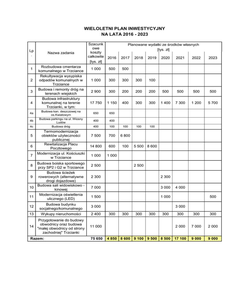 wieloletni plan inwestycyjny na lata 2016 - 2023