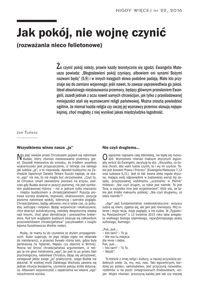 NIGDY WIĘCEJ nr 22, 2016 Jak pokój, nie wojnę czynić (rozważania nieco felietonowe) Że czynić pokój należy, prawie każdy teoretycznie się zgodzi. Ewangelia Mate- usza powiada: „Błogosławieni pokój czyniący, albowiem oni synami Bożymi nazwani będą” (5,9) i w innych księgach słowa podobne padają. Mało kto przyznaje się do zamiaru wojennego: jeśli nawet, to zawsze usprawiedliwia go jakoś. Ideał absolutnego niestosowania przemocy, będący głównym przesłaniem Ewangelii, zszedł jednak z oczu nawet samych chrześcijan, jak tylko z prześladowanej mniejszości stali się wyznawcami religii państwowej. Można zresztą powiedzieć ogólnie, że niemal każda religia czy raczej jej wyznawcy przemoc stosują najspokojniej, choć mogłaby z niej wynikać jakaś międzyludzka łagodność. J A N TU R N A U Wszystkiemu winne nasze „ja” Nie czyń drugiemu... N O a pięć wieków przed Chrystusem pojawił się natomiast Budda, który również niestosowanie przemocy głosił. Doszedł mianowicie do wniosku, że źródłem wszelkiej wojowniczości jest przypuszczenie, iż istnieje coś takiego jak ludzkie „ja”, a to nieprawda. Apostoł buddyzmu na Zachodzie Japończyk Daisetz Teitaro Suzuki napisał, że skoro „ego” nie ma, to nie mogło być ukrzyżowane. „Czyż to, że Chrystus umarł zawieszony pionowo na krzyżu, podczas gdy Budda skonał w pozycji poziomej, nie jest symbolem podstawowej różnicy – nie w jednym tylko znaczeniu – między buddyzmem a chrześcijaństwem? Pozycja pionowa wyraża działanie, bojowość, ekskluzywizm, pozycja pozioma natomiast spokój, tolerancję i szerokie poglądy. Chrześcijaństwo, będąc aktywne, ma w sobie coś, co pobudza, wstrząsa i niepokoi. Będąc wojownicze i ekskluzywne, chce dzierżyć autokratyczną, niekiedy despotyczną władzę nad innymi, choć głosi demokrację i powszechne braterstwo. Pod tym względem buddyzm okazuje się całkowitym przeciwieństwem chrześcijaństwa” (zacytowałem z książki Adama Szostkiewicza Wielkie nieba). Myślę, że mamy tu do czynienia ze stylem propagandowym. Autor sugeruje, że jego religia nigdy nie skłaniała do nietolerancji, a przecież bywało różnie tam, gdzie była państwową (w Tajlandii, Nepalu czy obecnie w Birmie). Można też bronić chrześcijaństwa argumentem, iż religia ta nie głosi nieistnienia „ego”, bo jest to po prostu fakt psychologiczny, natomiast Chrystus, dając się ukrzyżować, zanegował jakby swoje „ja” praktycznie, czego Budda nie dokonał. W wielkiej myśli Dalekiego Wschodu zawiera się jednak intuicja bezsporna, czynienia pokoju ściśle dotycząca. Albowiem wojowniczość z zapatrzenia we własne „ego” nieuchronnie wynika. egoizmie napisano całą bibliotekę, nie będę się rozwodził. Wymyślono również maksym etycznych legion: aby wrócić do Ewangelii, zacytuję tę oto: „Wszystko, co byście chcieli, aby wam ludzie czynili, to i wy im czyńcie. Takie jest bowiem Prawo i Prorocy” (Ewangelia Mateusza 7,12 oraz Łukasza 6,31). Jest to tak zwana złota reguła etyczna, mająca swój odpowiednik w żydowskiej wersji tej zasady, przypisywanej wybitnemu „uczonemu w Piśmie” Hillelowi: „Nie czyń drugim, co tobie jest niemiłe. To jest Tora, a wszystko inne jest wyjaśnieniem”. Któż wie, że takie jest źródło maksymy polskiej: „Nie czyń drugiemu, co tobie niemiłe”? „Ego” jest fundamentalnie niedemokratyczne: wszyscy ludzie są równi, zgadza się, ale jam jest równiejszy. Mój interes i moja racja, moje poglądy, a nie cudze. W „Tygodniku Powszechnym” z 12 kwietnia 2015 roku taka anegdota wielkiego teologa islamskiego, najwybitniejszego poety sufickiego, Rumiego: „Puk, puk... – Kto tam? – To ja. – Nie ma tu miejsca dla mnie i ciebie. Puk, puk... – Kto tam? – To Ty. – Wejdź”. To tekścik z innej religii i kultury, w naszej oczywiście podobnych wiele. Ja, my, moi, nasi. Taki egocentryzm, bardziej po polsku: samolubstwo, jest przyczyną rozwodów, rozłamów w na pozór zintegrowanych środowiskach, wojen. Wojen również: przyczyną każdej jest tak czy inaczej troska o to, żeby moje było na wierzchu. Nienawiść narodowa, rasowa, klasowa, chęć powiększenia własnego terytorium, zapędy imperialistyczne, urażona duma władców – wszystko to da się sprowadzić do wspólnego samolubczego mianownika. Rys. Witold Popiel NIGDY WIĘCEJ nr 22, 2016 Jak jednak z takimi postawami walczyć w sobie samym, w swojej wspólnocie? Oto trochę myśli instrukcyjnych. Sprawa podstawowa to psychologiczna „autoanaliza”, po prostu spojrzenie na siebie albo na swoją wspólnotę „w prawdzie”, przez okulary różu zupełnie pozbawione. Czy naprawdę kierują mną albo moją wspólnotą zupełnie czyste intencje? Czy gdy bronię jakichś obiektywnych racji, nie są one w gruncie rzeczy mocno subiektywne? Upieram się przy jakimś swoim pomyśle albo przeciw pomysłowi cudzemu w istocie nie dlatego, że jest mądry albo głupi, tylko dlatego, że jest mój albo cudzy. Egoizm jednak niejedno ma imię W szystko, co wyżej napisałem, to być może właściwie moralistyka, intelektualne truizmy. Niemniej Józef Wissarionowicz Stalin mawiał podobno, iż należy je powtarzać, więc może nie jestem najgorszy. Sprawy byłyby zresztą teoretycznie prostsze, gdyby nie to, że komplikuje je różnorodność ludzkiej natury. Bywają bowiem ludzie, którzy – jak ktoś ich określił – chowają się sami za siebie. Są niekonfliktowi, „cisi” do tego stopnia, że nie podejmą żadnych działań na rzecz czegokolwiek, nie wystąpią w obronie niczego czy nikogo. Siedzą cicho, gdy trzeba się odezwać albo wręcz działać. To na pewno nie jest dobre niestosowanie przemocy, bo nie chodzi w nim przecież o bierność. Ona też jest egoizmem, bo wynika z troski o własną skórę, o to, żeby się nie wychylić, bo można oberwać. Pojęcie wojny sprawiedliwej nie jest, co prawd