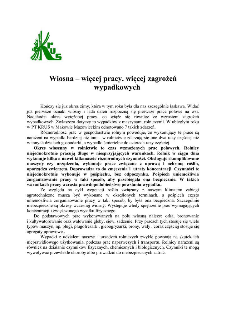 Wiosna – więcej pracy, więcej zagrożeń wypadkowych Kończy się już okres zimy, która w tym roku była dla nas szczególnie łaskawa. Widać już pierwsze oznaki wiosny i lada dzień rozpoczną się pierwsze prace polowe na wsi. Nadchodzi okres wytężonej pracy, co wiąże się również ze wzrostem zagrożeń wypadkowych. Zwłaszcza dotyczy to wypadków z maszynami rolniczymi. W ubiegłym roku w PT KRUS w Makowie Mazowieckim odnotowano 7 takich zdarzeń. Różnorodność prac w gospodarstwie rolnym powoduje, że wykonujący te prace są narażeni na wypadki bardziej niż inni - w rolnictwie zdarzają się one dwa razy częściej niż w innych działach gospodarki, a wypadki śmiertelne do czterech razy częściej. Okres wiosenny w rolnictwie to czas wzmożonych prac polowych. Rolnicy niejednokrotnie pracują długo w niesprzyjających warunkach. Rolnik w ciągu dnia wykonuje kilka a nawet kilkanaście różnorodnych czynności. Obsługuje skomplikowane maszyny czy urządzenia, wykonuje prace związane z uprawą i ochroną roślin, oporządza zwierzęta. Doprowadza to do zmęczenia i utraty koncentracji. Czynności te niejednokrotnie wykonuje w pośpiechu, bez odpoczynku. Pośpiech uniemożliwia zorganizowanie pracy w taki sposób, aby przebiegała ona bezpiecznie. W takich warunkach pracy wzrasta prawdopodobieństwo powstania wypadku. Ze względu na cykl wegetacji roślin związany z naszym klimatem zabiegi agrotechniczne musza być wykonane w określonych terminach, a pośpiech często uniemożliwia zorganizowanie pracy w taki sposób, by była ona bezpieczna. Szczególnie niebezpieczne są okresy wczesnej wiosny. Występuje wtedy spiętrzenie prac wymagających koncentracji i zwiększonego wysiłku fizycznego. Do podstawowych prac wykonywanych na polu wiosną należy: orka, bronowanie i kultywatorowanie oraz wałowanie gleby, siew, sadzenie. Przy pracach tych stosuje się wiele typów maszyn, np. pługi, pługofrezarki, glebogryzarki, brony, wały , coraz częściej stosuje się agregaty uprawowe . Wypadki z udziałem maszyn i urządzeń rolniczych zwykle powstają na skutek ich nieprawidłowego użytkowania, podczas prac naprawczych i transportu. Rolnicy narażeni są również na działanie czynników fizycznych, chemicznych i biologicznych. Czynniki te mogą wywoływać przewlekłe choroby albo prowadzić do niebezpiecznych zatruć. Podczas wykonywania wiosennych prac polowych należy pamiętać o podstawowych zasadach bezpieczeństwa. sprawdzić stan techniczny użytkowanych maszyn; układ kierowniczy, układ hamulcowy, ogumienie, światła, sygnał dźwiękowy, układ zawieszenia narzędzi i zaczepu transportowego i usunąć stwierdzone usterki przed rozpoczęciem użytkowania danej maszyny. Wszelkie naprawy, czyszczenie części lub zespołów roboczych sprzętu rolniczego dopuszczalne są po uprzednim unieruchomieniu silnika i wyłączeniu wszystkich napędzanych zespołów tego sprzętu; sprawdzić czy użytkowane maszyny mają osłony na przekładniach: zębatych, łańcuchowych, pasowych, klinowych oraz na wystających, obracających się podczas pracy wałach; sprawdzić czy wały przegubowo-teleskopowe na całej długości mają osłonę zabezpieczającą; w przypadku ich braku zamontować je; należy wyposażyć zaczep przyczepy w sprężynę odciążającą lub podporę oraz sworzeń zabezpieczający przed wypadnięciem; przy agregowaniu ciągnika z maszynami unikać udziału drugiej osoby; gdy ta czynność wykonywana jest zespołowo, należy zachować szczególną ostrożność przy sprzęganiu ciągnika ze sprzętem współpracującym; niedopuszczalne jest przebywanie osób miedzy ciągnikiem a współpracującą maszyna, oraz w strefie działania zespołu roboczego maszyn aktywnych; nie podejmować pracy na maszynach w stanie nietrzeźwym i nie pracować w zbyt luźnym ubraniu; nie należy stawać lub siadać na ramach narzędzi zawieszanych lub doczepianych do ciągnika, nie przewozić ludzi na błotniku ciągnika, dyszlach, zaczepach, burtach przyczep, pomostach siewnika i podeście sadzarki; unikać przewożenia osób na przyczepie nie wyposażonej w siedziska; nie pozwalać aby w pobliżu maszyn przebywały dzieci; podczas przerw w pracy wyłączać napęd z ciągnika na maszynę; napraw sprzętu zawieszonego na ciągniku dokonywać po jego opuszczeniu na podłoże; przy zawieszaniu ciężkich maszyn uprawowych (siewniki, sadzarki, pługi wieloskibowe) należy stosować obciążniki na przednią oś ciągnika w celu zapewnienia równowagi agregatu; podczas prac glebogryzarek, bron aktywnych i kosiarek rotacyjnych należy osłonić ruchome zespoły robocze oraz nie dopuszczać na małą odległość osób postronnych; osoby pracujące przy wysiewie nawozów mineralnych bezwzględnie powinny stosować pyłoszczelne kombinezony, gumowe buty, rękawice, okulary ochronne i półmaski z wkładami przeciwpyłowymi; rozrzutnik obornika powinien być wyposażony w siatkę umieszczona na przedniej burcie skrzyni ładunkowej zabezpieczającą operatora ciągnika przed ewentualnym uderzeniem twardym materiałem w czasie pracy rozrzutnika. W czasie pracy rozrzutnika niedopuszczalne jest: - czyszczenie wnętrza skrzyni roztrząsacza w czasie ruchu przenośnika podłogowego; - uruchamianie adaptera rozrzutu, jeśli w strefie jego działania przebywają osoby postronne; wsypywanie nasion do skrzyni nasiennej powinno odbywać się na postoju przy wyłączonym napędzie; nie przegarniać ziarna w skrzyni nasiennej siewnika, Bezpieczeństwo pracy podczas siewu zależy od stanu technicznego siewników i agregatów wysiewających, stosowania środków ochrony indywidualnej / rękawic, kombinezonów ochronnych, półmasek/, przeprowadzenia próby wysiewu; zabroniona jest: praca siewnikiem na pochyłościach większych niż 120, - transport siewnika z napełniona ziarnem skrzynia nasienna oraz przewożenie na niej ludzi, -przegarnianie ręką nasion w skrzyni nasiennej / przeg