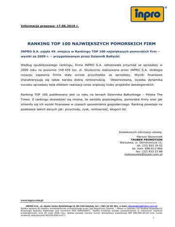 Informacja prasowa: 17.06.2010 r. RANKING TOP 100 NAJWIĘKSZYCH POMORSKICH FIRM INPRO S.A. zajęła 49. miejsce w Rankingu TOP 100 największych pomorskich firm – wyniki za 2009 r. – przygotowanym przez Dziennik Bałtycki. Według opublikowanego rankingu, firma INPRO S.A. odnotowała przychód ze sprzedaży w 2009 roku na poziomie 148 459 tys. zł. Skutecznie realizowana przez INPRO S.A. strategia rozwoju zapewnia firmie stały wzrost przychodów charakteryzują się także bardzo dobrą rentownością. ze sprzedaży. Wyniki finansowe Obserwowana, wysoka dynamika wzrostu sprzedaży była efektem realizacji coraz większej liczby projektów deweloperskich. Ranking TOP 100 publikowany jest co roku na łamach Dziennika Bałtyckiego – Polska The Times. Z rankingu dowiedzieć się można, ile zarobiły poszczególne, pomorskie firmy oraz jak zmieniły się ich wyniki finansowe w czasach spowolnienia gospodarczego. Ranking powstaje na podstawie takich danych jak: przychody, zysk, rentowność, eksport itd. Dodatkowych informacji udzielą: Mariusz Skowronek TAUBER PROMOTION Warszawa, ul. Gombrowicza 15, tel. (22) 833 35 02 tel. kom. 698-612-866 fax: (22) 833 23 88 [email protected] www.inpro.com.pl INPRO S.A., ul. Opata Jacka Rybińskiego 8, 80-320 Gdańsk, tel.: (58) 34 00 381, e-mail: [email protected] Spółka wpisana do rejestru przedsiębiorców prowadzonego przez Sąd Rejestrowy Gdańsk – Północ w Gdańsku VII Wydział Gospodarczy Krajowego Rejestru Sądowego pod numerem KRS 0000306071. Spółka Emitenta została zarejestrowana w rzeczonym rejestrze przedsiębiorców dnia 29 maja 2008 roku. Spółka posiada również numer identyfikacji podatkowej NIP 589-000-85-40 oraz numer ewidencji statystycznej REGON 008141071. 1