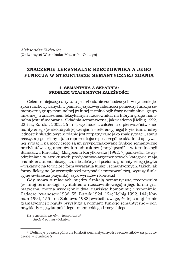 Aleksander Kiklewicz (Uniwersytet Warmińsko-Mazurski, Olsztyn) ZNACZENIE LEKSYKALNE RZECZOWNIKA A JEGO FUNKCJA W STRUKTURZE SEMANTYCZNEJ ZDANIA 1. SEMANTYKA A SKŁADNIA: PROBLEM WZAJEMNYCH ZALEŻNOŚCI Celem niniejszego artykułu jest zbadanie zachodzących w systemie języka i zachowywanych w pamięci językowej zależności pomiędzy funkcją semantyczną grupy nominalnej (w innej terminologii: frazy nominalnej, grupy imiennej) a znaczeniem leksykalnym rzeczownika, na którym grupa nominalna jest ufundowana. Składnia semantyczna, jak wiadomo [Helbig 1992, 22 i n.; Karolak 2002, 26 i n.], wychodzi z założenia o pierwszeństwie semantycznego (w niektórych jej wersjach – referencyjnego) kryterium analizy jednostek składniowych: zdanie jest rozpatrywane jako znak sytuacji, stanu rzeczy, a jego człony – jako reprezentujące poszczególne składniki opisywanej sytuacji, na mocy czego są im przyporządkowane funkcje semantyczne predykatów, argumentów lub adiunktów („przyłączeń” – w terminologii Stanisława Karolaka). Małgorzata Korytkowska [1992, 7] podkreśla, że wyodrębniane w strukturach predykatowo-argumentowych kategorie mają charakter autonomiczny, tzn. niezależny od poziomu gramatycznego języka – wskazuje na to wielość form wyrażania funkcji semantycznych, takich jak formy fleksyjne (w szczególności przypadek rzeczowników), wyrazy funkcyjne (zwłaszcza przyimki), szyk wyrazów i kontekst. Gdy mowa o relacjach między funkcją semantyczną rzeczownika (w innej terminologii: syntaktemu rzeczownikowego) a jego formą gramatyczną, można wyodrębnić dwa zjawiska: homonimię i synonimię. Badacze [Awanesow 1936, 55; Buzuk 1924, 124; Helbig 1992, 144; Norman 1994, 155 i n.; Zołotowa 1988] zwrócili uwagę, że tej samej formie gramatycznej z reguły przysługują rozmaite funkcje semantyczne – por. przykłady z języka polskiego, niemieckiego i rosyjskiego: (1) pozostała po nim – temporatyw1 chodzić po nim – lokatyw 1 Definicje poszczególnych funkcji semantycznych rzeczowników są przytoczone w punkcie 2. ZNACZENIE LEKSYKALNE RZECZOWNIKA A JEGO FUNKCJA... 65 spodziewają się po nim – subiekt rozpaczać po nim – obiekt/kauzatyw (2) die Ausstellung des Grafikers – subiekt die Ausstellung der Grafiken – obiekt (3) за городом – lokatyw (бежать) за повозкой – dyrektyw за обедом – temporatyw за длинным рублем – finityw за недостатком улик – kauzatyw за подписью министра – komitatyw W tym wypadku mamy do czynienia ze zjawiskiem h o m o n i m i i s k ł a d n i o w e j form gramatycznych. Z drugiej strony, istnieje zjawisko s y n o n i m i i s k ł a d n i o w e j, polegające na tym, że język dysponuje rejestrem środków wyrażania tej samej funkcji semantycznej.2 Na przykład B. J. Norman [1994, 155] pisze, że w języku rosyjskim funkcja instrumentu może zostać wyrażona za pomocą rzeczownika w dopełniaczu, bierniku, celowniku, narzędniku, mianowniku, formą z przyimkiem lub bez niego: (4) ИНСТРУМЕНТ: открыть дверь к л ю ч о м вскрыть банку п о с р е д с т в о м н о ж а он проник в гримерную б л а г о д а р я с в о е й н а с т о й ч и в о с т и к л ю ч легко открыл дверь настойку готовят с с а х а р о м он всего добился ч е р е з с в я з и i in. B. J. Norman [ibidem, 157 i n.] słusznie zwraca uwagę na to, że przyporządkowane tej samej funkcji semantycznej formy gramatyczne nie są równorzędne: można wśród nich wyodrębnić takie, które prezentują dane znaczenie w sposób najbardziej wyrazisty, niezależny od kontekstu. Na przykład narzędnik jest najbardziej regularną, typową formą wyrażania funkcji instrumentu, podczas gdy inne formy w większym lub mniejszym stopniu wymagają „wsparcia” kontekstu, współudziału znaczenia leksykalnego wyrazu. W gramatyce funkcjonalnej formy gramatyczne realizujące dane znaczenie w sposób najbardziej regularny stanowią centrum pola funkcjonalno-semantycznego, a formy okazjonalne, kontekstowo uwarunkowane – jego strefę peryferyjną. Na przykład w języku niemieckim (podobnie jak w polskim) argument propozycjonalny przy predykatach stanów mentalnych może być realizowany w formie zdania lub składnika (syntaktemu): (5) Er findet, dass das Buch gut ist ‘Uważa, że że książka jest dobra’. (6) Er findet das Buch gut ‘Uważa książkę za dobrą / Dobrze ocenia książkę’. Pierwszą formę należy uznać za podstawową, gdyż struktura propozycjonalna tego argumentu została w zdaniu (5) wyrażona w sposób 2 To założenie leży u podstaw m.in. gramatyki funkcjonalnej w wersji badaczy rosyjskich i niemieckich [Bondarko 1983, 40; Sommerfeldt, Starke 1984, 21]. ALEKSANDER KIKLEWICZ 66 najbardziej eksplicytny. Sprowadzenie zaś całego zdania podrzędnego do syntaktemu przymiotnikowego gut ‘dobry’ stanowi rezultat derywacji, a mianowicie kompresji formy podstawowej. Stawiane w tej pracy zadanie badawcze będzie dotyczyło tego rodzaju r e l e w a n c j i f u n k c j o n a l n e j, z tą jednak różnicą, że tym razem mowa będzie o szczególnym typie form – o formach l e k s y k a l n y c h. Znaczenie leksykalne rzeczownika jest jednym z kilku czynników, które determinują jego funkcję (czy też pozycję) w strukturze predykatowo-argumentowej. Typ znaczenia leksykalnego rzeczownika czasem stanowi element definicji funkcji argumentowej, jak to obserwujemy np. w wypadku funkcji eksperiencera. M. Korytkowska [1992, 46] pisze, że grupom wyrazowym występującym w tej „pozycji argumentowej” przysługuje wspólna cecha semantyczna, jaką jest <żywotność> albo <osobowość>. Występowanie w pozycji eksperiencera rzeczownika o innym znaczeniu leksykalnym możliwe jest jedynie w wypadku użyć 