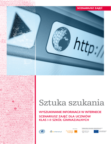 ©jamdesign - Fotolia.com SCENARIUSZ ZAJĘĆ Sztuka szukania WYSZUKIWANIE INFORMACJI W INTERNECIE SCENARIUSZ ZAJĘĆ DLA UCZNIÓW KLAS I-II SZKÓŁ GIMNAZJALNYCH Główny Partner Publikacja powstała w ramach projektu „Trening kompetencji cyfrowych” współfinansowanego przez Ministerstwo Administracji i Cyfryzacji. Projekt współfinansowany przez Unię Europejską Sztuka szukania Wyszukiwanie informacji w internecie – scenariusz zajęć 1. Wstęp Dla młodych ludzi, często określanych mianem cyfrowych tubylców, internet to przestrzeń, w której dorastają i w której czują się komfortowo i swobodnie. W sieci realizują swoje pasje, nawiązują i kultywują relacje, budują swoją tożsamość. Internet jest też dla nich podstawowym źródłem informacji − zarówno tych niezbędnych do szkoły, jak i tych, które pozwalają im rozwijać zainteresowania czy też po prostu zaspokajają ich ciekawość. Wobec ciągle rosnącej ilości dostępnych stron internetowych, oraz wobec faktu, że w sieci na dowolny temat publikować może praktycznie każdy, niezależnie od posiadanej w danym obszarze wiedzy, umiejętności skutecznego wyszukiwania informacji, świadomego ich oceniania oraz weryfikowania znalezionych treści są kluczowe. Mają wpływ nie tylko na jakość funkcjonowania w wielu obszarach życia, ale są również niezbędne do pełnego i aktywnego uczestnictwa w życiu społecznym i szkolnym (a następnie − zawodowym). Scenariusz „Sztuka szukania” to kolejna propozycja edukacyjna dla młodzieży opracowana przez Fundację Dzieci Niczyje w ramach programu Dziecko w Sieci. W trakcie spotkania uczniowie poznają i testują skuteczne sposoby wyszukiwania informacji w internecie oraz uczą się oceniać wiarygodność znalezionych treści i weryfikować je. 2 Charakterystyka zajęć Odbiorcy Zajęcia przeznaczone są dla uczniów w wieku 13-14 lat. Mogą być realizowane podczas godziny wychowawczej, lekcji informatyki lub zajęć pozalekcyjnych. Cele: pokazanie różnych metod wyszukiwania informacji prezentacja zaawansowanych sposobów wyszukiwania informacji zapoznanie uczestników ze sposobami weryfikacji internetowych treści Czas zajęć: Zajęcia przewidziane są na jedną godzinę dydaktyczną (45 minut) z możliwością ich wydłużenia (w tekście zaznaczono aktywności, którym można poświęcić więcej uwagi w miarę dostępnego czasu). Prowadzenie zajęć: Zajęcia zostały stworzone z myślą o nauczycielach, pedagogach i innych osobach, które w swojej codziennej pracy mają kontakt z dziećmi w wieku 13-14 lat. Lekcje mogą być również prowadzone przez studentów pedagogiki lub psychologii. Wymagana wiedza: Prowadzący zajęcia powinien posiadać podstawowe informacje dotyczące korzystania z internetu, działania wyszukiwarek oraz wyszukiwania informacji. Wymagany sprzęt: Nauczyciel prowadzi zajęcia z wykorzystaniem komputera podłączonego do rzutnika albo tablicy interaktywnej zapraszając do kolejnych zadań wybranych uczniów. W miarę możliwości rekomendowane jest wykorzystanie większej ilości stanowisk komputerowych dostępnych (indywidualnie lub w grupach) dla uczniów. Nauczyciel może przeprowadzić zajęcia, prezentując kolejne aktywności na swoim komputerze i wyświetlając wyniki dla klasy, ale rekomendowaną formą zajęć jest sytuacja, gdy uczniowie również mają dostęp do stanowisk komputerowych (pojedynczo albo w parach). Ewaluacja, zgłoszenie zajęć i zaświadczenie dla prowadzącego: Na zakończenie zajęć nauczyciele rozdają uczniom anonimową ankietę ewaluacyjną i proszą o jej wypełnienie (wzór ankiety na str. 7); można ją również pobrać z serwisu www.dzieckowsieci.fdn.pl. Przeprowadzenie ankiety nie jest obligatoryjne, ale pozwala zarówno prowadzącym zajęcia, jak i autorom programu na zdobycie informacji dotyczących odbioru scenariusza zajęć przez ich uczestników i jego ewentualną modyfikację. Po przeprowadzeniu wszystkich zaplanowanych zajęć prowadzący wypełnia formularz na stronie www.dzieckowsieci.fdn.pl/sprawozdanie (dostępny również w dziale „Materiały edukacyjne”). Na jego podstawie prowadzący otrzymuje e-mailem zaświadczenie o przeprowadzeniu zajęć, przydatne w dokumentowaniu rozwoju zawodowego. 3 Scenariusz zajęć Przebieg spotkania I. JAK POSZUKUJEMY INFORMACJI W SIECI (8 MIN) Jeszcze nie tak dawno informacji poszukiwało się zupełnie inaczej niż dzisiaj – w encyklopediach i książkach w domu lub bibliotece, pytając znajomych czy dzwoniąc pod specjalny numer informacji telefonicznej. Takie poszukiwania trwały czasem długo i nie zawsze kończyły się pełnym sukcesem. Dostęp do informacji był ograniczony. Nauczyciel może uzupełnić wstęp własnymi doświadczeniami i wspomnieniami. Wszystko się zmieniło od czasu, kiedy pojawił się internet. Obecnie poszukiwanie jakichkolwiek informacji zaczynamy właśnie od sieci. Nauczyciel pyta uczniów, jakich treści najczęściej poszukują w internecie i z jakich serwisów korzystają. Wymieniane nazwy i rodzaje serwisów zapisuje na tablicy albo flipcharcie. Ważne, żeby w wynikach pojawiły się: Wyszukiwarki (google, bing, onet.pl), encyklopedie online (Wikipedia, encyklopedia PWN), serwisy informacyjne (tvn24, gazeta.pl), słowniki online, blogi, fora internetowe, You Tube (informacje w formie video). II. JAK SKUTECZNIE KORZYSTAĆ Z WYSZUKIWAREK (MIN. 20 MIN) Internet zapewnia nam dostęp do informacji. Natomiast skuteczne wyszukiwanie tego, co nas interesuje, to czasami prawdziwa sztuka. Internet bowiem to ponad 60 bilionów stron (stan na listopad 2013) i liczba ta ciągle rośnie. Jako pomoc w wyszukiwaniu informacji i jak najszybszym docieraniu do interesujących nas treści nieocenione są tzw. wyszukiwarki. Nauczyciel odwołuje się do wyników poprzedniego ćwiczenia i podkreśla, że najpopularniejszą w Polsce i na świecie wyszukiwarką jest wyszukiwarka Google. Nauczyciel uruchamia wyszuk