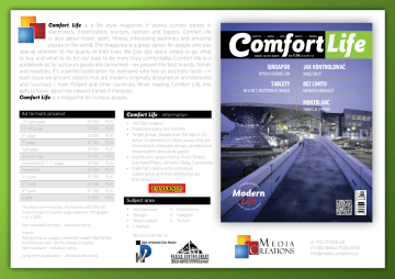 23 000 PLN 7th page 22 100 PLN half-page 16 700 PLN quarter-page 13 900 PLN Centerfold (2nd + 1st page) 29 400 PLN Centerfold 24 400 PLN 25 300 PLN 3rd cover 23 400 PLN 4 cover 27 100 PLN Z-gate 47 000 PLN Inserts Standard (up to 4 pages, maximum weight 35g/0,07lbs): PLN 0.5/item net – for the whole circulation Non-standard – individual rating Long-term cooperation – attractive discounts Architecture Design Motorization Lifestyle AGA Z Y N E • Electronics • Gadgets • Turism WAGĘ CIAŁA? BEZ LIMITU MAYBACH LANDAULET M Modern Life O Non-standard formats – individual rating • • • • ZM •D The above are net prizes. You have to add 23% VAT. Extra charge for custom page selection 10% (pages 1-22 + 30%) • 140 000 readers • Published every two months • Target group: people over the age of 25, active inhabitants of urban areas, who are interested in lifestyles, design, architecture, motorization and luxury goods • Distribution: press rooms, Ruch, Empik, Garmond Press, Inmedio, Relay, Castorama • trade fairs and events, individual subscription and free distribution by Emmerson. Subject area JAK KONTROLOWAĆ • 2 cover PODRÓŻE TRADYCJA I PIĘKNO • 5th page • MONTBLANC • PLN th TABLETY NY 19 500 GADŻETY CENA 11,90 zł (w tym 8% vat) OD A DO Z, WSZYSTKO W TEMACIE AL 1/1 left page • SINGAPUR SPECJ PLN • MOTO WYSPA O GŁOWIE LWA TEK DA 20 900 DESIGN KWIECIEŃ - MAJ 2013 NUMER 1 Comfort Life - information 1/1 right page nd • INDEKS 000000 Ad formats pricelist Comfort Life LIFESTYLE ISSN 2299-5471 Comfort Life is a life style magazine. It shows current trends in electronics, motorization, tourism, fashion and liquors. Comfort life is also about travel, sport, fitness, interesting pastimes and amazing places in the world. The magazine is a great option for people who pay special attention to the quality of their lives. We give tips about where to go, what to buy and what to do for our lives to be more truly comfortable. Comfort life is a guidebook as far as luxury goods are concerned – we present the best brands, trends and novelties. It’s a perfect publication for everyone who has an aesthetic taste – in each issue we present objects that are modern, originally designed or architectured and luxurious – from Poland and other countries. While reading Comfort Life, one gets to know about the newest trends if lifestyles. Comfort Life is a magazine for curious people. We are a member of: IZBA WYDAWCÓW PRASY ul. POCZTOWA 2B 21-500 BIAŁA PODLASKA [email protected]