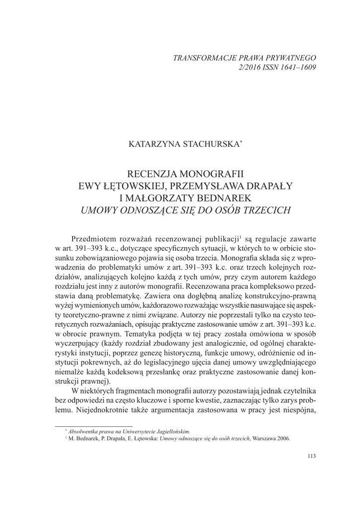 Transformacje Prawa Prywatnego 2/2016 ISSN 1641–1609 Katarzyna Stachurska* recenzja monografii EWy Łętowskiej, Przemysława Drapały i Małgorzaty Bednarek Umowy odnoszące się do osób trzecich Przedmiotem rozważań recenzowanej publikacji są regulacje zawarte w art. 391–393 k.c., dotyczące specyficznych sytuacji, w których to w orbicie stosunku zobowiązaniowego pojawia się osoba trzecia. Monografia składa się z wprowadzenia do problematyki umów z art. 391–393 k.c. oraz trzech kolejnych roz działów, analizujących kolejno każdą z tych umów, przy czym autorem każdego rozdziału jest inny z autorów monografii. Recenzowana praca kompleksowo przedstawia daną problematykę. Zawiera ona dogłębną analizę konstrukcyjno-prawną wyżej wymienionych umów, każdorazowo rozważając wszystkie nasuwające się aspekty teoretyczno-prawne z nimi związane. Autorzy nie poprzestali tylko na czysto teoretycznych rozważaniach, opisując praktyczne zastosowanie umów z art. 391–393 k.c. w obrocie prawnym. Tematyka podjęta w tej pracy została omówiona w sposób wyczerpujący (każdy rozdział zbudowany jest analogicznie, od ogólnej charakte rystyki instytucji, poprzez genezę historyczną, funkcje umowy, odróżnienie od instytucji pokrewnych, aż do legislacyjnego ujęcia danej umowy uwzględniającego niemalże każdą kodeksową przesłankę oraz praktyczne zastosowanie danej konstrukcji prawnej). W niektórych fragmentach monografii autorzy pozostawiają jednak czytelnika bez odpowiedzi na często kluczowe i sporne kwestie, zaznaczając tylko zarys problemu. Niejednokrotnie także argumentacja zastosowana w pracy jest niespójna, * Absolwentka prawa na Uniwersytecie Jagiellońskim. M. Bednarek, P. Drapała, E. Łętowska: Umowy odnoszące się do osób trzecich, Warszawa 2006. 113 Transformacje Prawa Prywatnego 2/2016 sprzeczna z poprzednimi lub co najmniej sporna. Dlatego też, mimo że opisywaną monografię ocenić należy pozytywnie, w niniejszej recenzji przedstawione zostaną przede wszystkim te jej elementy, które są niespójne, sprzeczne lub sporne. Publikacja rozpoczyna się od ogólnej charakterystyki umów z art. 391–393 k.c., jako „umów o umowach”, nienakładających obowiązków na osoby trzecie, których umowa dotyczy, a które nie były jej stroną. Niejako „spinają one ze sobą” kilka stosunków prawnych. Główną zasadą prawa zobowiązań, która leży u podstaw interpretacji i zastosowania konstrukcji prawnych z art. 391–393 k.c., jest zasada względnego charakteru stosunku zobowiązaniowego — alteri stipulari nemo potest (nikt nie może zobowiązać się ze skutkiem dla kogoś innego). W niniejszej monografii przywołane zostało pierwotne, bardzo rygorystyczne rozumienie tej zasady, które widziało w niej przeszkodę nawet do wykształcenia się instytucji pełnomocnictwa. Jednak tak rygorystyczne jej rozumienie zostało zanegowane, nie rozważając immamentnej cechy konstrukcji pełnomocnictwa, które z samej swej istoty nie może naruszyć zasady alteri stipulari nemo potest. Pełnomocnictwo bowiem to „działalność w imieniu i na rachunek” mocodawcy, a więc „tak jakby” działał sam mocodawca, nie zachodzi zatem problem zobowiązania ze skutkiem dla kogoś innego. Pierwszy rozdział charakteryzuje konstrukcję prawną z art. 391 k.c., czyli umowę o świadczenie przez osobę trzecią. Autorka neguje stanowisko P. Machnikowskiego wyrażone w komentarzu do kodeksu cywilnego, jakoby umowa z art. 391 k.c. powodowała zniesienie obowiązku świadczenia przez dotychczasowego dłużnika. Dotychczasowy dłużnik pozostaje nadal zobowiązany, zobowiązanie nie przechodzi na osobę trzecią. Natomiast skutek, jaki wywołuje ta umowa, to zobowiązanie odszkodowawcze (gwarancyjne) przyrzekającego, że osoba trzecia spełni świadczenie. Wskutek tej umowy nie powstaje stosunek trójstronny czy chociażby przystąpienie osoby trzeciej do długu. W monografii wskazuje się na dwie możliwe interpretacje istoty art. 391 k.c., opowiadając się za jedną z nich. Instytucję tę można traktować jako instytucję wzbogacającą modalność stosunku podstawowego, poprzez dookreślenie wykonawcy świadczenia. Umowa ta nie kreuje natomiast praw/obowiązków przyrzekającego. Odmienną interpretacją, za którą opowiada się autorka, jest potraktowanie tej instytucji jako konstrukcyjnie samodzielnej umowy, kreującej prawa i obowiązki stron. Autorka opowiada się za tym właśnie poglądem, argumentując, że dłużnik niemalże zawsze może posłużyć się inną osobą przy spełnieniu świadczenia (oprócz sytuacji przewidzianych w art. 356 § 1 k.c.) oraz faktem powstania odpowiedzialności odszkodowawczej po stronie przyrzekającego, której nie da się pogodzić z czysto legitymującym charakterem tego przyrzeczenia. Nie wykluczona zostaje możliwość, gdy przyrzekający sam jest dłużnikiem z umowy podstawowej, a nawet dokonanie tego uno actu (a więc zaciągnięcie zobowiązania, w którym zastrzega się spełnienie go przez osobę trzecią). Skutkiem 114 P. Machnikowski: Kodeks cywilny. Komentarz, pod red. E. Gniewka, Warszawa 2006, t. I, s. 945. Recenzja jest wtedy zaostrzenie odpowiedzialności w stosunku do ustawowych zasad (art. 471 i 474 k.c.). Zgadzam się z autorką, że pierwsza z koncepcji, z przytoczonych przez nią argumentów jest nietrafna. Odpowiedzialność odszkodowawcza przyrzekającego, której podstawą jest art. 391 k.c., świadczy o tym, że ustawodawca za pomocą tej normy zamierzał wykreować prawa i obowiązki stron. Mając na uwadze także postulat racjonalnego ustawodawcy, za nietrafny należy uznać pogląd traktujący figurę prawną z art. 391 k.c. tylko jako instytucję wzbogacającą modalność stosunku podstawowego, poprzez dookreślenie wykonawcy świadczenia. Byłoby to suferfluum w stosunku do art. 356 § 1 k.c. Natomiast pogląd autorki, że umowa z art. 391 k.c. jest samodzielną umo
