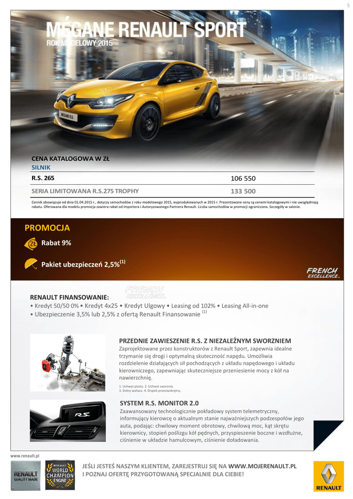 5 CENA KATALOGOWA W ZŁ SILNIK R.S. 265 106 550 SERIA LIMITOWANA R.S.275 TROPHY 133 500 Cennik obowiązuje od dnia 01.04.2015 r., dotyczy samochodów z roku modelowego 2015, wyprodukowanych w 2015 r. Prezentowane ceny są cenami katalogowymi i nie uwzględniają rabatu. Oferowana dla modelu promocja zawiera rabat od Importera i Autoryzowanego Partnera Renault. Liczba samochodów w promocji ograniczona. Szczegóły w salonie. PROMOCJA Rabat 9% Pakiet ubezpieczeń 2,5%(1) RENAULT FINANSOWANIE: • Kredyt 50/50 0% • Kredyt 4x25 • Kredyt Ulgowy • Leasing od 102% • Leasing All-in-one • Ubezpieczenie 3,5% lub 2,5% z ofertą Renault Finansowanie (1) PRZEDNIE ZAWIESZENIE R.S. Z NIEZALEŻNYM SWORZNIEM Zaprojektowane przez konstruktorów z Renault Sport, zapewnia idealne trzymanie się drogi i optymalną skuteczność napędu. Umożliwia rozdzielenie działających sił pochodzących z układu napędowego i układu kierowniczego, zapewniając skuteczniejsze przeniesienie mocy z kół na nawierzchnię. 1. Uchwyt piasty. 2. Uchwyt sworznia. 3. Dolny wahacz. 4. Drążek przeciwskrętny. SYSTEM R.S. MONITOR 2.0 Zaawansowany technologicznie pokładowy system telemetryczny, informujący kierowcę o aktualnym stanie najważniejszych podzespołów jego auta, podając: chwilowy moment obrotowy, chwilową moc, kąt skrętu kierownicy, stopień poślizgu kół pędnych, przyspieszenie boczne i wzdłużne, ciśnienie w układzie hamulcowym, ciśnienie doładowania. JEŚLI JESTEŚ NASZYM KLIENTEM, ZAREJESTRUJ SIĘ NA WWW.MOJERENAULT.PL I POZNAJ OFERTĘ PRZYGOTOWANĄ SPECJALNIE DLA CIEBIE! RENAULT MEGANE R.S. SERIA LIMITOWANA 275 TROPHY OGRANICZONA LICZBA EGZEMPLARZY ! GŁÓWNE WYPOSAŻENIE SERII LIMITOWANEJ R.S. 275 TROPHY = wersja R.S. 265 + zawieszenie Cup samoblokujący mechanizm różnicowy ® przednie zaciski hamulcowe Brembo w kolorze czerwonym tytanowy układ wydechowy firmy Akrapovič, z karbonową końcówką obręcze kół ze stopu metali lekkich 18’’ wzór Tibor 23, czarny mat opony Pilot Sport 2 235/40 R18 firmy Michelin system R.S. Monitor klimatyzacja automatyczna, dwustrefowa wycieraczki przedniej szyby o zmiennej częstotliwości pracy, z czujnikiem deszczu karta Renault Hands Free elektrycznie sterowane i składane lusterka boczne ® radioodtwarzacz R-Plug&Radio+ 3D Sound by Arkamys koło zapasowe dojazdowe specyficzne, charakterystyczne wyłącznie dla tej serii limitowanej elementy designu zewnętrznego i wewnętrznego, m.in. − specjalne oznakowanie „Trophy” na przedniej, aerodynamicznej listwie typu F1 − oznakowanie „Trophy” na bokach nadwozia oraz motyw szachownicy przy dolnych krawędziach drzwi przednich − numerowane nakładki na progi drzwi ® − fotele kubełkowe Recaro z tapicerką skórzaną łączoną z alcantarą i elementami skóry ekologicznej − kierownica pokryta alcantarą, z czerwonymi przeszyciami − sportowa gałka dźwigni zmiany biegów WYPOSAŻENIE R.S. 265 ZAWIESZENIE I UKŁAD JEZDNY Za wi es zeni e Rena ul t Sport (za wi es zeni e pods ta wowe) ● Za wi es zeni e Cup P Sa mobl okujący mecha ni zm różni cowy P ® Przedni e za ci s ki ha mul cowe 4-tłoczkowe Brembo / w kol orze czerwonym ●/P PROWADZENIE POJAZDU - URZĄDZENIA KONTROLNE El ektryczne ws poma ga ni e ukła du ki erowni czego ● Specja l ny zes pół zega rów i ws ka źni ków z a na l ogowym prędkoś ci omi erzem i obrotomi erzem (tło obrotomi erza w kol orze s za rym) ● Ręczny ha mul ec pos tojowy ● Ka rta Rena ul t ze zda l nym s terowa ni em centra l nego za mka drzwi Ka rta Rena ul t Ha nds Free Sys tem ws poma ga ni a pa rkowa ni a tyłem Sys tem ws poma ga ni a pa rkowa ni a tyłem, z ka merą cofa ni a ● 1 060 / P ● 1 200 / P Sys tem R.S. Moni tor 1 060 Sys tem R.S. Moni tor 2.0 1 060 BEZPIECZEŃSTWO CZYNNE I BIERNE ABS z s ys temem ws poma ga ni a na głego ha mowa ni a (AFU) ● Sys tem dyna mi cznej kontrol i toru ja zdy (ESC) o 3 tryba ch pra cy ● Regul a tor-ogra ni czni k prędkoś ci ● Sys tem kontrol i ci ś ni eni a w opona ch ● Czołowe podus zki powi etrzne ki erowcy i pa s a żera dos tos owujące s i ę do s i ły zderzeni a ● Możl i woś ć ręcznej deza ktywa cji podus zki powi etrznej pa s a żera z przodu ● Boczne podus zki powi etrzne chroni ące kl a tkę pi ers i ową i mi edni cę ● Podus zki kurtynowe ● Sygna l i za cja ni eza pi ęci a pa s a bezpi eczeńs twa na mi ejs cu ki erowcy i pa s a żera z przodu ● 3-punktowe pa s y bezpi eczeńs twa na przedni ch i tyl nych mi ejs ca ch ● Za główki na przedni ch i tyl nych mi ejs ca ch ● Sys tem mocowa ni a fotel i ka dl a dzi ecka Is ofi x na bocznych tyl nych mi ejs ca ch ● El ektroni czni e kodowa ny s ys tem bl oka dy za płonu ● WIDOCZNOŚĆ – OŚWIETLENIE Świ a tła do ja zdy dzi ennej LED ● Funkcja oś wi etl eni a drogi do domu ● Wyci era czki przedni ej s zyby o zmi ennej częs totl i woś ci pra cy, z czujni ki em des zczu P Lus terko wewnętrzne o 2 położeni a ch (dzi eń/noc) ● KOMFORT Kl i ma tyza cja ma nua l na ● Kl i ma tyza cja a utoma tyczna , dwus trefowa P El ektryczni e s terowa ne, s kła da ne ręczni e i podgrzewa ne l us terka boczne ● El ektryczni e s terowa ne i s kła da ne ora z podgrzewa ne l us terka boczne 250 / P El ektryczni e podnos zone s zyby przedni e ● Ki erowni ca z regul a cją wys okoś ci i głębokoś ci ● FOTELE - SCHOWKI Fotel e przedni e s portowe z ta pi cerką ma teri a łową ● Fotel e przedni e s portowe z ta pi cerką s kórza ną łączoną z el ementa mi s kóry ekol ogi cznej 5 300 Fotel e przedni e kubełkowe Reca ro ® z ta pi cerką ma teri a łową 5 300 Fotel e przedni e kubełkowe Reca ro ® z ta pi cerką s kórza ną łączoną z el ementa mi s kóry ekol ogi cznej 8 500 Fotel ki erowcy z regul a cją el ektryczną Fotel e przedni e podgrzewa ne P 850 / P Tyl na ka na pa w ukła dzi e 1/3 - 2/3 ● Środkowa kons ol a z podłoki etni ki em i s chowki em ● R.S. 265 MULITIMED