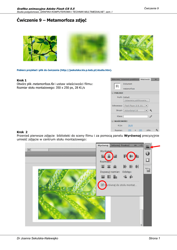 Grafika animacyjna Adobe Flash CS 5.5 Ćwiczenie 9 Studia podyplomowe „GRAFIKA KOMPUTEROWA I TECHNIKI MULTIMEDIALNE”, sem. I Ćwiczenie 9 – Metamorfoza zdjęć Pobierz przykład i plik do ćwiczenia (http://jsekulska.kis.p.lodz.pl/studia.htm). Krok 1 Otwórz plik metamorfoza.fla i ustaw właściwości filmu: Rozmiar stołu montażowego: 350 x 250 px, 28 Kl./s Krok 2 Przenieś pierwsze zdjęcie biblioteki do sceny filmu i za pomocą panelu Wyrównaj precyzyjnie umieść zdjęcie w centrum stołu montażowego: Dr Joanna Sekulska-Nalewajko Strona 1 Grafika animacyjna Adobe Flash CS 5.5 Ćwiczenie 9 Studia podyplomowe „GRAFIKA KOMPUTEROWA I TECHNIKI MULTIMEDIALNE”, sem. I Krok 3 Zaznacz zdjęcie na stole i przekonwertuj je do klipu (wciśnij F8). Nazwij go img1_mc. Warstwę z obrazem nazwij „zdjęcie1”. Krok 4 Kliknij na klatkę 10 i wstaw klatkę kluczową (wciśnij F6). Potem kliknij na klatkę 20 i znów wstaw klatkę kluczową. Krok 5 Będąc w klatce nr 20 zaznacz zdjęcie i w panelu Właściwości przejdź do sekcji Filtry. Za pomocą plusa pierwszej z lewej strony ikonki dodaj filtr Rozmycie i ustaw opcje: RozmycieX=RozmycieY=100; Jakość – Niska. Dodanie filtra Dr Joanna Sekulska-Nalewajko Strona 2 Grafika animacyjna Adobe Flash CS 5.5 Ćwiczenie 9 Studia podyplomowe „GRAFIKA KOMPUTEROWA I TECHNIKI MULTIMEDIALNE”, sem. I Krok 6 Zaznacz klatkę nr 10 i z menu podręcznego wybierz polecenie Utwórz klasyczną animację. Krok 7 Wstaw nową warstwę i nazwij ją „zdjęcie2”. Kliknij na 15 klatkę nowej warstwy i wstaw tam klatkę kluczową (F6). Przenieś drugie zdjęcie na stół montażowy i wyrównaj jego położenie tak jak poprzednio (krok 2). Krok 8 Przekształć zdjęcie w klip (F8). Krok 9 Klikaj kolejno na klatki 25, 35 i 45 i wstawiaj w nich klatki kluczowe (F6). Krok 10 Wróć do klatki nr 15, zaznacz zdjęcie i dodaj do niego efekt Rozmycie jak w Kroku 5. Dr Joanna Sekulska-Nalewajko Strona 3 Grafika animacyjna Adobe Flash CS 5.5 Ćwiczenie 9 Studia podyplomowe „GRAFIKA KOMPUTEROWA I TECHNIKI MULTIMEDIALNE”, sem. I Krok 11 Znów zaznacz klatkę 15 i z menu podręcznego wybierz polecenie Utwórz klasyczną animację. Krok 12 Kliknij na klatkę 45, zaznacz zdjęcie i ustaw tak jak poprzednio efekt Rozmycie. Krok 13 Wróć do klatki 35 i z menu podręcznego wybierz polecenie Utwórz klasyczną animację. Krok 14 Samodzielnie utwórz animację trzeciego zdjęcia w nowej warstwie „zdjęcie3” powtarzając wszystkie czynności. Zacznij od klatki nr 40. Efekt końcowy na listwie czasowej: Dr Joanna Sekulska-Nalewajko Strona 4