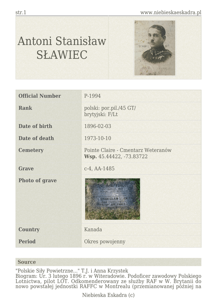 str.1 www.niebieskaeskadra.pl Antoni Stanisław SŁAWIEC Official Number P-1994 Rank polski: por.pil./45 GT/ brytyjski: F/Lt Date of birth 1896-02-03 Date of death 1973-10-10 Cemetery Pointe Claire - Cmentarz Weteranów Wsp. 45.44422, -73.83722 Grave c-4, AA-1485 Photo of grave Country Kanada Period Okres powojenny Source "Polskie Siły Powietrzne..." T.J. i Anna Krzystek Biogram: Ur. 3 lutego 1896 r. w Witeradowie. Podoficer zawodowy Polskiego Lotnictwa, pilot LOT. Odkomenderowany ze służby RAF w W. Brytanii do nowo powstałej jednostki RAFFC w Montrealu (przemianowanej później na Niebieska Eskadra (c) str.2 www.niebieskaeskadra.pl 45 Grupę Transportową). Przybył do Halifaxu na pokładzie SS Princess Seven Islands w listopadzie 1941 r. St. sierżant Sławiec był jednym z sześciu polskich pionierów "Mostu Atlantyckiego". W czasie tych niebezpiecznych lotów nie tylko dosłużył się szlif oficerskich, ale również awansował. Po wojnie na emigracji w Kanadzie. Zmarł 10 października 1973 r. w szpitalu Ste-Anne-de-Bellevue, QC. Informacje: www.biblioteka.info/pointeclaire Zdjęcie nagrobka: Sam McLauchlan via Wilhelm Ratuszynski Zdj. portret. Iwona Sławiec-Nadrowska Niebieska Eskadra (c)