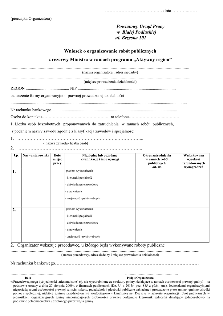………………………..…….… dnia ………..…… (pieczątka Organizatora) Powiatowy Urząd Pracy w Białej Podlaskiej ul. Brzeska 101 Wniosek o organizowanie robót publicznych z rezerwy Ministra w ramach programu „Aktywny region” ............................................................................................................................................................... (nazwa organizatora i adres siedziby) ................................................................................................................................................................ (miejsce prowadzenia działalności) REGON .......................................... NIP ............................................................................................... oznaczenie formy organizacyjno - prawnej prowadzonej działalności ........................................................................................................................................................................... Nr rachunku bankowego.......................................................................................................................... Osoba do kontaktu……………………….……………….… nr telefonu…………………….………… 1. Liczba osób bezrobotnych proponowanych do zatrudnienia w ramach robót publicznych, z podaniem nazwy zawodu zgodnie z klasyfikacją zawodów i specjalności: 1. ………………………………………………………….……………... ( nazwa zawodu- liczba osób) 2. ……………………………………………………………………….. Lp. Nazwa stanowiska Ilość miejsc pracy Niezbędne lub poŜądane kwalifikacje i inne wymogi Okres zatrudnienia w ramach robót publicznych od- do Wnioskowana wysokość refundowanych wynagrodzeń -poziom wykształcenia 1. - kierunek/specjalność - doświadczenie zawodowe - uprawnienia - znajomość języków obcych -poziom wykształcenia 2. - kierunek/specjalność - doświadczenie zawodowe - uprawnienia - znajomość języków obcych 2. Organizator wskazuje pracodawcę, u którego będą wykonywane roboty publiczne ........................................................................................................................................................................ ( nazwa pracodawcy, adres siedziby i miejsce prowadzenia działalności) Nr rachunku bankowego…………………………………………………………………………………… ................................................. Data ............................................... Podpis Organizatora • Pracodawcą mogą być jednostki „niesamoistne” (tj. nie wyodrębnione ze struktury gminy, działające w ramach osobowości prawnej gminy) – na podstawie ustawy z dnia 27 sierpnia 2009r. o finansach publicznych (Dz. U. z 2013r. poz. 885 z późn. zm.). Jednostkami organizacyjnymi nieposiadającymi osobowości prawnej są m.in. szkoły, przedszkola i placówki publiczne zakładane i prowadzone przez gminę, gminne ośrodki pomocy społecznej, niektóre gminne przedsiębiorstwa wodociągowo - kanalizacyjne. Decyzje w zakresie organizacji robót publicznych w jednostkach organizacyjnych gminy nieposiadających osobowości prawnej podejmuje kierownik jednostki działający jednoosobowo na podstawie pełnomocnictwa udzielonego przez wójta gminy. • Pracodawcą moŜe być takŜe podmiot który nie jest jednostką organizacyjną gminy – jeśli prace wykonywane przez bezrobotnych zatrudnionych w ramach robót publicznych są finansowane lub dofinansowane ze środków samorządu terytorialnego, budŜetu państwa lub funduszy celowych. Oświadczenia Organizatora/Pracodawcy* (wypełnia organizator lub pracodawca, który jest jednostką organizacyjną gminy): 1. Organizator/Pracodawca proponuje dla skierowanego/ych bezrobotnego/ych wynagrodzenie miesięczne brutto wg stanowisk określonych powyŜej, w wysokości: …………………………………………………………………………………………………………… 2. Miejsce i rodzaj prac, które mają być wykonywane przez skierowanego/ych bezrobotnego/ych: …………………………………………………………………………………………………………..…… ………………………………………………………………………………………………………………. ………………………………………………………………………………………………………………. ………………………………………………………………………………………………………………. ………………………………………………………………………………………………………………. ………………………………………………………………………………………………………………. Uprawniony do reprezentowania oświadczam, Ŝe Organizator/Pracodawca: 1. nie zalega z zapłatą wynagrodzeń pracownikom, 2. nie zalega z zapłatą składek na ubezpieczenie społeczne, zdrowotne, Fundusz Pracy, FGŚP i innych danin publicznych, 3. w dniu składania wniosku zatrudnia ........................ pracowników, oraz zobowiązuje się przyznać skierowanym bezrobotnym wszelkie uprawnienia wynikające z przepisów prawa pracy, z tytułów ubezpieczeń społecznych i przepisów wewnątrzzakładowych przysługujące pracownikom zatrudnionym na czas nie określony. Organizator............................................................................statutowo zajmuje się………….………………… ………………………………………………………………………………………………………………….. Wskazany pracodawca……………………………………. statutowo zajmuje się…………………………… ……………………