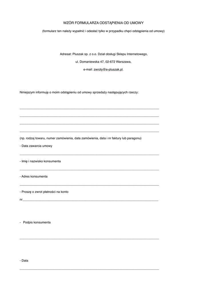 WZÓR FORMULARZA ODSTĄPIENIA OD UMOWY (formularz ten należy wypełnić i odesłać tylko w przypadku chęci odstąpienia od umowy) Adresat: Pluszak sp. z o.o. Dział obsługi Sklepu Internetowego, ul. Domaniewska 47, 02-672 Warszawa, e-mail: [email protected]. Niniejszym informuję o moim odstąpieniu od umowy sprzedaży następujących rzeczy: ________________________________________________________________________________ ________________________________________________________________________________ ________________________________________________________________________________ ________________________________________________________________________________ (np. rodzaj towaru, numer zamówienia, data zamówienia, data i nr faktury lub paragonu) - Data zawarcia umowy ________________________________________________________________________________ - Imię i nazwisko konsumenta ________________________________________________________________________________ - Adres konsumenta ________________________________________________________________________________ - Proszę o zwrot płatności na konto nr______________________________________________________________________________ - Podpis konsumenta ________________________________________________________________________________ - Data ________________________________________________________________________________
