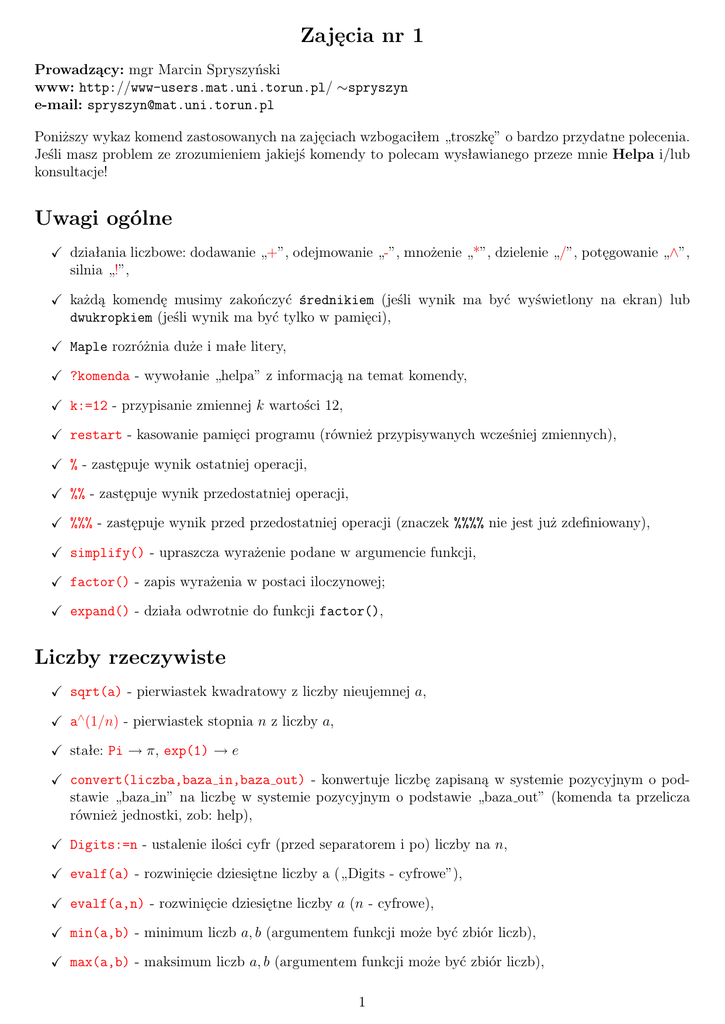 Zajęcia nr 1 Prowadzący: mgr Marcin Spryszyński www: http://www-users.mat.uni.torun.pl/ ∼spryszyn e-mail: [email protected] Poniższy wykaz komend zastosowanych na zajęciach wzbogaciłem „troszkę” o bardzo przydatne polecenia. Jeśli masz problem ze zrozumieniem jakiejś komendy to polecam wysławianego przeze mnie Helpa i/lub konsultacje! Uwagi ogólne X działania liczbowe: dodawanie „+”, odejmowanie „-”, mnożenie „*”, dzielenie „/”, potęgowanie „∧”, silnia „!”, X każdą komendę musimy zakończyć średnikiem (jeśli wynik ma być wyświetlony na ekran) lub dwukropkiem (jeśli wynik ma być tylko w pamięci), X Maple rozróżnia duże i małe litery, X ?komenda - wywołanie „helpa” z informacją na temat komendy, X k:=12 - przypisanie zmiennej k wartości 12, X restart - kasowanie pamięci programu (również przypisywanych wcześniej zmiennych), X % - zastępuje wynik ostatniej operacji, X %% - zastępuje wynik przedostatniej operacji, X %%% - zastępuje wynik przed przedostatniej operacji (znaczek %%%% nie jest już zdefiniowany), X simplify() - upraszcza wyrażenie podane w argumencie funkcji, X factor() - zapis wyrażenia w postaci iloczynowej; X expand() - działa odwrotnie do funkcji factor(), Liczby rzeczywiste X sqrt(a) - pierwiastek kwadratowy z liczby nieujemnej a, X a∧ (1/n) - pierwiastek stopnia n z liczby a, X stałe: Pi → π, exp(1) → e X convert(liczba,baza in,baza out) - konwertuje liczbę zapisaną w systemie pozycyjnym o podstawie „baza in” na liczbę w systemie pozycyjnym o podstawie „baza out” (komenda ta przelicza również jednostki, zob: help), X Digits:=n - ustalenie ilości cyfr (przed separatorem i po) liczby na n, X evalf(a) - rozwinięcie dziesiętne liczby a („Digits - cyfrowe”), X evalf(a,n) - rozwinięcie dziesiętne liczby a (n - cyfrowe), X min(a,b) - minimum liczb a, b (argumentem funkcji może być zbiór liczb), X max(a,b) - maksimum liczb a, b (argumentem funkcji może być zbiór liczb), 1 Liczby całkowite (a, b ∈ Z) X irem(a,b) - reszta z dzielenia a przez b, X iquo(a,b) - iloraz całkowity z dzielenia a przez b, X igcd(a,b) - największy wspólny dzielnik liczb a i b, X ilcm(a,b) - największa wspólna wielokrotność liczb a i b, X isprime(a) - sprawdza, czy liczba a jest liczbą pierwszą, X ithprime(a) - podaje a-tą w kolejności liczbę pierwszą (a 1), X ifactor(a) - rozkład liczby a na iloczyn potęg liczb pierwszych, X prevprime(a) - największa liczba pierwsza niewiększa od a, X nextprime(a) - najmniejsza liczba pierwsza niemniejsza od a, X length(a) - ilość cyfr liczby (całkowitej) n (znaku nie liczy!), Liczby zespolone X I - jednostka urojona, X a+b*I - liczba zespolona o części rzeczywistej a i części urojonej b, X Im(z) - część urojona liczby z, X Re(z) - część rzeczywista liczby z, X abs(z) - moduł liczby z, X argument(z) - argument liczby z, X evalc(z) - przedstawienie liczby zespolonej z w postaci a + bi, X conjugate(z) - sprzężenie liczby z, Sumowanie (a, b ∈ Z, a ¬ b) X sum(f(k),k=a..b) - oblicza b X f (k), k=a a, b mogą być liczbami, symbolami -infinity, infinity nawet mogą nie mieć konkretnych wartości liczbowych. Indeks sumowania k musi być zmienną „wolną”, tzn. nie może mieć wcześniej przypisanej wartości. X add(f(k),k=a..b) - oblicza b X f (k), k=a a, b muszą być liczbami, jednakże funkcja ta jest „niewrażliwa” na stosowanie jako indeksu sumacyjnego zmiennej, która we wcześniejszych rachunkach miała przypisaną konkretną wartość. F Uwaga: Jeśli komendę sum lub add zapiszemy dużą literą, to wynikiem takiej operacji nie będzie obliczenie wartości wyrażenia, tylko symbol oznaczający zadeklarowaną operację! 2 Mnożenie (a, b ∈ Z, a ¬ b) X product(f(k),k=a..b) - oblicza b Y f (k), k=a a, b mogą być liczbami, symbolami -infinity, infinity nawet mogą nie mieć konkretnych wartości liczbowych. Indeks sumowania k musi być zmienną „wolną”, tzn. nie może mieć wcześniej przypisanej wartości (ot tak jak w przypadku sum). X mul(f(k),k=a..b) - oblicza b Y f (k), k=a a, b, tak jak w przypadku add, muszą być liczbami, jednakże funkcja ta jest „niewrażliwa” na stosowanie jako indeksu sumacyjnego zmiennej, która we wcześniejszych rachunkach miała przypisaną konkretną wartość. F Uwaga: Jeśli komendę product lub mul zapiszemy dużą literą, to wynikiem takiej operacji nie będzie obliczenie wartości wyrażenia, tylko symbol oznaczający zadeklarowaną operację! Ułamki Nie chodzi tylko o liczby wymierne zapisane w postaci ułamka, lecz poprostu o liczby, w najgorszym przypadku zespolone, zapisane w postaci ułamka zwykłego! X ceil(x) - funkcja „sufit” - zwraca najmniejszą liczbę całkowitą większą bądź równą x, X floor(x) - funkcja „podłoga”, zwraca największą liczbę całkowitą mniejszą bądź równą x, X numer(x) - zwraca licznik ułamka x, X denom(x) - zwraca mianownik ułamka x, X trunc(x) - zwraca największą liczbę całkowitą mniejszą bądź równą x 0, dla x < 0 mamy trunc(x) = −trunc(−x), X frac(x) - zwraca wartość x − trunc(x), X round(x) - zwraca przybliżenie do najbliższej liczby całkowitej, X rationalize(x) - usuwa niewymierność z mianownika ułamka x, F Uwaga: Funkcje trunc, frac, round działają, dla liczb zespolonych, w ten sposób, że wymienione operacje wykonywane są osobno na części rzeczywistej i urojonej. Natomiast sposoby określenia funkcji ceil, floor opisane są dokładnie w Helpie! 3
