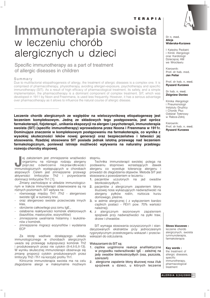 T E R A P I A Immunoterapia swoista w leczeniu chorób alergicznych u dzieci Specific immunotherapy as a part of treatment of allergic diseases in children Summary Due to multifactorial etiopathogenesis of allergy, the treatment of allergic diseases is a complex one. It is comprised of pharmacotherapy, physiotherapy, avoiding allergen-exposure, psychotherapy and specific immunotherapy (SIT). As a result of high efficacy of pharmacological treatment, its safety, and a simple implementation, the pharmacotherapy is a dominant component of complex treatment. SIT, which was developed in 1911 by Noon and Freenmana, is used less frequently. However, it has a serious advantage over pharmacotherapy as it allows to influence the natural course of allergic disease. ............................................... Leczenie chorób alergicznych ze wzglêdów na wieloczynnikow¹ etiopatogenezê jest leczeniem kompleksowym. Jedn¹ ze sk³adowych tego postêpowania, jest oprócz farmakoterapii, fizjoterapii , unikania ekspozycji na alergen i psychoterapii, immunoterapia swoista (SIT) (specific immunotherapy) wprowadzona przez Noona i Freenmana w 1911r. Dominuj¹ce znaczenie w kompleksowym postêpowaniu ma farmakoterapia, co wynika z wysokiej skutecznoœci leków nowej generacji oraz bezpieczeñstwa i ³atwoœci jej stosowania. Rzadziej stosowana SIT posiada jednak istotn¹ przewagê nad leczeniem farmakologicznym, poniewa¿ istnieje mo¿liwoœæ wp³ywania na naturalny przebiegu rozwoju choroby atopowej. J ej za³o¿eniem jest zmniejszenie wra¿liwoœci organizmu na ró¿nego rodzaju alergeny popr zez o dwró ceni e nie praw id³o woœc i immunologicznych wystêpuj¹cych w chorobach atopowych .Celem jest zmniejszenie przewagi aktywnoœci limfocytów Th2 i przywrócenie dominacji limfocytów Th1 [1]. Zmiany zachodz¹ce w uk³adzie immunologicznym w trakcie immunoterapii obserwowane s¹ na ró¿nych poziomach. SIT wp³ywa na : - równowagê miêdzy TH1 /Th2 - alergenowo swoiste IgE w surowicy krwi, - oraz alergenowo swoiste przeciwcia³a innych klas, - obni¿enie ca³kowitego poz.iomu IgE., - os³abienie reaktywnoœci komórek efektorowych (bazofilów, mastocytów, eozynofilów) - zmniejszenie uwalniania histaminy i leukotrienów z komórek, - zmniejszenie migracji eozynofilów i wydalania ECP Za istotê wadliwie dzia³aj¹cego uk³adu immunologicznego w chorobach alergicznych uwa¿a siê przewagê subpopulacji komórek Th2 i produkowanych przez nie cytokin (Il-4,Il-5,Il-13). W wyniku skutecznej immunoterapii obserwuje siê zmianê proporcji cytokin produkowanych przez limfocyty Th2 i Th1 na korzyœæ profilu Th1. Klinicznie immunoterapia swoista ma na celu z³agodzenie alergii w maksymalnie mo¿liwym Dr n. med. Alicja Widerska-Kurzawa I Katedra Pediatrii i Kliniki Alergologii oraz Kardiologii Dzieciêcej AM we Wroc³awiu Kierownik: Prof. dr hab. med. Jan Pellar Prof. dr hab. n. med. Ryszard Kurzawa Dr hab. n. med. Zbigniew Doniec Klinika Alergologii i Pneumonologii Instytutu GruŸlicy i Chorób P³uc Oddzia³ Terenowy w Rabce-Zdrój Kierownik: Prof. dr hab. n. med. Ryszard Kurzawa stopniu. Technika immunoterapii swoistej polega na podawaniu stopniowo wzrastaj¹cych dawek alergenu co wywo³uje tolerancjê alergenu i prowadzi do z³agodzenia objawów. Metoda SIT jest stosowana z powodzeniem w leczeniu : 1. pacjentów uczulonych na jad owadów b³onkoskrzyd³ych , 2. pacjentów z alergicznym zapaleniem b³ony œluzowej nosa wykazuj¹cych nadwra¿liwoœæ na alergeny py³ków roœlin, roztocza kurzu domowego, pleœnie. 3. w astmie alergicznej ( z wy³¹czeniem bardzo ciê¿kich postaci - FEV1 pow. 70% wartoœci nale¿nej). 4. z alergicznym sezonowym zapaleniem spojówek przy nadwra¿liwoœci na py³ki traw, drzew i chwastów. SIT wymaga stosowania oczyszczonych i standaryzowanych ekstraktów przy jednoczesnym rygorystycznym przestrzeganiu wskazañ i przeciwwskazañ do odczulania. Wskazaniami do SIT s¹: 1. ciê¿kie uogólnione reakcje anafilaktyczne w przypadku nadwra¿liwoœci IgE - zale¿nej na jady owadów b³onkoskrzyd³ych (osa, pszczo³a, szerszeñ) 2. alergiczne zapalenie b³ony œluzowej nosa i/lub spojówek u dzieci, u których leczenie S³owa kluczowe : leczenie chorób alergicznych, swoista iummunoterapia, farmakoterapia Key words : the treatment of allergic diseases, specific immunotherapy, pharmacological treatment A L E R G I A 2 ( 2 4 ) / 2 0 0 5 51 T E R A P I A farmakologiczne niewystarczaj¹co kontroluje objawy chorobowe, pacjenci którzy odmawiaj¹ farmakoterapii, nie chc¹ przewlekle przyjmowaæ leków lub u których wystêpuj¹ objawy niepo¿¹dane w wyniku prowadzonej farmakoterapii 3. astma oskrzelowa alergiczna IgE - zale¿na u dzieci u których przebieg choroby nie jest dobrze kontrolowany przez karencjê alergenow¹ i leczenie farmakologiczne, pacjenci, u których wspó³wystêpuj¹ objawy alergiczne ze strony nosa i oskrzeli, którzy nie chc¹ przyjmowaæ przewlekle œrodków farmakologicznych oraz pacjenci u których w trakcie leczenia farmakologicznego wystêpuj¹ objawy niepo¿¹dane. Przeciwwskazania do immunoterapii swoistej mo¿na podzieliæ na bezwzglêdne , do których zaliczymy: - alergiê nie IgE - zale¿n¹, - ciê¿kie choroby uk³adu kr¹¿enia , - choroby autoimmunologiczne , - choroby nowotworowe, , - przewlek³e choroby zakaŸne (np. gruŸlica) - brak wspó³pracy z pacjentem oraz - ciê¿kie postacie astmy oskrzelowej z nieodwracalnymi zaburzeniami badañ czynnoœciowych uk³adu oddechowego (FEV1<70% wartoœci nale¿nej), - stosowanie leków adrenolitycznych. I wzglêdne , a w tej grupie - ci¹¿a , - wiek poni¿ej 5r¿ , - ciê¿ki przebieg chorób alergicznych - ciê¿kie atopowe zapalenie skóry. ¯eby osi¹gn¹æ skutecznoœæ w SIT musz¹ byæ spe³nione nastêpuj¹ce warunki: precyzyjne rozpoznanie uczulaj¹cych alergenów, szczepionka powinna zawieraæ ma³¹ liczbê alergenów, powinna byæ dobrze oczyszczona ,i zawieraæ standaryzowane i modyfikowane wyci