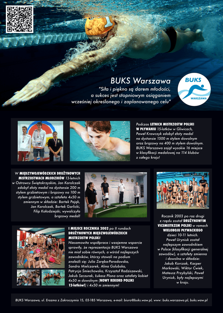 BUKS Warszawa "Siła i piękno są darem młodości, a sukces jest stopniowym osiąganiem wcześniej określonego i zaplanowanego celu" Podczas LETNICH MISTRZOSTW POLSKI W PŁYWANIU 15-latków w Gliwicach, Paweł Krawczyk zdobył złoty medal na dystansie 1500 m stylem dowolnym oraz brązowy na 400 m stylem dowolnym. BUKS Warszawa zajął wysokie 16 miejsce w klasyfikacji medalowej na 114 klubów z całego kraju! W MIĘDZYWOJEWÓDZKICH DRUŻYNOWYCH MISTRZOSTWACH MŁODZIKÓW 13-letnich w Ostrowcu Świętokrzyskim, Jan Karolczak zdobył złoty medal na dystansie 200 m stylem grzbietowym i brązowy na 100 m stylem grzbietowym, a sztafeta 4x50 m zmiennym w składzie: Bartek Pająk, Jan Karolczak, Bartek Garlicki, Filip Kołodziejski, wywalczyła brązowy medal! I MIEJSCE ROCZNIKA 2002 po II rundach DRUŻYNOWYCH MIĘDZWOJEWÓDZKICH MISTRZOSTW POLSKI! Niesamowita współpraca i wzajemne wsparcie sprawiły, że reprezentacja BUKS Warszawa nie miał sobie równych, a wśród najlepszych zawodników, którzy stawali na podium znaleźli się: Julia Zaręba-Paradowska, Sandra Mielczarek, Alina Golubska, Patrycja Śmiechowska, Krzysztof Radziszewski, Jakub Szczurek, Łukasz Plona oraz sztafety kobiet 4x50 m dowolnym (NOWY REKORD POLSKI 12-latków!) i 4x50 m zmiennym! Rocznik 2003 po raz drugi z rzędu został DRUŻYNOWYM VICEMISTRZEM POLSKI w ramach WIELOBOJU PŁYWACKIEGO dzieci 10-11 letnich. Paweł Uryniuk został najlepszym zawodnikiem w Polsce (klasyfikacji generalnej zawodów), a sztafety zmienna i dowolna w składzie: Jakub Korczak, Kacper Markowski, Wiktor Ćwiek, Mateusz Przybylski, Paweł Uryniuk, były najlepszymi w kraju. BUKS Warszawa, ul. Erazma z Zakroczymia 15, 03-185 Warszawa, e-mail: [email protected], www: buks.warszawa.pl, buks.waw.pl