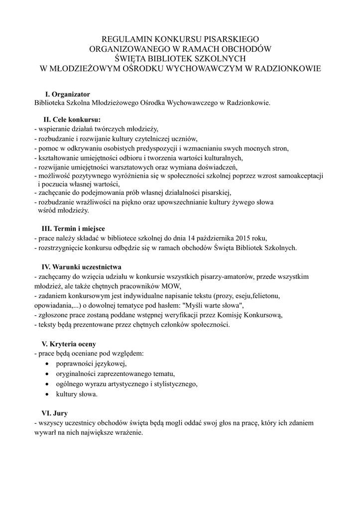 REGULAMIN KONKURSU PISARSKIEGO ORGANIZOWANEGO W RAMACH OBCHODÓW ŚWIĘTA BIBLIOTEK SZKOLNYCH W MŁODZIEŻOWYM OŚRODKU WYCHOWAWCZYM W RADZIONKOWIE I. Organizator Biblioteka Szkolna Młodzieżowego Ośrodka Wychowawczego w Radzionkowie. II. Cele konkursu: - wspieranie działań twórczych młodzieży, - rozbudzanie i rozwijanie kultury czytelniczej uczniów, - pomoc w odkrywaniu osobistych predyspozycji i wzmacnianiu swych mocnych stron, - kształtowanie umiejętności odbioru i tworzenia wartości kulturalnych, - rozwijanie umiejętności warsztatowych oraz wymiana doświadczeń, - możliwość pozytywnego wyróżnienia się w społeczności szkolnej poprzez wzrost samoakceptacji i poczucia własnej wartości, - zachęcanie do podejmowania prób własnej działalności pisarskiej, - rozbudzanie wrażliwości na piękno oraz upowszechnianie kultury żywego słowa wśród młodzieży. III. Termin i miejsce - prace należy składać w bibliotece szkolnej do dnia 14 października 2015 roku, - rozstrzygnięcie konkursu odbędzie się w ramach obchodów Święta Bibliotek Szkolnych. IV. Warunki uczestnictwa - zachęcamy do wzięcia udziału w konkursie wszystkich pisarzy-amatorów, przede wszystkim młodzież, ale także chętnych pracowników MOW, - zadaniem konkursowym jest indywidualne napisanie tekstu (prozy, eseju,felietonu, opowiadania,...) o dowolnej tematyce pod hasłem: "Myśli warte słowa", - zgłoszone prace zostaną poddane wstępnej weryfikacji przez Komisję Konkursową, - teksty będą prezentowane przez chętnych członków społeczności. V. Kryteria oceny - prace będą oceniane pod względem: poprawności językowej, oryginalności zaprezentowanego tematu, ogólnego wyrazu artystycznego i stylistycznego, kultury słowa. VI. Jury - wszyscy uczestnicy obchodów święta będą mogli oddać swoj głos na pracę, który ich zdaniem wywarł na nich największe wrażenie. VII. Nagrody - zostanie przyznane miejsce I-III w dwóch kategoriach: praca młodego pisarza, praca pracownika MOW. - laureaci otrzymają nagrody rzeczowe.