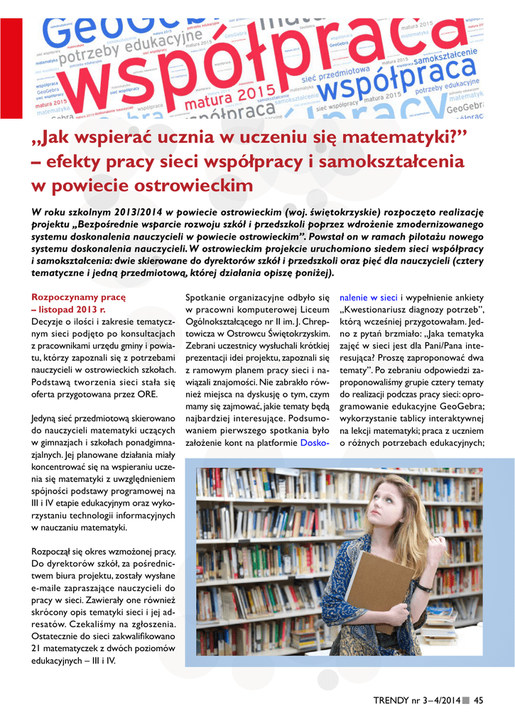 „Jak wspierać ucznia w uczeniu się matematyki?” – efekty pracy sieci współpracy i samokształcenia w powiecie ostrowieckim W roku szkolnym 2013/2014 w powiecie ostrowieckim (woj. świętokrzyskie) rozpoczęto realizację projektu „Bezpośrednie wsparcie rozwoju szkół i przedszkoli poprzez wdrożenie zmodernizowanego systemu doskonalenia nauczycieli w powiecie ostrowieckim”. Powstał on w ramach pilotażu nowego systemu doskonalenia nauczycieli. W ostrowieckim projekcie uruchomiono siedem sieci współpracy i samokształcenia: dwie skierowane do dyrektorów szkół i przedszkoli oraz pięć dla nauczycieli (cztery tematyczne i jedną przedmiotową, której działania opiszę poniżej). Rozpoczynamy pracę – listopad 2013 r. Decyzje o ilości i zakresie tematycznym sieci podjęto po konsultacjach z pracownikami urzędu gminy i powiatu, którzy zapoznali się z potrzebami nauczycieli w ostrowieckich szkołach. Podstawą tworzenia sieci stała się oferta przygotowana przez ORE. Jedyną sieć przedmiotową skierowano do nauczycieli matematyki uczących w gimnazjach i szkołach ponadgimnazjalnych. Jej planowane działania miały koncentrować się na wspieraniu uczenia się matematyki z uwzględnieniem spójności podstawy programowej na III i IV etapie edukacyjnym oraz wykorzystaniu technologii informacyjnych w nauczaniu matematyki. Spotkanie organizacyjne odbyło się w pracowni komputerowej Liceum Ogólnokształcącego nr II im. J. Chreptowicza w Ostrowcu Świętokrzyskim. Zebrani uczestnicy wysłuchali krótkiej prezentacji idei projektu, zapoznali się z ramowym planem pracy sieci i nawiązali znajomości. Nie zabrakło również miejsca na dyskusję o tym, czym mamy się zajmować, jakie tematy będą najbardziej interesujące. Podsumowaniem pierwszego spotkania było założenie kont na platformie Dosko- nalenie w sieci i wypełnienie ankiety „Kwestionariusz diagnozy potrzeb”, którą wcześniej przygotowałam. Jedno z pytań brzmiało: „Jaka tematyka zajęć w sieci jest dla Pani/Pana interesująca? Proszę zaproponować dwa tematy”. Po zebraniu odpowiedzi zaproponowaliśmy grupie cztery tematy do realizacji podczas pracy sieci: oprogramowanie edukacyjne GeoGebra; wykorzystanie tablicy interaktywnej na lekcji matematyki; praca z uczniem o różnych potrzebach edukacyjnych; Rozpoczął się okres wzmożonej pracy. Do dyrektorów szkół, za pośrednictwem biura projektu, zostały wysłane e-maile zapraszające nauczycieli do pracy w sieci. Zawierały one również skrócony opis tematyki sieci i jej adresatów. Czekaliśmy na zgłoszenia. Ostatecznie do sieci zakwalifikowano 21 matematyczek z dwóch poziomów edukacyjnych – III i IV. TRENDY nr 3– 4/2014 45 Efekty pracy sieci współpracy i samokształcenia w powiecie ostrowieckim matura 2015. Zostały one zrealizowane podczas spotkań stacjonarnych i pracy na platformie szkoleniowej. ci poznali podstawowe zasady pracy z tablicą SmartBoard, oprogramowaniem SMART Notebook oraz strony internetowe z zasobami edukacyjnymi wykorzystującymi multimedia. Po spotykaniu niektórzy ubolewali, że nie mają w swoich placówkach dostępu do takiego sprzętu lub możliwości wykorzystania go na lekcjach. Byli jednak zadowoleni, że zobaczyli jak to działa. Inni postanowili spróbować wykorzystać sprzęt, który mają w szkole, a o którego przeznaczeniu nie wiedzieli. z matematyki często dyskutowano na platformie. Fragment netografii1: 1.Informatory maturalne: Dlaczego GeoGebra? • CKE, (2013a), Informator o egzamiSieciowanie rozpoczęliśmy od Geonie maturalnym od roku szkolnego Gebry – darmowego oprogramowania 2014/2015. Część ogólna. wspomagającego nauczanie matematy• CKE, (2013b), Informator o egzamiki. Jestem wiceprezesem Warszawskienie maturalnym z matematyki od go Centrum GeoGebry przy Szkole roku szkolnego 2014/2015. Wyższej Psychologii Społecznej i tłu• Praca zbiorowa, (2013), Informator maczem tego oprogramowania na jęo egzaminie maturalnym od 2015 r. zyk polski oraz prowadzę szkolenia dla Matematyka, Kraków: Wydawnicnauczycieli w zakresie wykorzystania two Omega (informacje o książce). GeoGebry w szkole, mogłam więc po2.Zestawy wzorów i zbiory zadań: dzielić się z uczestniczkami sieci wiedzą Praca z uczniem o różnych • CKE, (b.r. a), Wybrane wzory matei doświadczeniem w tym zakresie. Był potrzebach edukacyjnych matyczne [czerwone, dotychczasoto mój merytoryczny wkład do sieci. we]. Te zajęcia również poprowadziła • CKE, (b.r. b), Uzupełnienie zestawu ekspertka zewnętrzna. Zapoznała Na spotkaniu stacjonarnym uczest- uczestników z obowiązującymi aktami wybranych wzorów matematycznicy sieci poznali zasady pracy z pro- prawnymi dotyczącymi pracy z ucznianych. gramem i podstawowe możliwości mi ze specyficznymi potrzebami edu- 3.Przykładowe arkusze maturalne: GeoGebry. Zaproponowałam też kacyjnymi oraz wskazała możliwości • CKE, (2012), Zbiór zadań maturalćwiczenia praktyczne – rozwiązywa- wykorzystania nowoczesnych technych z matematyki, Warszawa: nie problemów matematycznych z za- nologii informacyjnych w pracy z nimi. CKE. stosowaniem tego oprogramowania. Dyskutowaliśmy też o metodach ak• CKE, (2013a), Przykładowy arkusz Kontynuacją była praca na platformie. tywizujących, wzmacniających i inten(A1) – poziom podstawowy; RozwiąPrawie wszystkie uczestniczki po- syfikujących nauczanie i uczenie się zania i schematy punktowania (A1) konały własne obawy przed użyciem uczniów. – poziom podstawowy. programu i podjęły próby wykonania • CKE, (2013b), Przykładowy arkusz własnych konstrukcji z planimetrii. Pli(A1) – poziom rozszerzony; Rozwiąki zamieszczały na platformie. O każ- Matura 2015 zania zadań i schematy punktowadej pracy napisałam merytoryczną Choć do matury w 2015 r. zostało nia (A1) – poziom rozszerzony. opinię, doradziłam, co można udosko- jeszcze sporo czasu, temat ten wywo- 4.Inne: nalić. Niestety