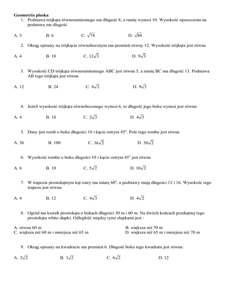 Geometria płaska 1. Podstawa trójkąta równoramiennego ma długość 8, a ramię wynosi 10. Wysokość opuszczona na podstawę ma długość A. 5 B. 6 C. 74 D. 84 2. Okrąg opisany na trójkącie równobocznym ma promień równy 12. Wysokość trójkąta jest równa A. 4 B. 18 C. 12 3 D. 9 3 3. Wysokość CD trójkąta równoramiennego ABC jest równa 5, a ramię BC ma długość 13. Podstawa AB tego trójkąta jest równa A. 12 B. 24 C. 6 2 D. 9 3 4. Jeżeli wysokość trójkąta równobocznego wynosi 6, to długość jego boku wynosi jest równa: A. 4 B. 18 C. 2 3 D. 4 3 5. Dany jest romb o boku długości 10 i kącie ostrym 45o. Pole tego rombu jest równe A. 36 B. 100 C. 36 2 D. 50 2 6. Wysokość rombu o boku długości 10 i kącie ostrym 45o jest równa A. 6 B. 10 C. 5 2 D. 10 2 7. W trapezie prostokątnym kąt ostry ma miarę 60o, a podstawy mają długości 12 i 16. Wysokość tego trapezu jest równa: A. 4 B. 12 C. 4 3 D. 4 2 8. Ogród ma kształt prostokąta o bokach długości 30 m i 60 m. Na dwóch końcach przekątnej tego prostokąta wbito słupki. Odległość między tymi słupkami jest : A. równa 60 m C. większa niż 60 m i mniejsza niż 65 m B. większa niż 70 m D. większa niż 65 m i mniejsza niż 70 m 9. Okrąg opisany na kwadracie ma promień 6. Długość boku tego kwadratu jest równa: A. 2 2 B. 3 2 C. 6 2 D. 12 10. Latawiec ma wymiary podane na rysunku. Powierzchnia zacieniowanego trójkąta jest równa 60 cm A. 3600 cm2 B. 1800 cm2 C. 2400 cm2 D. 900 cm2 6 dm 11. Długość ramienia BC trapezu prostokątnego jest dwa razy większa od drugiego ramienia. Kąt BCD ma miarę A. 135o B. 120o C. 150o D. 180o 12. Różnica miar dwóch sąsiednich kątów wewnętrznych równoległoboku jest równa 40o. Kąt ostry tego równoległoboku jest równy A. 70o B. 110o C. 60o D. 100o 13. Różnica miar kątów wewnętrznych przy ramieniu trapezu równoramiennego, który nie jest równoległobokiem jest równa 110o. Miara kąta przy krótszej podstawie tego trapezu jest równa: A. 70o B. 110o C. 35o D. 145o 14. Pole kwadratu wpisanego w okrąg o promieniu 10 cm jest równe: A. 100 cm2 B. 400 cm 2 C. 200 cm2 D. 300 cm2 15. Pole sześciokąta foremnego o boku a 8 wynosi B. P A. P 96 3 8 3 3 C. P 9 3 4 D. P 64 16. Wysokość trapezu równoramiennego o kącie ostry 60o i ramieniu długości 8 ma długość: A. 4 B. 8 3 C. 4 3 D. 12 17. Punkt O jest środkiem okręgu Kąt wpisany ma miarę: A. 70o C. 30o B. 110o D. 140o 140o 18. Miara kąta wpisanego opartego na tym samym łuku, co kąt środkowy o mierze 86o jest równa A. 43o B. 86o C. 172o D. 68o 19. Długość odcinka x jest równa A. 6 8 B. 9 C. 18 D.4 6 18 4 12 20. Odcinki AB i DE są równolegle. Długość odcinków CE, DE, AB są odpowiednio równe 2, 6, 15. Długość odcinka EB jest równa A. 2 B. 3 C. 5 D. 6 21. Punkty A,B,C,D,E,F,G,H,I,J,K,L dzielą okrąg na 12 równych łuków. Miara kąta GAC jest równa: A. 30o B. 90o C. 120o D. 60o 22. Kąt między cięciwą AB a styczną do okręgu w punkcie A ma miarę 74 o . Wówczas: A. 148o B . 74 o C. 120 o D. 48 o 23. Adam, który stoi wieczorem 4 m od latarni rzuca cień o długości 2 m. Adam ma 1,7 m wzrostu. Wysokość latarni wynosi: A. 5,4 m B. 6,4 m C 5,1 m D4m 24. Liczby x 2, x,6 Są długościami boków trójkąta równoramiennego. Oblicz x 25. 12 25. W trójkącie równoramiennym ABC, w którym AC BC 12cm , wysokość poprowadzona z wierzchołka C jest równa 6 2 . Oblicz miary kątów tego trójkąta. 26. Znajdź obwód trójkąta prostokątnego o przyprostokątnych 5 3 oraz 5 3 . 27. Dany jest trójkąt prostokątny ABC o przeciwprostokątnej AB. Wiedząc, że cos BAC 0,4 , oraz BC 6 . Oblicz pole koła opisanego na tym trójkącie. 28. Dany jest prostokąt o bokach a i b oraz prostokąt o bokach c i d. Długość boku c to 80% długości boku a. Długość boku d to 140% długości boku b. Oblicz, ile procent pola prostokąta o bokach a i b stanowi pole prostokąta o bokach c i d. 29. Jaki promień ma koło, w którym wycinek o polu 17,5 odpowiada kąt 63o 30. Oblicz obwód koła o polu 0,49 m2 31. Dany jest trapez równoramienny ABCD. Ramię tego trapezu ma długość 15 cm, a obwód 56 cm. 4 Oblicz pole oraz długości podstaw tego trapezu, jeśli wiadomo, że tg , gdzie jest kątem 3 ostrym danego trapezu 32. Promień koła jest równy 6. Jakie pole ma wycinek koła odpowiadający kątowi o mierze 120o 33. Klomb ma kształt koła o średnicy 8 m. Wokół klombu biegnie ścieżka o szerokości 3 m. Jaką powierzchnie ma ścieżka? 34. Jaką długość ma bok kwadratu, którego pole jest równe polu koła o średnicy 12? Opracował: Waldemar Bałoń