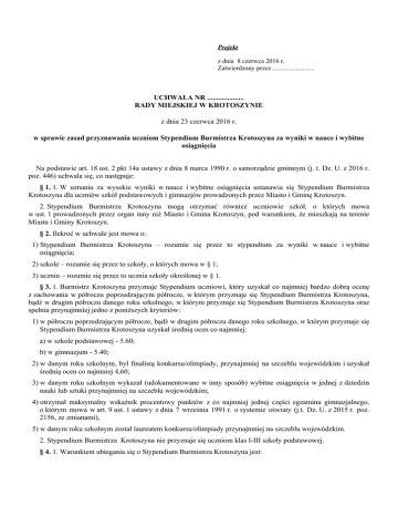 Projekt z dnia 8 czerwca 2016 r. Zatwierdzony przez ......................... UCHWAŁA NR .................... RADY MIEJSKIEJ W KROTOSZYNIE z dnia 23 czerwca 2016 r. w sprawie zasad przyznawania uczniom Stypendium Burmistrza Krotoszyna za wyniki w nauce i wybitne osiągnięcia Na podstawie art. 18 ust. 2 pkt 14a ustawy z dnia 8 marca 1990 r. o samorządzie gminnym (j. t. Dz. U. z 2016 r. poz. 446) uchwala się, co następuje: § 1. 1. W uznaniu za wysokie wyniki w nauce i wybitne osiągnięcia ustanawia się Stypendium Burmistrza Krotoszyna dla uczniów szkół podstawowych i gimnazjów prowadzonych przez Miasto i Gminę Krotoszyn. 2. Stypendium Burmistrza Krotoszyna mogą otrzymać również uczniowie szkół, o których mowa w ust. 1 prowadzonych przez organ inny niż Miasto i Gmina Krotoszyn, pod warunkiem, że mieszkają na terenie Miasta i Gminy Krotoszyn. § 2. Ilekroć w uchwale jest mowa o: 1) Stypendium Burmistrza Krotoszyna – rozumie się przez to stypendium za wyniki w nauce i wybitne osiągnięcia; 2) szkole – rozumie się przez to szkoły, o których mowa w § 1; 3) uczniu – rozumie się przez to ucznia szkoły określonej w § 1. § 3. 1. Burmistrz Krotoszyna przyznaje Stypendium uczniowi, który uzyskał co najmniej bardzo dobrą ocenę z zachowania w półroczu poprzedzającym półrocze, w którym przyznaje się Stypendium Burmistrza Krotoszyna, bądź w drugim półroczu danego roku szkolnego, w którym przyznaje się Stypendium Burmistrza Krotoszyna oraz spełnia przynajmniej jedno z poniższych kryteriów: 1) w półroczu poprzedzającym półrocze, bądź w drugim półroczu danego roku szkolnego, w którym przyznaje się Stypendium Burmistrza Krotoszyna uzyskał średnią ocen co najmniej: a) w szkole podstawowej - 5.60; b) w gimnazjum - 5.40; 2) w danym roku szkolnym, był finalistą konkursu/olimpiady, przynajmniej na szczeblu wojewódzkim i uzyskał średnią ocen co najmniej 4,60; 3) w danym roku szkolnym wykazał (udokumentowane w inny sposób) wybitne osiągnięcia w jednej z dziedzin nauki lub sztuki przynajmniej na szczeblu wojewódzkim; 4) otrzymał maksymalny wskaźnik procentowy punktów z co najmniej jednej części egzaminu gimnazjalnego, o którym mowa w art. 9 ust. 1 ustawy z dnia 7 września 1991 r. o systemie oświaty (j.t. Dz. U. z 2015 r. poz. 2156, ze zmianami), 5) w danym roku szkolnym został laureatem konkursu/olimpiady przynajmniej na szczeblu wojewódzkim. 2. Stypendium Burmistrza Krotoszyna nie przyznaje się uczniom klas I-III szkoły podstawowej. § 4. 1. Warunkiem ubiegania się o Stypendium Burmistrza Krotoszyna jest: 1) złożenie do Burmistrza Krotoszyna wniosku o przyznanie Stypendium Burmistrza Krotoszyna, według wzoru stanowiącego załącznik do niniejszej uchwały, 2) załączenie kserokopii dokumentów potwierdzających osiągnięcia, o których mowa w § 3 ust.1 pkt. 2 5 niniejszej uchwały. 2. Z wnioskiem o przyznanie Stypendium Burmistrza Krotoszyna, zawierającym pozytywną opinię rady pedagogicznej, występuje dyrektor szkoły, do której uczeń uczęszcza. 3. Wnioski o przyznanie Stypendium Burmistrza Krotoszyna składać można w dwóch terminach: 1) do 15 marca danego roku kalendarzowego, uwzględniające średnią ocen za poprzednie półrocze bądź potwierdzone osiągnięcia, o których mowa w § 3 ust.1 pkt. 2 i 3; 2) do końca czerwca danego roku kalendarzowego, uwzględniające średnią ocen za drugie półrocze bieżącego roku szkolnego bądź potwierdzone osiągnięcia, o których mowa w § 3 ust.1 pkt. 2 - 5 niniejszej uchwały. 4. Stypendium Burmistrza Krotoszyna przyznaje się raz za dane półrocze. 5. Stypendium Burmistrza Krotoszyna ma charakter uznaniowy. § 5. 1. Oceny wniosków o przyznanie Stypendium Burmistrza Krotoszyna dokonuje Komisja Stypendialna w składzie: 1) I Zastępca Burmistrza Krotoszyna - nadzorujący sprawy związane z oświatą - Przewodniczący; 2) dwóch radnych Komisji Społecznej Rady Miejskiej w Krotoszynie – członkowie; 3) Zastępca Naczelnika Wydziału Oświaty i Spraw Społecznych Urzędu Miejskiego w Krotoszynie - do spraw oświaty - członek; 4) pracownik Wydziału Oświaty i Spraw Społecznych Urzędu Miejskiego w Krotoszynie - odpowiedzialny merytorycznie za realizację zadania - członek. 2. Komisja Stypendialna zbiera się w terminie ustalonym przez Przewodniczącego. 3. Z prac Komisji Stypendialnej sporządza się protokół i przekazuje niezwłocznie, wraz z listą pozytywnie rozpatrzonych wniosków, Burmistrzowi Krotoszyna. § 6. 1. Wysokość środków finansowych przeznaczonych na realizację Stypendiów Burmistrza Krotoszyna ustalana jest corocznie w budżecie Miasta i Gminy Krotoszyn. 2. Przyznanie i kwota Stypendium Burmistrza Krotoszyna uzależnione jest od wysokości środków finansowych zabezpieczonych w budżecie Miasta i Gminy Krotoszyn na dany rok kalendarzowy. 3. Na podstawie protokołu Komisji Stypendialnej i załączonej listy pozytywnie rozpatrzonych wniosków, Burmistrz Krotoszyna przyznaje Stypendia poszczególnym uczniom. 4. Stypendium Burmistrza Krotoszyna jest wypłacane w postaci świadczenia pieniężnego. 5. Wysokość Stypendium Burmistrza Krotoszyna za jedno półrocze wynosi: 1) w szkołach podstawowych – do 600,00zł; 2) w gimnazjach – do 700,00zł; 3) w przypadku spełnienia kryterium, o którym mowa w §3 ust.1 pkt.4 - 5 do 150% kwoty określonej odpowiednio w pkt 1 i 2. 6. Lista uczniów, którym Burmistrz przyznał Stypendium Burmistrza Krotoszyna, publikowana jest w Biuletynie Informacji Publicznej Urzędu Miejskiego w Krotoszynie. § 7. Za organizację uroczystości wręczenia uczniom Stypendiów Burmistrza Krotoszyna i dopełnienie formalności związanych z przekazaniem uczniowi przyznanej kwoty odpowiedzialny jest Wydział Oświaty i Spraw Społecznych Urzędu Miejskiego w Krotoszynie. § 8. Wszelkie wątpliwości wynikające z procedury wnioskowania i weryfikacji wniosków rozstrzyga Burmistrz Krotoszyna. Decyzja Bur