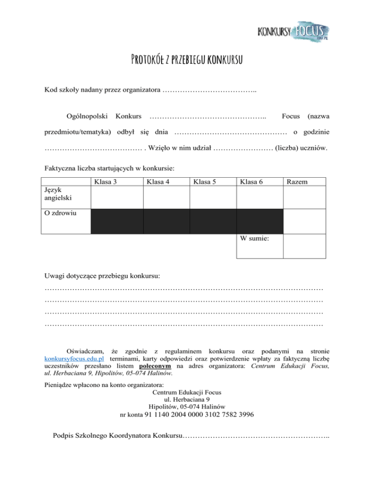Protokół z przebiegu konkursu Kod szkoły nadany przez organizatora ……………………………….. Ogólnopolski Konkurs ……………………………………….. Focus (nazwa przedmiotu/tematyka) odbył się dnia ……………………………………… o godzinie ………………………………… . Wzięło w nim udział …………………… (liczba) uczniów. Faktyczna liczba startujących w konkursie: Klasa 3 Klasa 4 Klasa 5 Klasa 6 Razem Język angielski O zdrowiu W sumie: Uwagi dotyczące przebiegu konkursu: ………………………………………………………………………………………………… ………………………………………………………………………………………………… ………………………………………………………………………………………………… ………………………………………………………………………………………………… Oświadczam, że zgodnie z regulaminem konkursu oraz podanymi na stronie konkursyfocus.edu.pl terminami, karty odpowiedzi oraz potwierdzenie wpłaty za faktyczną liczbę uczestników przesłano listem poleconym na adres organizatora: Centrum Edukacji Focus, ul. Herbaciana 9, Hipolitów, 05-074 Halinów. Pieniądze wpłacono na konto organizatora: Centrum Edukacji Focus ul. Herbaciana 9 Hipolitów, 05-074 Halinów nr konta 91 1140 2004 0000 3102 7582 3996 Podpis Szkolnego Koordynatora Konkursu………………………………………………….. Instrukcja 1. Konkursy odbywają się w terminach: • Ogólnopolski Konkurs Języka Angielskiego „Focus – Autumn 2015” – 03.11.2015 r. • Ogólnopolski Konkurs Języka Angielskiego „Focus – Winter 2016” 12.01.2016 r. • Ogólnopolski Konkurs Języka Angielskiego „Focus – Spring 2016” – 15.03.2016 r. • Ogólnopolski Konkurs „O Zdrowiu” Focus – 16.03.2016 r. 2. Godzinę przeprowadzenia konkursu Szkolny Koordynator Konkursu ustala sam. 3. Czas przewidziany na przeprowadzenie konkursu to 60 min wraz z czasem na sprawy organizacyjne. 4. Odpowiedzi udziela się na karcie odpowiedzi niebieskim lub czarnym długopisem, poprzez zamalowanie kółka oznaczającego prawidłową odpowiedź. 5. Po otrzymaniu karty odpowiedzi uczniowie wpisują swoje dane osobowe, klasę oraz kod szkoły nadany przez organizatora. Następnie należy przedstawić uczniom zasady punktacji. 6. Konkurs składa się z 30 pytań i jest testem wielokrotnego wyboru, gdzie jedna, dwie, trzy lub cztery odpowiedzi są prawidłowe. 7. Każda poprawna odpowiedź jest warta 1 punkt. Za udzielenie błędnej odpowiedzi uczestnik otrzymuje -1 punkt. Na każde pytanie musi zostać udzielona odpowiedź. Jeśli uczestnik nie zaznaczy żadnej odpowiedzi jest to traktowane jak udzielenie samych błędnych odpowiedzi (-4 punkty). 8. Każdy uczestnik zaczyna rozwiązywanie testu z pulą 120 punktów. Maksymalna liczba punktów do zdobycia to 240 punktów. 9. Zapieczętowaną kopertę z arkuszami konkursowymi należy otworzyć dopiero po podpisaniu przez uczniów kart odpowiedzi oraz wyjaśnieniu sposobu punktowania. 10. Uczestnicy rozwiązują zadania samodzielnie. Niedozwolone jest korzystanie podczas konkursu z urządzeń elektronicznych ani innych pomocy dydaktycznych. 11. Organizator zastrzega sobie prawo do przeprowadzenia testu kontrolnego lub dyskwalifikacji w przypadku wyników wskazujących na brak samodzielnej pracy uczestników. 12. Wysokość wpisowego zależy od liczby startujących w konkursie: 8,50 zł – w przypadku, gdy szkoła zgłosi od 10-29 uczestników 8,00 zł – w przypadku, gdy szkoła zgłosi od 30-49 uczestników 7,50 zł – w przypadku, gdy szkoła zgłosi powyżej 50 uczestników. 13. Faktyczna liczba uczestników nie może być mniejsza o więcej niż 10% w stosunku do liczby zgłoszonych. 14. Jeśli liczba uczestników jest większa niż podana w zgłoszeniu istnieje możliwość dokserowania testów oraz kart odpowiedzi. 15. Wyniki konkursu wraz z dyplomami oraz nagrodami organizator zobowiązuje się przekazać do szkół w ciągu dwóch miesięcy od przeprowadzenia konkursu. 16. Wyniki konkursu są ostateczne i nie podlegają odwołaniu. 17. Materiały konkursowe przechowywane są przez okres trzech miesięcy od terminu przeprowadzenia konkursu.