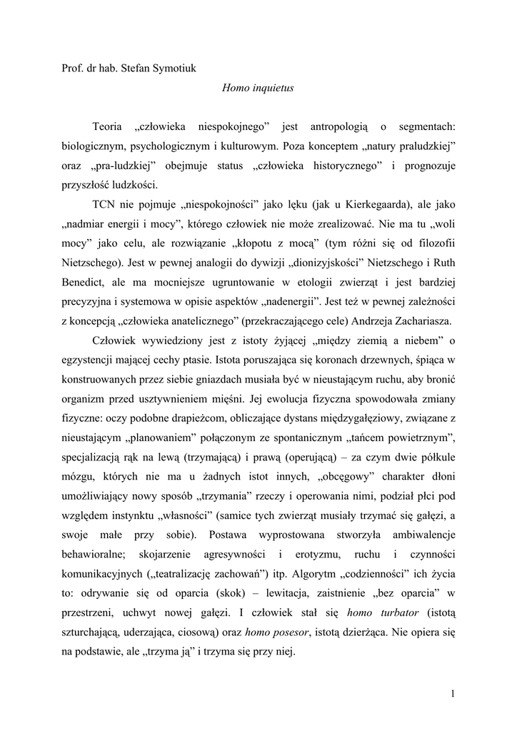 Prof. dr hab. Stefan Symotiuk Homo inquietus Teoria „człowieka niespokojnego” jest antropologią o segmentach: biologicznym, psychologicznym i kulturowym. Poza konceptem „natury praludzkiej” oraz „pra-ludzkiej” obejmuje status „człowieka historycznego” i prognozuje przyszłość ludzkości. TCN nie pojmuje „niespokojności” jako lęku (jak u Kierkegaarda), ale jako „nadmiar energii i mocy”, którego człowiek nie może zrealizować. Nie ma tu „woli mocy” jako celu, ale rozwiązanie „kłopotu z mocą” (tym różni się od filozofii Nietzschego). Jest w pewnej analogii do dywizji „dionizyjskości” Nietzschego i Ruth Benedict, ale ma mocniejsze ugruntowanie w etologii zwierząt i jest bardziej precyzyjna i systemowa w opisie aspektów „nadenergii”. Jest też w pewnej zależności z koncepcją „człowieka anatelicznego” (przekraczającego cele) Andrzeja Zachariasza. Człowiek wywiedziony jest z istoty żyjącej „między ziemią a niebem” o egzystencji mającej cechy ptasie. Istota poruszająca się koronach drzewnych, śpiąca w konstruowanych przez siebie gniazdach musiała być w nieustającym ruchu, aby bronić organizm przed usztywnieniem mięśni. Jej ewolucja fizyczna spowodowała zmiany fizyczne: oczy podobne drapieżcom, obliczające dystans międzygałęziowy, związane z nieustającym „planowaniem” połączonym ze spontanicznym „tańcem powietrznym”, specjalizacją rąk na lewą (trzymającą) i prawą (operującą) – za czym dwie półkule mózgu, których nie ma u żadnych istot innych, „obcęgowy” charakter dłoni umożliwiający nowy sposób „trzymania” rzeczy i operowania nimi, podział płci pod względem instynktu „własności” (samice tych zwierząt musiały trzymać się gałęzi, a swoje małe behawioralne; przy sobie). skojarzenie Postawa wyprostowana agresywności i stworzyła erotyzmu, ruchu ambiwalencje i czynności komunikacyjnych („teatralizację zachowań”) itp. Algorytm „codzienności” ich życia to: odrywanie się od oparcia (skok) – lewitacja, zaistnienie „bez oparcia” w przestrzeni, uchwyt nowej gałęzi. I człowiek stał się homo turbator (istotą szturchającą, uderzająca, ciosową) oraz homo posesor, istotą dzierżąca. Nie opiera się na podstawie, ale „trzyma ją” i trzyma się przy niej. 1 1. Po zejściu z drzewa wystąpiła u tej istoty „zbędność rąk”: aby podtrzymać ich nawyk i towarzyszące mu poczucie bezpieczeństwa, praczłowiek zaczął stale nosić coś w dłoni (kamień, kij), tworząc „własność ruchomą”, której nie znają żadne inne istoty, i stał się „kolekcjonerem rzeczy”. Otoczył się ścianą narzędzi oddzielającą go od przyrody. Całe istnienie człowieka prehistorycznego i nowoczesnego to „wtulanie się” w futerały społeczne i przedmiotowe, przy nieustającym odczuwaniu dyskomfortu, niewygody, uwierania tych futerałów i potrzebie zmiany siedzib, przemeblowań, przenosin itp. 2. Człowiek prehistoryczny istniał w trzech stadiach „partnerstwa” z rzeczami: łowczej, gdy nieustannie (po zdobyciu ognia) poluje i zabija, tworząc luźne, wolne watahy; nomadycznej, gdy oswaja konia, towarzysząc stadom zwierząt traktowanym jak ruchoma spiżarnia; hodowlanej, gdy osiada w kotlinach górskich i buduje osady, dostarczając pokarm na zimę swoim zwierzętom. Są to etnologiczne „strategie egzystencjalne”, obrastające mentalną obyczajowością, mającą późniejsze reperkusje w świecie historycznym: przestępczość, wojowniczość, skłonność do wędrowania oraz trend do domatorstwa. Indywiduum istnieje incydentalnie; jednostka jest wchłonięta przez ród, płcie są izolowane w sensie przestrzeni (ginecea dla kobiet), samotna jednostka pojawia się przy wojnach, epidemiach itp., chwilowo rozbijających rody i implikujących sieroctwo. 3. Czasy historyczne to stadium „mineralne” dziejów. Z epoki hodowlanej (faunicznej) wyłania się epoka „floralna” – gdy ziarno roślin daje pewniejszą egzystencję, gdyż nie psuje się jak mięso i daje ciągły strumień pożywienia we wszystkich porach roku. Hodowcy roślin (szczególnie ryżu) muszą być „kulturalni”, to jest muszą wymyślić relację „służby silnego – słabszemu”. Bez pielęgnowania słabego (rośliny) silny człowiek pozostaje bez pokarmu. Wytwarza to demograficznie wielkie, ale delikatne, wyrafinowane, subtelne „futerały egzystencjalne”: posługiwanie się kruchymi przedmiotami „uczącymi” ostrożności niezbędnej przy ciągłym sadzeniu i zbiorze ryżu (porcelana, jedwab, papier, pałeczki do jedzenia, pędzelki do pisania, wachlarze, słomiane kapelusze, ziołolecznictwo, tonizujące używki: herbata, opium, dżudo jako walka obezwładniająca, latawce jako zabawka dla dzieci, tortury „kropli wody” jako kara dla przestępców, sztuka ogrodów itp.). 2 Zachodnia przestrzeń dziejów rozwinęła zaś z hodowli „formację mineralną” (cmentarną). Zimny klimat zmusił do palenia drewna, torfu, węgla i budowy kamiennych domostw, nierówny teren – do budowy mostów, kamienista gleba – do orki i wybierania kamieni, potem zaś – do wytopu metali i kowalstwa. Człowiek zafascynował się naturą „świata martwego”, obrabiając go, miniaturyzując i tworząc układy części (maszyny). Zaistniała poczwórna miniaturyzacja: ziemi, gdyż łatwiej było uprawiać drobne parcele, a nie plantacje rodowe; rodów, gdyż brak surowca zmuszał do oszczędności; znaków, gdyż proste symbole mogły być powszechnie użyteczne (liternictwo, cyfry, herby itp.). Więź z materią martwą miała też sens schładzający namiętności zbytniego zbliżenia płci i pokoleń w „ścisku mieszkalnym” odrębnych domostw rodzinnych. Uznajemy tu tezy Westermarcka o rodzinnej katastrofie kazirodczej, implikowanej zanikiem dystansu, zwłaszcza przez długie miesiące zimowe, kiedy erotyzm musi być schłodzony przez 