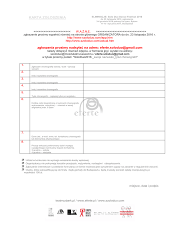 KARTA ZGŁOSZENIA ELIMINACJE: Solo Duo Dance Festival 2016 do 23 listopada 2016_zgłoszenia 3-4 grudnia 2016 pokazy na żywo, Bytom 11-15 stycznia 2017, Budapeszt <<<<<<<<<<<<<<<<<<<<<< W.A.Ż.N.E. >>>>>>>>>>>>>>>>>>>>>>>>>>>>>> zgłoszenie prosimy wypełnić również na stronie głównego ORGANIZATORA do dn. 23 listopada 2016 r. http://www.szoloduo.com/app.htm http://www.szoloduo.com/actual.htm zgłoszenia prosimy nadsyłać na adres: [email protected] należy dołączyć również zdjęcia, w formacie jpg i wysłać na adresy: [email protected] / [email protected] w tytule prosimy podać: "SoloDuo2016 _swoje nazwisko_tytul choreografii" 1. Zgłaszam choreografię solową / duet * (proszę wpisać) 2. Imię i nazwisko choreografa 3. Imię i nazwisko choreografa 4. Imię i nazwisko choreografa 5. Tytuł choreografii – najlepiej tylko po angielsku 6. Krótkie notki biograficzne o twórcach (choreografa, wykonawców, muzyków) – również w wersji angielskiej max. 6 zdań 7. Dane (tel., e-mail, www, tel. kontaktowy choreografa lub kierownika artystycznego) 8. Proszę wskazać preferowany dzień występu uwzględniając ewentualny dojazd do Bytomia. 3 grudnia – sobota 4 grudnia – niedziela Udział w konkursie nie wymaga wniesienia kwoty wpisowej. Organizatorzy nie pokrywają kosztów przejazdu, wyżywienia, noclegów i ubezpieczenia. Zgłoszenie internetowe i przesłanie formularza w formie mailowej jest wyrażeniem zgody na zawarte w regulaminie warunki. Osoby, które zakwalifikują się do finału i będą jechały do Budapesztu, będą musiały ponieść opłatę manipulacyjną w wysokości 100 zł. miejsce, data i podpis teatrrozbark.pl / www.eferte.pl / www.szoloduo.com W ramach eliminacji, zachęcamy również do wzięcia udziału w ogólnopolskich warsztatach tańca współczesnego w dniach 3 – 4 grudnia 2016 pt.: Ciało / Medium, które prowadzone są przez zespół Bytomskiego Teatru Tańca i Ruchu Rozbark (odpłatne / szczegóły będą podane bezpośrednio na stronie www.teatrrozbark.pl). Dodatkowo zostanie zaprezentowany spektakl w chor. Anny Piotrowskiej pt.: „Podziemne słońca”. (dla uczestników warsztatów na przedstawienie wstęp wolny, dla uczestników Eliminacji Solo Duo wejściówki w cenie 10 zł) organizatorzy: Bytomski Teatr Tańca i Ruchu ROZBARK eferte_ Fundacja Rozwoju Tańca Fundacja Orkesztika REGULAMIN Instytut Polski (Budapeszt) Cel festiwalu: pobudzanie kreatywności tancerzy i choreografów, poszukiwanie krótkich, nowych i ciekawych form tańca współczesnego. Najlepsze spektakle (etiudy), wyłonione podczas pokazów studyjnych na żywo przez jury zostaną nagrodzone poprzez zaproszenie do prezentacji w międzynarodowym konkursie tańca współczesnego „SoloDuo Dance Festival_Budapest_2017”. Pierwsza edycja SoloDuo odbyła się w 2000 r. w Budapeszcie. Festiwal jest międzynarodową platformą małych form tańca współczesnego, na której prezentują się tancerze i choreografowie m.in. z Węgier, Polski, Czech, Szwecji, Rosji, Portugalii, Francji, Holandii, Belgii, Niemiec, Meksyku, Korei, Izraela, Turcji, Austrii. Festiwal wciąż się rozwija. Od kilku lat tworzone są półfinały (Polska, Czechy, Niemcy, Węgry) Najbliższa edycja Festiwalu (styczeń 2017 r.), odbywa się w Mu Theatre w Budapeszcie. Rywalizować ze sobą będzie ok. 30 choreografii. Przedstawienia zostaną ocenione przez międzynarodowe jury i kwalifikowane do wieczoru finałowego. Sam występ w tych miejscach, przy profesjonalnej obsłudze jest ogromnym wyróżnieniem i zdobyciem niecodziennego doświadczenia. Artyści z Polski, którzy zakwalifikują się do finału w Budapeszcie – dzięki współpracy Fundacji Rozwoju Tańca z Instytutem Polskim w Budapeszcie – mogą mieć zapewniony przejazd w obie strony (Warszawa lub Katowice-Budapeszt-Warszawa lub Katowice), jak również noclegi. Finał w Budapeszcie odbędzie się w terminie: 11 -15 stycznia 2017 r. Regulamin: Nie dopuszcza się prac improwizowanych i przedstawianych już wcześniej na festiwalu. Uczestnicy muszą mieć 18 lat. Długość solowych prac nie może być dłuższa niż 6 minut, a duety mogą trwać do 9 minut. Przekroczenie limitu dyskwalifikuje daną prezentację. Rekwizyty i instrumenty mogą być używane w przedstawieniu, ale tylko gdy ich instalacja nie zajmuje więcej niż 30 s. Rekwizyty typu: świece, woda, farby, brokat, które mogą uszkodzić i poplamić podłogę baletową są zabronione. Uczestnicy są zobowiązani przesłać: pocztą mailową: [email protected] - kartę zgłoszenia, informacje o artystach wraz ze zdjęciem i link z pracą. Uczestnicy muszą do dnia 23 listopada 2013 zarejestrować się również na stronie http://www.szoloduo.com/app.htm Wszyscy uczestnicy przyjeżdżają do BYTOMIA na koszt własny (lub instytucji delegującej) i powinni być ubezpieczeni. Organizatorzy zastrzegają sobie prawo rejestracji video, wykonywania zdjęć w trakcie warsztatów i podczas pokazu przez Organizatora i media. Materiały będą promować działalność Bytomskiego Teatru Tańca i Ruchu ROZBARK i Fundacji Rozwoju Tańca i będą dokumentacją zrealizowanego projektu. Uczestnictwo w festiwalu jest potwierdzeniem zgody na ww. warunki. Organizator zastrzega sobie prawo do wszelkich zmian z przyczyn niezależnych. Kryteria oceny jury: jakość i fantazja świadomość przestrzeni i widza struktura przedstawienia: umiejętności: choreografia, jakość ruchu i doboru muzyki muzykalność a ruch dramaturgia: znaczenie, historia wizualizacja: kostium, charakteryzacja, rekwizyt, wykorzystanie światła, spójność z treścią, scenografia duety – współpraca pomiędzy artystami na scenie Kategoria wiekowa Powyżej 18 lat. Termin i miejsce ELIMINACJE do International Solo Duo Dance Festival odbędą na scenie Bytomskiego Teatru Tańca i Ruchu ROZBARK (ul. Kilara 29, 41-902 Bytom) zgłoszenia do 23 listopada 2016 (i koniecznie na stronach www.szoloduo.com) linki do video nale
