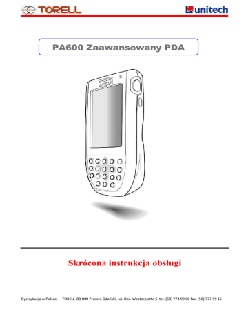 PA600 Zaawansowany PDA Skrócona instrukcja obsługi Dystrybucja w Polsce: TORELL 83-000 Pruszcz Gdański, ul. Obr. Westerplatte 5 tel. (58) 773 99 00 fax. (58) 773 99 15 Widok z przodu urządzenia 1 2 3 4 Kontrolka stanu urządzenia Lewy przycisk skanowania Włącznik Mikrofon 5 6 7 8 Złącze uniwersalne Klawiatura Ekran dotykowy LCD Głośniczek Pierwsze uruchomienie PA600 Po 12-godzinnym cyklu ładowania akumulatorów, terminal będzie gotowy do uruchomienia - przy czym należy bezwzględnie pamiętać o włączeniu baterii backup’owej. Teraz można włączyć urządzenie, dokonać kalibracji wyświetlacza, ustawić datę i godzinę oraz strefę czasową. Włączenie i wyłączenie 1. Włączenie i wyłączenie PA600 odbywa się poprzez naciśnięcie przcisku „power” (3) umiejscowionego z lewej strony klawiatury, na przedniej części obudowy . Dystrybucja w Polsce: TORELL 83-000 Pruszcz Gdański, ul. Obr. Westerplatte 5 tel. (58) 773 99 00 fax. (58) 773 99 15 Widok od tyłu 9 Komora akumulatora 10 Zatrzask osłony akumulatora 11 Przycisk resetowania 12 Pasek elastyczny 13 Głośnik 14 Zaczep paska Dystrybucja w Polsce: 15 Slot kart pamięci SD 16 Skaner laserowy 17 Wyjście słuchawkowe 18 Rysik 19 Prawy przycisk skanowania 20 Port podczerwieni (IR) TORELL 83-000 Pruszcz Gdański, ul. Obr. Westerplatte 5 tel. (58) 773 99 00 fax. (58) 773 99 15 Instalowanie akumulatorów 1 Otwarcie komory akumulatora następuje po przesunięciu zatrzasku (zgodnie z kierunkiem strzałki na poniższym rysunku) i podniesieniu osłony Styki zasilania Foliowy element ułatwiający operacje montażu/demontażu akumulatora Uchwyt zabezpieczający 2 Przed wsunięciem akumulatora należy zwrócić uwagę na pozycję jego styków, następnie należy go ułożyć pod kątem na folii i wsunąć w głąb komory przytrzymując jednocześnie końcówkę folii by wystawała poza obręb obudowy 3 Jeśli akumulator jest właściwie ułożony, wystarczy pchnąć go do dołu, do momentu zatrzaśnięcia uchwytu zabezpieczającego akumulator przed wysunięciem Foliowy element ułatwiający montaż akumulatora 4 Ostatnią operacją jest zamknięcie klapki osłaniającej komorę akumulatora Dystrybucja w Polsce: TORELL 83-000 Pruszcz Gdański, ul. Obr. Westerplatte 5 tel. (58) 773 99 00 fax. (58) 773 99 15 Ładowanie kolektora 1 Szerszą końcówkę przewodu USB należy wpiąć do złącza znajdującego się w dolnej krawędzi obudowy (1). 2 3 Do drugiej końcówki należy wpiąć wtyk bananowy zasilacza (2). Ostatnią czynnością jest wpięcie zasilacza do gniazda sieciowego 230V (3). Uwaga: Urządzenie jest wyposażone w wewnętrzny akumulator zapasowy, którego zadaniem jest podtrzymanie danych przechowywanych w pamięci RAM. Należy jednak pamiętać, że podtrzymanie pamięci wystarcza na maksymalnie 2 godziny i przed upływem tego czasu należy bezwzględnie wymienić akumulator główny lub podłączyć kolektor do ładowania. Karty pamięci SD/MMC 1 Aby zainstalować kartę pamięci, należy najpierw odkręcić dwie niewielkie śrubki i zdjąć osłonę slotu kart SD. 2 Następnie należy wsunąć kartę w slot i zamontować osłonę. Jeśli kolektor będzie w tym czasie włączony, system potwierdzi poprawną instalację pamięci charakterystycznym dźwiękiem. Dystrybucja w Polsce: TORELL 83-000 Pruszcz Gdański, ul. Obr. Westerplatte 5 tel. (58) 773 99 00 fax. (58) 773 99 15 Klawiatura i klawisze funkcyjne Jeśli zostanie wciśnięty klawisz FUNC na pasku zadań pojawi się ikona informacyjna Klawiatura zacznie aktywować funkcje opisane na zielono: Klawisz włącz/wyłącz Klawisz FUNKCJI. Cyfra 1, Lewy „soft-key”. Tabulator, Kl. Windows. Cyfra 2, Strzałka w górę. Cyfra 7, Kl. zm. jasności Cyfra 3, Prawy „soft-key”. Cyfra 8, Strzałka w dół. ENTER, OK. Cyfra 9, Kl. zw. jasności. Backspace, ESC. Klawisz włącz litery Cyfra 4, Strzałka w lewo. ENTER, OK. Cyfra 5, Cyfra 0, Spacja. Cyfra 6, Strzałka w prawo. Cyfra 1, Kl. Windows. Dystrybucja w Polsce: TORELL 83-000 Pruszcz Gdański, ul. Obr. Westerplatte 5 tel. (58) 773 99 00 fax. (58) 773 99 15 Kalibracja ekranu dotykowego PA600 Kalibracja ekranu dotykowego powinna odbyć się przy pierwszym uruchomieniu systemu Windows Mobile, może się również pojawić po całkowitym resecie terminala. 1 Kalibracji dokonujemy przy pomocy rysika znajdującego się na tylnej ściance PA600 2 W obrębie ekranu (na środku i po rogach) znacznie się pojawiać krzyżyk. 3 Należy lekko przyciskać lub stukać w środek krzyżyka aż do zakończenia kalibracji. Uwaga: Jeśli ekran zachowuje się nieprecyzyjnie, należy ponownie dokonać jego kalibracji. W tym celu należy otworzyć zakładkę ustawień systemowych „System Settings” i uruchomić aplikację kalibrującą „Align Screen” English Dystrybucja w Polsce: TORELL 83-000 Pruszcz Gdański, ul. Obr. Westerplatte 5 tel. (58) 773 99 00 fax. (58) 773 99 15
