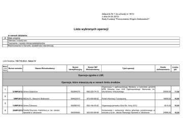 Załącznik Nr 1 do uchwały nr 19/12 z dnia 04.04.2012r. Rady Fundacji "Porozumienie Wzgórz Dalkowskich" Lista wybranych operacji X w ramach działania: Małe projekty Odnowa i rozwój wsi Tworzenie i rozwój mikroprzedsiębiorstw RóŜnicowanie w kierunku działalności nierolniczej Limit Środków: 728 170,39 zł - Nabór IV Miejsc e na liście. Numer wniosku Nazwa Wnioskodawcy Numer Identyfikacyjny Numer NIP Wnioskodwacy Tytuł operacji Kwota dofinasowania Liczba pkt Operacje zgodne z LSR. Operacje, które mieszczą się w ramach limitu środków. 062564275 692-225-74-72 Organizacja V ogólnopolskiego Maratonu w kolarstwie górskim MTB Obiszów oraz XXII Ogólnopolskiego Memoriału im. Grundmana i Wizowskiego 064923015 973-000-68-82 Portal Informacji Turystycznej. 13/MP/2012 Gmina śukowice 062686153 693-194-05-82 Organizacja jarmarku-Góra Św. Anny 2012. 26/MP/2012 Parafia Rzymsko- Katolicka p.w. św. Jakuba Apostoła w Jakubowie. 065354640 502-003-69-89 Konserwacja i restauracja ołtarza głównego posoborowego w kościele p.w.św. Jakuba Starszego Apostoła w Jakubowie. 1 37/MP/2012 Gmina Grębocice 25000,00 11,00 10600,00 10,80 4515,00 10,00 24999,00 10,00 2 5/MP/2012 MEGA.PL- Sławomir Białkowski 3 4 5 36/MP/2012 Gmina Grębocice 062564275 692-225-74-72 Lato z kolarstwem na Wzgórzach Dalkowskich 25000,00 10,00 1/MP/2012 Stowarzyszenie Aktywnych Kobiet "Pobudka". 067217454 924-188-12-25 Tradycja w potrawach zapisana- zakup mebli gastronomicznych do kuchni w swietlicy wiejskiej we wsi Sucha Dolna. 9310,00 9,00 Parafia Rzymskokatolicka pw. Wniebowzięcia 3/MP/2012 Najświętrzej Maryi Panny 067231653 924-176-91-78 Konserwacja i restauracja zabytkowego ołtarz p.w.św Józefa, wcześniej św. Jana Nepomucena 25000,00 9,00 Parafia Rzymskokatolicka pw. Wniebowzięcia 4/MP/2012 Najświętrzej Maryi Panny 067231653 924-176-91-78 Konserwacja i restauracja ołtarza bocznego p.w. Matki BoŜej RóŜancowej. 25000,00 9,00 7/MP/2012 MAX BOXING KLUB 063975480 925-207-19-90 Gala Sportów Walki CHAMPIONSHIP" 25000,00 9,00 9/MP/2012 Gmina Brzeźnica 062519585 924-186-85-55 Na góralską nutę. 21177,80 9,00 12/MP/2012 Gmina Radwanice 062326382 692-225-64-90 Zakup wyposaŜenia nagłaśniającego na potrzeby organizacji imprez społeczno-kulturalnych w Gminie Radwanice. 25000,00 9,00 14/MP/2012 Gmina śukowice 062686153 693-194-05-82 Utworzenie internetowej bazy zabytków Gminy śukowice na stronie www.zukowice.pl 4900,00 9,00 20/MP/2012 Gmina Bytom Odrzański 062074863 925-195-86-91 Budowa kulturalno- historycznejściezki dydaktycznej po Bytomiu Odrzańskim- I etap. 20667,23 9,00 21/MP/2012 Dom Kultury "Jowisz". 062741475 693-124-63-73 Festyn integracyjny połączony z Festiwalem Piosenki Osób Niepełniosprawnych " Śpiewaj z Nami". 7442,00 9,00 22/MP/2012 Gmina Gaworzyce 062727195 692-225-51-54 Remont wraz z modernizacją świetlicy wiejskiej w Dzikowie. 25000,00 9,00 27/MP/2012 Filipska Maria 065082603 924-185-38-03 Wycieczki wozem wieloosobowym. 23550,71 9,00 Parafia Rzymsko-Katolicka św. Jana Chrzciciela w 34/MP/2012 Grodowcu 067290936 693-114-69-38 Organizacja II Zaduszek Barkowych w Sanktuarium Matki BoŜej Grodowieckiej. 19950,00 9,00 Parafia Rzymskokatolicka pw. Wniebowzięcia 38/MP/2012 Najświętrzej Maryi Panny 067231653 924-176-91-78 Konserwacja i restauracja ołtarza bocznego p.w. Jezusa Miłośiernego /Miłosierdzia BoŜego. 19000,00 9,00 Parafia Rzymskokatolicka pw. Wniebowzięcia 39/MP/2012 Najświętrzej Maryi Panny. 067231653 924-176-91-78 Konserwacja i restauracja poszczegółnych figur wchodzących w skład ołtarza p.w. Matki BoŜej Nieustającej Pomocy. 25000,00 9,00 6 7 8 9 "M.F.C. MAKOWSKI FIGHTING 10 11 12 13 14 15 16 17 18 19 20 18/MP/2012 Gmina śukowice 062686153 693-194-05-82 32/MP/2012 Parafia Rzymsko-Katolicka św. Michała Archanioła 067291294 502-004-00-86 067207513 929-117-12-24 Remont świetlicy wiejskiej w Nielubi - Gmina śukowice. Wykonanie prac renowacyjnych i konserwatorskich przy zabytkowym obrazie " Ostatnia Wieczerza" w kościele paraf. pw Michała Archanioła w Kwielicach Realizacja i publikacja filmów: " Gmina KoŜuchów zaprasza", "Gmina Nowe Miasteczko zaprasza" i "Gmina Bytom Odrzański zaprasza". 6377,00 8,93 25000,00 8,87 14600,00 8,00 11/MP/2012 Gmina śukowice 062686153 693-194-05-82 DoposaŜenie świetlic wiejskich w m. Domianiowice, Kamiona ,Kłoda - Gmina śukowice. 8821,00 8,00 17/MP/2012 Gmina śukowice 062686153 693-194-05-82 Tablice informacyjno-turystyczne w kaŜdej mirjscowości gminy śukowice, jako element promocji Wzgórz Dalkowskich. 17976,00 8,00 23/MP/2012 Nowaczyk Waldemar 053081291 925-001-45-45 Remont zabytkowego dachu na budynku wpisanym do rejestru zabytków pod nr 1373. 25000,00 8,00 31/MP/2012 Betiuk Krystyna 050724306 925-149-38-32 Warsztaty Ceramiczne- DZIEJE CYWILIZACJI. 15163,00 8,00 Parafia Rzymsko-Katolicka św. Jana Chrzciciela w 33/MP/2012 Grodowcu 067290936 693-114-69-38 Powstanie Domu Pielgrzyma przy Sanktuarium Matki BoŜej Grodowieckiej etap II. 24500,00 7,13 2/MP/2012 Muszkieta Władysław 065374730 925-131-70-58 Remont dachu na budynku zabytkowym. 25000,00 7,00 8/MP/2012 Gmina Jerzmanowa 063049686 693-194-05-24 WyposaŜenie swietlicy w Maniowie-centrum zintegrowanego społeczeństwa lokalnego. 8960,57 7,00 10/MP/2012 Siwak Anna 043719211 925-175-00-16 Remont dachu stodoły. 20175,76 7,00 15/MP/2012 Gmina śukowice 062686153 693-194-05-82 25000,00 7,00 24/MP/2012 Mazurek Radosław 067280266 925-191-40-96 13847,00 7,00 067280545 925-149-39-50 Remont świetlicy wiejskiej w Brzegu Głogowskim- Gmina śukowice wyposazenie budynku znajdującego się w Borowie wielkim, gmina Nowe miasteczko w system kolektorów słonecznych z zasobnikiem wody. WyposaŜenie budynku znajdującego się na działce nr 535 we Wsi Rejów, Gmina Nowe Miasteczko w system kolektorów słonecznych z zasobnikiem wody. 13780,00 7,00 039818285 925-131-95-02 Miejsce wypoczynkowo-rekreacyjne - budowa drewnianej wiaty turystycznej. 20689,76 7