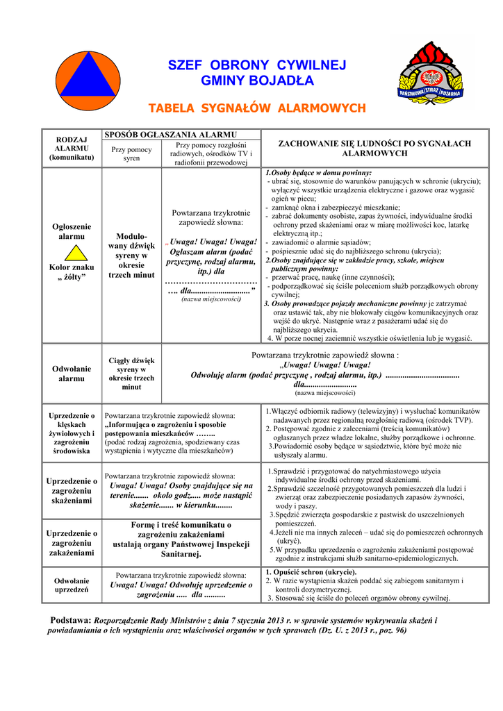 SZEF OBRONY CYWILNEJ GMINY BOJADŁA TABELA SYGNAŁÓW ALARMOWYCH RODZAJ ALARMU (komunikatu) Ogłoszenie alarmu Kolor znaku „ żółty” Odwołanie alarmu Uprzedzenie o klęskach żywiołowych i zagrożeniu środowiska Uprzedzenie o zagrożeniu skażeniami Uprzedzenie o zagrożeniu zakażeniami Odwołanie uprzedzeń SPOSÓB OGŁASZANIA ALARMU Przy pomocy syren Modulowany dźwięk syreny w okresie trzech minut Ciągły dźwięk syreny w okresie trzech minut Przy pomocy rozgłośni radiowych, ośrodków TV i radiofonii przewodowej ZACHOWANIE SIĘ LUDNOŚCI PO SYGNAŁACH ALARMOWYCH 1.Osoby będące w domu powinny: - ubrać się, stosownie do warunków panujących w schronie (ukryciu); wyłączyć wszystkie urządzenia elektryczne i gazowe oraz wygasić ogień w piecu; - zamknąć okna i zabezpieczyć mieszkanie; Powtarzana trzykrotnie - zabrać dokumenty osobiste, zapas żywności, indywidualne środki zapowiedź słowna: ochrony przed skażeniami oraz w miarę możliwości koc, latarkę elektryczną itp.; „Uwaga! Uwaga! Uwaga! - zawiadomić o alarmie sąsiadów; - pośpiesznie udać się do najbliższego schronu (ukrycia); Ogłaszam alarm (podać przyczynę, rodzaj alarmu, 2.Osoby znajdujące się w zakładzie pracy, szkole, miejscu publicznym powinny: itp.) dla przerwać pracę, naukę (inne czynności); …………………………… - podporządkować się ściśle poleceniom służb porządkowych obrony …. dla............................” cywilnej; (nazwa miejscowości) 3. Osoby prowadzące pojazdy mechaniczne powinny je zatrzymać oraz ustawić tak, aby nie blokowały ciągów komunikacyjnych oraz wejść do ukryć. Następnie wraz z pasażerami udać się do najbliższego ukrycia. 4. W porze nocnej zaciemnić wszystkie oświetlenia lub je wygasić. Powtarzana trzykrotnie zapowiedź słowna : „Uwaga! Uwaga! Uwaga! Odwołuję alarm (podać przyczynę , rodzaj alarmu, itp.) ................................... dla......................... Powtarzana trzykrotnie zapowiedź słowna: „Informująca o zagrożeniu i sposobie postępowania mieszkańców …….. (podać rodzaj zagrożenia, spodziewany czas wystąpienia i wytyczne dla mieszkańców) Powtarzana trzykrotnie zapowiedź słowna: Uwaga! Uwaga! Osoby znajdujące się na terenie....... około godz..... może nastąpić skażenie....... w kierunku........ Formę i treść komunikatu o zagrożeniu zakażeniami ustalają organy Państwowej Inspekcji Sanitarnej. Powtarzana trzykrotnie zapowiedź słowna: Uwaga! Uwaga! Odwołuję uprzedzenie o zagrożeniu ..... dla .......... (nazwa miejscowości) 1.Włączyć odbiornik radiowy (telewizyjny) i wysłuchać komunikatów nadawanych przez regionalną rozgłośnię radiową (ośrodek TVP). 2. Postępować zgodnie z zaleceniami (treścią komunikatów) ogłaszanych przez władze lokalne, służby porządkowe i ochronne. 3.Powiadomić osoby będące w sąsiedztwie, które być może nie usłyszały alarmu. 1.Sprawdzić i przygotować do natychmiastowego użycia indywidualne środki ochrony przed skażeniami. 2.Sprawdzić szczelność przygotowanych pomieszczeń dla ludzi i zwierząt oraz zabezpieczenie posiadanych zapasów żywności, wody i paszy. 3.Spędzić zwierzęta gospodarskie z pastwisk do uszczelnionych pomieszczeń. 4.Jeżeli nie ma innych zaleceń – udać się do pomieszczeń ochronnych (ukryć). 5.W przypadku uprzedzenia o zagrożeniu zakażeniami postępować zgodnie z instrukcjami służb sanitarno-epidemiologicznych. 1. Opuścić schron (ukrycie). 2. W razie wystąpienia skażeń poddać się zabiegom sanitarnym i kontroli dozymetrycznej. 3. Stosować się ściśle do poleceń organów obrony cywilnej. Podstawa: Rozporządzenie Rady Ministrów z dnia 7 stycznia 2013 r. w sprawie systemów wykrywania skażeń i powiadamiania o ich wystąpieniu oraz właściwości organów w tych sprawach (Dz. U. z 2013 r., poz. 96)
