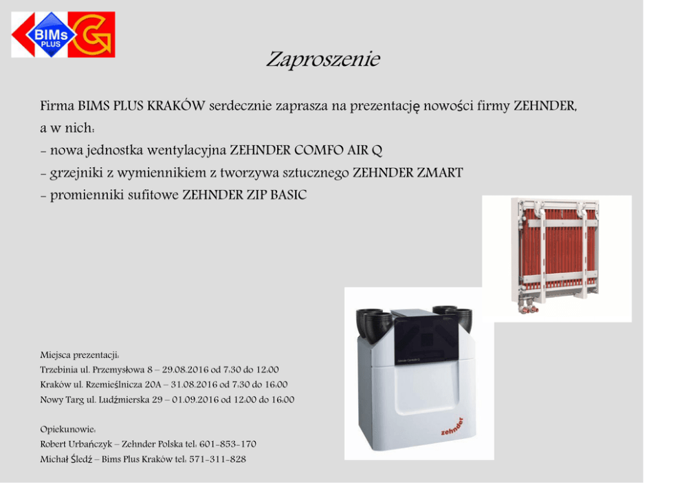 Zaproszenie Firma BIMS PLUS KRAKÓW serdecznie zaprasza na prezentację nowości firmy ZEHNDER, a w nich: - nowa jednostka wentylacyjna ZEHNDER COMFO AIR Q - grzejniki z wymiennikiem z tworzywa sztucznego ZEHNDER ZMART - promienniki sufitowe ZEHNDER ZIP BASIC Miejsca prezentacji: Trzebinia ul. Przemysłowa 8 – 29.08.2016 od 7:30 do 12:00 Kraków ul. Rzemieślnicza 20A – 31.08.2016 od 7:30 do 16:00 Nowy Targ ul. Ludźmierska 29 – 01.09.2016 od 12:00 do 16:00 Opiekunowie: Robert Urbańczyk – Zehnder Polska tel: 601-853-170 Michał Śledź – Bims Plus Kraków tel: 571-311-828