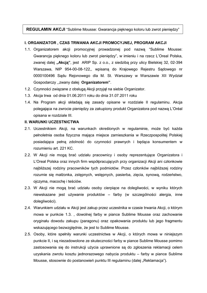 REGULAMIN AKCJI “Sublime Mousse: Gwarancja pięknego koloru lub zwrot pieniędzy” I. ORGANIZATOR , CZAS TRWANIA AKCJI PROMOCYJNEJ, PROGRAM AKCJI 1.1. Organizatorem akcji promocyjnej prowadzonej pod nazwą “Sublime Mousse: Gwarancja pięknego koloru lub zwrot pieniędzy”, w imieniu i na rzecz L’Oreal Polska, zwanej dalej „Akcją”, jest ARIP Sp. z o.o., z siedzibą przy ulicy Bielskiej 32, 02-394 Warszawa, NIP 954-00-08-122,, wpisaną do Krajowego Rejestru Sądowego nr 0000100496 Sądu Rejonowego dla M. St. Warszawy w Warszawie XII Wydział Gospodarczy ,,zwany dalej Organizatorem”. 1.2. Czynności związane z obsługą Akcji przyjął na siebie Organizator. 1.3. Akcja trwa od dnia 01.06.2011 roku do dnia 31.07.2011 roku 1.4. Na Program akcji składają się zasady opisane w rozdziale II regulaminu. Akcja polegająca na zwrocie pieniędzy za zakupiony produkt Organizatora pod nazwą L’Oréal opisana w rozdziale III. II. WARUNKI UCZESTNICTWA 2.1. Uczestnikiem Akcji, na warunkach określonych w regulaminie, moŜe być kaŜda pełnoletnia osoba fizyczna mająca miejsce zamieszkania w Rzeczpospolitej Polskiej posiadająca pełną zdolność do czynności prawnych i będąca konsumentem w rozumieniu art. 221 KC. 2.2. W Akcji nie mogą brać udziału pracownicy i osoby reprezentujące Organizatora i L’Oreal Polska oraz innych firm współpracujących przy organizacji Akcji ani członkowie najbliŜszej rodziny pracowników tych podmiotów. Przez członków najbliŜszej rodziny rozumie się małŜonka, zstępnych, wstępnych, pasierba, zięcia, synową, rodzeństwo, ojczyma, macochę i teściów. 2.3. W Akcji nie mogą brać udziału osoby cierpiące na dolegliwości, w wyniku których niewskazane jest uŜywanie produktów – farby (w szczególności alergia, inne dolegliwości). 2.4. Warunkiem udziału w Akcji jest zakup przez uczestnika w czasie trwania Akcji, o którym mowa w punkcie 1.3. , dowolnej farby w piance Sublime Mousse oraz zachowanie oryginału dowodu zakupu (paragonu) oraz opakowania produktu lub jego fragmentu wskazującego bezwzględnie, Ŝe jest to Sublime Mousse. 2.5. Osoby, które spełniły warunki uczestnictwa w Akcji, o których mowa w niniejszym punkcie II, i są niezadowolone ze skuteczności farby w piance Sublime Mousse pomimo zastosowania się do instrukcji uŜycia uprawnione są do zgłoszenia reklamacji celem uzyskania zwrotu kosztu jednorazowego nabycia produktu – farby w piance Sublime Mousse, stosownie do postanowień punktu III regulaminu (dalej „Reklamacja”). 2.6. Reklamacje powinny być przesyłane na adres databroker S.A.., z siedzibą przy ulicy Sengera Cichego 1, 02-790 Warszawa, w terminie 21 dni od dnia dokonania zakupu, jednak nie później niŜ 21 dni od daty zakończenia Akcji (decyduje data stempla pocztowego), przy czym Reklamacje muszą zostać przesłane listem poleconym. Reklamacje doręczone na adres databroker S.A.., z siedzibą przy ulicy Sengera Cichego 1, 02-790 Warszawa po dniu 21 sierpnia 2011 r. nie będą rozpatrywane pomimo ich prawidłowego wniesienia na poczcie. 2.7. Reklamacje rozpatruje Organizator. Rozpatrzeniu podlegają wyłącznie reklamacje zgłoszone w formie pisemnej za pośrednictwem Poczty Polskiej lub innych podmiotów świadczących usługi pocztowe na adres databroker S.A.., z siedzibą przy ulicy Sengera Cichego 1, 02-790 Warszawa, z dopiskiem “Sublime Mousse: Gwarancja pięknego koloru lub zwrot pieniędzy” Rozpatrzone przez Organizatora zostanie pierwsze 2 000 poprawnych Reklamacji, które wpłynęły na adres databroker S.A., z siedzibą przy ulicy Sengera Cichego 1, 02-790 Warszawa (decyduje data stempla pocztowego). III. REKLAMACJA Warunkiem przyjęcia Reklamacji będzie: wydrukowanie dostępnego na Stronie formularza, jego wypełnienie, i przesłanie na adres databroker S.A.., z siedzibą przy ulicy Sengera Cichego 1, 02-790 Warszawa wraz z paragonem i opakowaniem (lub jego fragmentem) reklamowanej farby w piance Sublime Mousse 3.1. Reklamacje muszą być sporządzone na specjalnym formularzu dostępnym na stronie internetowej www.lorealparis.pl (zwanej dalej „Strona”) i w kaŜdym wypadku powinny zawierać: a) Wypełniony i wydrukowany ze strony formularz uzupełniony o: - imię i nazwisko uczestnika, - adres zamieszkania uczestnika zawierający kod pocztowy, - numer telefonu kontaktowego uczestnika - adres mailowy uczestnika akcji - odcień zakupionej farby - opis przyczyny złoŜenia reklamacji z uzasadnieniem składającym się z minimum 20 wyrazów - zgodę uczestnika na przetwarzanie jego danych osobowych w celu realizacji Akcji, - własnoręczny podpis uczestnika Akcji, b) Dołączony oryginał paragonu sklepowego potwierdzającego zakup dowolnej farby w piance Sublime Mousse w okresie trwania Akcji zawierający datę zakupu, cenę, nazwę sklepu oraz farby w piance Sublime Mousse, stanowiące dowód nabycia przez uczestnika produktu, o którym mowa w pkt 2.4. c) Dołączone opakowanie (lub jego fragment) reklamowanej farby w piance Sublime Mousse 3.2. Nie będą rozpatrywane Reklamacje niekompletne, nieczytelne lub z innych przyczyn wadliwe, a w szczególności Reklamacje zawierające kopię dowodu nabycia produktu – farby w piance Sublime Mousse 3.3. Nie będą rozpatrywane Reklamacje zawierające dowody nabycia produktów – farby w piance Sublime Mousse, z których nie wynika, Ŝe farba w piance Sublime Mousse została nabyta w czasie trwania Akcji, o którym mowa w punkcie 1.3. 3.4. Przez cały czas trwania Akcji moŜe zostać uwzględniona jedna reklamacje pochodząca od jednego Uczestnika W przypadku przesłania więcej niŜ jednej Reklamacji od danego uczestnika rozpatrywana będzie tylko pierwsza otrzymana Reklamacja. 3.5. Uczestnicy, którzy spełnią warunki udziału w Akcji i prześlą prawidłową Reklamację, otrzymają zwrot kosztu brutto jednorazowego (na podstawie jednego paragonu) zakupu produktu – farby w piance Sublime Mousse , o którym mowa w punkcie 