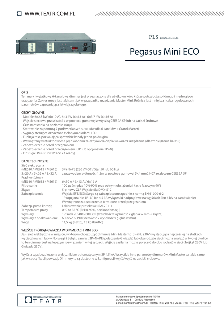 WWW.TEATR.COM.PL Pegasus Mini ECO OPIS Ten mały i wyjatkowy 6-kanałowy dimmer jest przeznaczony dla użytkowników, którzy potrzebują solidnego i niedrogiego urządzenia. Zakres mocy jest taki sam , jak w przypadku urządzenia Master Mini. Różnica jest mniejsza liczba regulowanych parametrów, zapewniająca łatwiejszą obsługę. CECHY GŁÓWNE • Modele 6×2.3 kW (6×10 A), 6×3 kW (6×13 A) i 6×3.7 kW (6×16 A) • Wejście sieciowe przez kabel z w powłoce gumowej z wtyczką CEE32A 5P lub na zaciski śrubowe • Czas narastania na poziomie 100µs • Sterowanie za pomocą 7 podświetlanych suwaków (dla 6 kanałów + Grand Master) • Sygnały sterujące oznaczone zielonymi diodami LED • Funkcja test, pozwalająca sprawdzić kanały jeden po drugim • Wewnętrzny wiatrak z dwoma prędkościami zależnymi dla ciepła wewnatrz urządzenia (dla zmniejszenia hałasu) • Zabezpieczenie przed przegrzaniem • Zabezpieczenie przed przeciążeniem (1P lub opcjonalnie 1P+N) • Obsługa DMX-512 (DMX-512A ready) DANE TECHNICZNE Sieć elektryczna (ME610 / ME613 / ME616) 3×20 A / 3×26 A / 3×32 A Prąd wyjściowy (ME610 / ME613 / ME616) Filtrowanie Złącza Zabezpieczenie Zabezp. przed korozją Temperatura pracy Wymiary Wymiary z opakowaniem: Waga 3P+N+PE (230 V/400 V Star 50 lub 60 Hz) z przewodem o długości 1,5m w powłoce gumowej 5×4 mm2 H07 ze złączem CEE32A 5P 6×10 A / 6×13 A / 6×16 A 100 µs (między 10%-90% przy pełnym obciążeniu i kącie fazowym 90°) 5-pinowy XLR Wejście dla DMX-512 Wejścia EFT/ESD/Surge są zabezpieczone zgodnie z normą EN 61000-6-2 1P (opcjonalnie 1P+N) Icn 4,5 kA wyłączniki nadprądowe na wyjściach (Icn 6 kA na zamówienie) Wewnętrzne zabezpieczenie termiczne przed przegrzaniem Lakierowanie proszkowe (RAL7011) 0 °C to 35 °C (RH: 0-90%, bez kondensacji) 19” rack 2U 484×88×350 (szerokość x wysokość x głębia w mm + złącza) 600×520×190 (szerokość x wysokość x głębia w mm) 11,5 kg (netto), 13 kg (brutto) WEJŚCIE TRÓJKĄT-GWIAZDA W DIMMERACH MINI ECO Jeśli sieć elektryczna w miejscu, w którym chcesz użyć dimmera Mini Master to 3P+PE 230V (występująca najczęściej na statkach wycieczkowych lub w Norwegii i Belgii), zamiast 3P+N+PE (połączenie Gwiazda) lub oba rodzaje sieci można znaleźć w twojej okolicy, to ten dimmer jest najlepszym rozwiązaniem w tej sytuacji. Wejście zasilania można połączyć do obu rodzajów sieci (Trójkąt 230V lub Gwiazda 230V). Wyjścia są zabezpieczona wyłącznikiem automatycznym 2P 4,5 kA. Wszystkie inne parametry dimmerów Mini Master sa takie same jak w specyfikacji powyżej. Dimmery te są dostępne w konfiguracji wyjść/wejść na zaciski śrubowe. Przedsiębiorstwo Specjalistyczne TEATR ul. Grabowa 8 05-501 Piaseczno E-mail: [email protected] Telefon: (+48 22) 756-26-36 Fax: (+48 22) 757-04-54 WWW.TEATR.COM.PL Pegasus Mini ECO KODY ZAMÓWIEŃ ME 6xx-S z wyjściami Schuko ME 6xx-F z wyjściami CEBEC ME 6xx-UK z wyjściami UK BS13630 ME 6xx-SW z wyjściami Swiss ME 6xx-H 1×16-pin z wyjściem ’Harting’ ME 6xx-H2 2×16-pin z wyjściami ’Harting’ ME 6xx-SX 1×19-pin z wyjściami ’Socapex’ ME 6xx-SX2 2×19-pin z wyjściami ’Socapex’ ME 6xx-C 3-pin z wyjściami CEE16A ME 6xx-STB z zaciskami śrubowymi dla sieci elektryczne i wyjść Gdzie „xx” oznacza prąd wyjściowy na kanał (np. ME 610-S oznacza wersję 6×10A z wejściami Schuko) OPCJE O2D-1P+N O2D-6kA O2D-AN O2D-AN10V O2D-RDM O2D-PORT O2D-RUB O2D-BFK 1P+N Wyłącznik automatyczny 6kA Icn Wyłącznik nadprądowy 0-10V analogowe wejście 0-10V analogowe wejście z wyjściem 10V Zainstalowana fukcja RDM Zestaw przenośny (w skład wchodzi: plastikowy uchwyt i gumowe nóżki) Zestaw gumowych nóżek (4 sztuki) Tylne mocowanie do montażu w szafie rackowej Kody zamówień dla wersji z wejściami Trójkąt-Gwiazda ME 6xxD-STB z zaciskami śrubowymi dla sieci elektryczne i wyjść Gdzie „xx” oznacza prąd wyjściowy na kanał (np. MM 610-S oznacza wersję 6×10A z wejściami Schuko) OPCJE DLA WERSJI Z WEJŚCIAMI TRÓJKĄT-GWIAZDA O2D-6kA 6kA Icn Wyłącznik nadprądowy O2D-AN 0-10V analogowe wejście O2D-AN10V 0-10V analogowe wejście z wyjściem 10V O2D-RDM Zainstalowana fukcja RDM O2D-PORT Zestaw przenośny (w skład wchodzi: plastikowy uchwyt i gumowe nóżki) O2D-RUB Zestaw gumowych nóżek (4 sztuki) O2D-BFK Tylne mocowanie do montażu w szafie rackowej Przedsiębiorstwo Specjalistyczne TEATR ul. Grabowa 8 05-501 Piaseczno E-mail: [email protected] Telefon: (+48 22) 756-26-36 Fax: (+48 22) 757-04-54