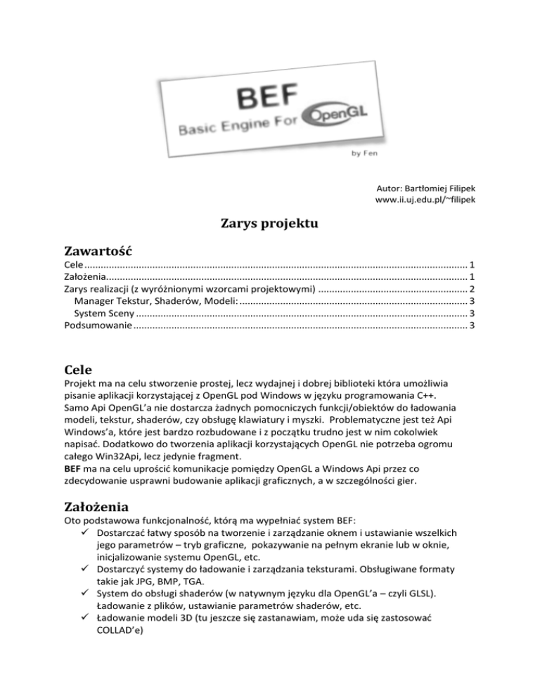 Autor: Bartłomiej Filipek www.ii.uj.edu.pl/~filipek Zarys projektu Zawartość Cele ............................................................................................................................................. 1 Założenia..................................................................................................................................... 1 Zarys realizacji (z wyróżnionymi wzorcami projektowymi) ....................................................... 2 Manager Tekstur, Shaderów, Modeli: .................................................................................... 3 System Sceny .......................................................................................................................... 3 Podsumowanie ........................................................................................................................... 3 Cele Projekt ma na celu stworzenie prostej, lecz wydajnej i dobrej biblioteki która umożliwia pisanie aplikacji korzystającej z OpenGL pod Windows w języku programowania C++. Samo Api OpenGL’a nie dostarcza żadnych pomocniczych funkcji/obiektów do ładowania modeli, tekstur, shaderów, czy obsługę klawiatury i myszki. Problematyczne jest też Api Windows’a, które jest bardzo rozbudowane i z początku trudno jest w nim cokolwiek napisad. Dodatkowo do tworzenia aplikacji korzystających OpenGL nie potrzeba ogromu całego Win32Api, lecz jedynie fragment. BEF ma na celu uprościd komunikacje pomiędzy OpenGL a Windows Api przez co zdecydowanie usprawni budowanie aplikacji graficznych, a w szczególności gier. Założenia Oto podstawowa funkcjonalnośd, którą ma wypełniad system BEF: Dostarczad łatwy sposób na tworzenie i zarządzanie oknem i ustawianie wszelkich jego parametrów – tryb graficzne, pokazywanie na pełnym ekranie lub w oknie, inicjalizowanie systemu OpenGL, etc. Dostarczyd systemy do ładowanie i zarządzania teksturami. Obsługiwane formaty takie jak JPG, BMP, TGA. System do obsługi shaderów (w natywnym języku dla OpenGL’a – czyli GLSL). Ładowanie z plików, ustawianie parametrów shaderów, etc. Ładowanie modeli 3D (tu jeszcze się zastanawiam, może uda się zastosowad COLLAD’e) System wejścia – obsługa klawiatury i myszki. Logger – do raportowania podczas działania całej aplikacji. System zarządzania Sceną 3D (na razie bardzo prosty) wraz z hierarchią obiektów mogących byd na scenie. Zestaw pomocniczych klas do OpenGL’a takie jak kamery, obiekty świateł, funkcje do renderowania prostych modeli (box’ów, kul, stożków) Proste GUI, na początek coś do tworzenia interfejsu do pokazywania informacji o aplikacji, bez okienek, list, czy innych zaawansowanych kontrolek… Zarys realizacji (z wyróżnionymi wzorcami projektowymi) Cały system jest zbudowany w oparciu o wzorzec fasadą ponieważ do istniejących podsystemów (dośd skomplikowanych swoją drogą) jak OpenGL czy Win32Api dodaje bibliotekę ułatwiającą budowanie aplikacji. Fasada głównie uprości tworzenie rdzenia aplikacji: okna oraz podstawową inicjalizację OGL’a. Sama aplikacja będzie używad głównie poleceo OpenGL (oraz ułatwieo od BEF), raczej separując się od natywnego kodu WindowsApi. Aplikacja Model fasady którą tworzy BEF Fasada jest tworzona głównie nad Windows Api Windows Api CreateThread CreateWindowEx GetMessage … Aplikacja korzysta dalej z natywnego Api OpenGL, ale ma ułatwienia od BEF BEF gTextureManager class Thread gMainWindow ….. OpenGL glBindTexture glShaderSource gluLookAt … Pojawi się także potrzeba przystosowania systemu wątków czy okien Windows (które są napisane w zwykłym C) do obiektowej postaci. Powstanie, więc kilka adapterów, które nie dodadzą nowej funkcjonalności lecz stworzą obiektowy interfejs dla wcześniej wspomnianych systemów. Adapter lub nawet dekorator pojawi się przy tworzenia obiektu Shaderów GLSL, którymi będzie można zarządzad z poziomu kodu aplikacji (ładowanie z pliku, dostawanie się do wewnętrznych atrybutów, niszczenie, etc). Manager Tekstur, Shaderów, Modeli: W systemie będą co najmniej 3 managery – do zarządzania teksturami, do shaderów oraz do obsługi modeli 3D. Zbudowane one będą oczywiście na bazie singletonu, z tego powodu, że mają one na celu optymalne zarządzanie danym zasobem – na przykład teksturami, gdyby managerów było dwóch to jedna tekstura mogła by byd wczytana dwa razy, a tego właśnie chcemy uniknąd. Każdy z nich będzie udostępniał iterator aby móc przeglądad obiekty którymi oni dysponują. Iteratory mogą byd używana w różnym kontekście (zwykłe przeglądanie po kolei, wstecz, czy według jakiegoś wzorca), chcę także aby ujednolicid interfejs dla iteratorów w projekcie bo pojawią się ona także przy temacie Sceny. Iteratory będą tworzone przez klasy nadrzędne (jak manager tekstur) i będzie można budowad różne ich wersje. Na tą właśnie okazję zostanie użyty wzorzec fabryki abstrakcyjnej. System Sceny Wszystkie obiekty które będą brad udział w renderingu (modele3D, kamery, światła, czy grupy takich obiektów) muszą byd zarządzane przez główny system sceny. Obiekty są heterogeniczne, a niektóre z nich mogą zawierad całe grupy obiektów. Do reprezentacji tego systemu najlepiej nadaje się wzorzec fasady. Przykład hierarchii w scenie kompozyt SceneObject agregacja dziedziczenie Model3D Light SceneNode Obiekty do renderowania Camera Po raz kolejny zostanie także wykorzystana fabryka abstrakcyjna do budowania wyżej wspomnianych obiektów. Na obiektach w scenie trzeba będzie także wykonywad różne operacje – jak usuwanie niewidocznych obiektów, przygotowywanie listy do wyświetlenia, przeglądanie, etc… tutaj idealnie nada się do tego wzorzec wizytatora. Podsumowanie BEF jest prostym enginem/szkieletem dla aplikacji korzystających z OpenGL pod Windows. Mimo wszystko jeśli zostanie on dobrze napisany umożliwi 