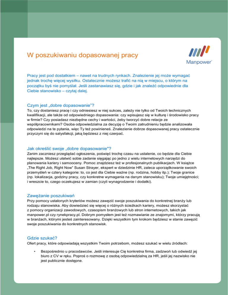W poszukiwaniu dopasowanej pracy Pracy jest pod dostatkiem – nawet na trudnych rynkach. Znalezienie jej może wymagać jednak trochę więcej wysiłku. Ostatecznie możesz trafić na nią w miejscu, o którym na początku byś nie pomyślał. Jeśli zastanawiasz się, gdzie i jak znaleźć odpowiednie dla Ciebie stanowisko – czytaj dalej. Czym jest „dobre dopasowanie”? To, czy dostaniesz pracę i czy odniesiesz w niej sukces, zależy nie tylko od Twoich technicznych kwalifikacji, ale także od odpowiedniego dopasowania: czy wpisujesz się w kulturę i środowisko pracy w firmie? Czy posiadasz niezbędne cechy i wartości, żeby tworzyć dobre relacje ze współpracownikami? Osoba odpowiedzialna za decyzję o Twoim zatrudnieniu będzie analizowała odpowiedzi na te pytania, więc Ty też powinieneś. Znalezienie dobrze dopasowanej pracy ostatecznie przyczyni się do satysfakcji, jaką będziesz z niej czerpać. Jak określić swoje „dobre dopasowanie"? Zanim zaczniesz przeglądać ogłoszenia, poświęć trochę czasu na ustalenie, co będzie dla Ciebie najlepsze. Możesz ułatwić sobie zadanie sięgając po jedno z wielu internetowych narzędzi do planowania kariery i samooceny. Pomoc znajdziesz też w profesjonalnych publikacjach. W książce „The Right Job, Right Now” Susan Strayer, ekspert w dziedzinie HR, zaleca uporządkowanie swoich przemyśleń w cztery kategorie: to, co jest dla Ciebie ważne (np. rodzina, hobby itp.); Twoje granice (np. lokalizacja, godziny pracy, czy konkretne wymagania na danym stanowisku); Twoje umiejętności; i wreszcie to, czego oczekujesz w zamian (czyli wynagrodzenie i dodatki). Zawężanie poszukiwań Przy pomocy ustalonych kryteriów możesz zawęzić swoje poszukiwania do konkretnej branży lub rodzaju stanowiska. Aby dowiedzieć się więcej o różnych ścieżkach kariery, możesz skorzystać z pomocy organizacji zawodowych, czasopism branżowych lub stron internetowych, takich jak manpower.pl czy rynekpracy.pl. Dobrym pomysłem jest też rozmawianie ze znajomymi, którzy pracują w branżach, którymi jesteś zainteresowany. Dzięki wszystkim tym krokom będziesz w stanie zawęzić swoje poszukiwania do konkretnych stanowisk. Gdzie szukać? Ofert pracy, które odpowiadają wszystkim Twoim potrzebom, możesz szukać w wielu źródłach: • Bezpośrednio u pracodawców. Jeśli interesuje Cię konkretna firma, zadzwoń lub odwiedź jej biuro z CV w ręku. Poproś o rozmowę z osobą odpowiedzialną za HR, jeśli jej nazwisko nie jest publicznie dostępne. • • • • Sieć Twoich znajomych i kontaktów zawodowych. Pytaj o ogłoszenia o pracę wszystkich znajomych, członków rodziny, nauczycieli czy byłych współpracowników. Mów wszystkim, że poszukujesz nowej pracy – im więcej osób wie, tym większa szansa, że Ci się uda. W Internecie: na wielu stronach znajdziesz ogłoszenia z wszystkich możliwych branż. Możesz też skupić się na konkretnych rodzajach. Agencje zatrudnienia: skorzystaj z „jazdy próbnej” i sprawdź konkretna firmę lub stanowisko, jednocześnie zdobywając cenne doświadczenie, kontakty i referencje. Pamiętaj, że praca tymczasowa czasami przeradza się w stałe zatrudnienie. Urzędy pracy. Do miejscowego urzędu możesz udać się osobiście lub zadzwonić. Większość urzędów ma też listy ofert na swoich stronach internetowych, a pod adresem www.psz.praca.gov.pl znajdziesz Centralną Bazę Ofert Pracy z całej Polski. Kiedy znajdziesz już interesujące ogłoszenie, postaraj się zdobyć więcej informacji o pracodawcy i kulturze pracy. Dzięki znajomym i innym kontaktom, mediom społecznościowym (LinkedIn, GoldenLine czy Facebook) oraz stronom internetowym z ogłoszeniami i opiniami możesz dowiedzieć się jak wygląda praca w danej firmie. Dodatkowo, kiedy trafisz już na rozmowę kwalifikacyjną, obserwuj środowisko pracy i atmosferę. Możesz zauważyć szczegóły, które pomogą Ci wybrać ofertę najlepiej dopasowaną do Twoich potrzeb. Wykorzystaj swoje praktyczne doświadczenie zdobyte dzięki Manpower, aby zdecydować, czy dana firma lub stanowisko są dla Ciebie odpowiednie. Aplikuj już dziś na manpower.pl.
