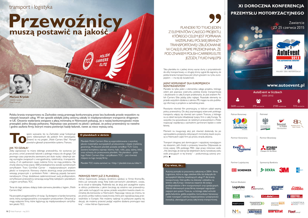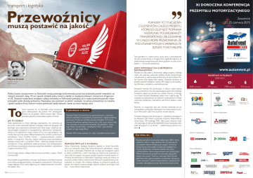 Przewoźnicy muszą postawić na jakość reklama transport i logistyka PLANDEKI TO TYLKO JEDEN Z ELEMENTÓW CAŁEGO PROJEKTU, KTÓREGO CELEM JEST POPRAWA WIZERUNKU POLSKIEJ BRANŻY TRANSPORTOWEJ I ZBUDOWANIE W CAŁEJ EUROPIE PRZEKONANIA, ŻE POD ZNAKIEM POLISH CARRIERS ELITE JEŻDŻĄ TYLKO NAJLEPSI Taka plandeka to z jednej strony wyraz dumy z przynależności do elity transportowej, a z drugiej strony sygnał dla zagranicy, że polska branża transportowa jest silnym graczem na rynku europejskim – i ma tej siły świadomość. JASNY KOMUNIKAT DLA EUROPEJSKICH KONTRAHENTÓW Plandeki to tylko jeden z elementów całego projektu, którego celem jest poprawa wizerunku polskiej branży transportowej i zbudowanie w całej Europie przekonania, że pod znakiem Polish Carriers Elite jeżdżą tylko najlepsi. Pozostałe elementy to przede wszystkim działania z zakresu PR, mające na celu publikację informacji o projekcie w zachodniej prasie. Mariusz Krysiak redaktor naczelny Polski Przemysł Polska branża transportowa na Zachodzie swoją przewagę konkurencyjną przez lata budowała przede wszystkim na niższych kosztach usług. W ten sposób zdobyła jedną czwartą udziału w międzynarodowym transporcie drogowym w UE. Ostatnie wydarzenia związane z płacą minimalną w Niemczech pokazują, że o naszej konkurencyjności może przesądzić jedna decyzja polityczna. Najwyższy czas postawić na jakość i pokazać, że polscy przewoźnicy to rzetelne i godne zaufania firmy, którym można powierzyć każdy ładunek, nawet za nieco wyższą cenę. To spore wyzwanie, bo na Zachodzie wciąż funkcjonuje sporo niekorzystnych dla polskich firm stereotypów. Zmienić to ma projekt „Polish Carriers Elite”. Pomysł powstał w głowach pracowników systemu Trans.eu. JAK TO DZIAŁA? Żeby zapracować na miano dobrego przewoźnika, nie wystarczy już po prostu umieć przewieźć ładunek z jednego miejsca do drugiego. Od pewnego czasu poprzeczka zawieszona jest dużo wyżej i obejmuje szereg wymogów związanych z wiarygodnością, rzetelnością i transparentnością. Z ich spełnieniem nasze rodzime firmy nie mają problemu. Na chwilę obecną mniej więcej 1800 przedsiębiorstw zostało wyróżnionych certyfikatem Trans Certified Carrier – międzynarodowym znakiem jakości w transporcie. Kierowcy chętnie akcentują swoje pochodzenie: wieszają proporczyki z symbolami Polski i dekorują pojazdy barwami narodowymi. Chcąc dodatkowo zademonstrować swój profesjonalizm, certyfikowani przewoźnicy oznaczają swoją flotę naklejkami i plandekami z logiem certyfikatu TCC. Teraz do tego zestawu dołączy biało-czerwona plandeka z logiem „Polish Carriers Elite”. Na początek przygotowaliśmy ich tysiąc. Są dostępne w bardzo korzystnej cenie, którą wynegocjowaliśmy z europejskim producentem. Otrzymać je mogą wyłącznie firmy, które legitymują się międzynarodowym certyfikatem jakości TCC. 16 | Polski Przemysł – maj 2015 Powstanie również film promocyjny, w którym udział wezmą polscy przewoźnicy. Do akcji poprawiającej wizerunek polskiego transportu włączy się również sam system Trans.eu, z którego na co dzień korzysta kilkadziesiąt tysięcy firm z całej Europy. To wszystko ma spowodować, że rzetelnym przewoźnikom z Polski rozpocząć współpracę z zachodnimi partnerami będzie o wiele łatwiej. O plandekach w skrócie Moment na inaugurację akcji jest również doskonały, bo po wprowadzeniu przepisów dotyczących minimalnej stawki za pracę w Niemczech część firm po prostu straciła zlecenia. Plandeki Polish Carriers Elite są wyprodukowane z wysokiej jakości materiałów europejskich producentów i objęte trzyletnią gwarancją. Producent plandek posiada certyfikat TUV. Cena zawiera kompletny osprzęt: klamry, haki, rolki, pasy, taśmy, linkę oraz uchwyty do przesuwania plandeki. Na plandece – poza logo Polish Carriers Elite i certyfikatem TCC – jest również miejsce na logo twojej firmy. Transport drogowy jest dominującym i najszybciej rozwijającym się obszarem, jeśli chodzi o przewozy towarów. Odpowiada za mniej więcej 10% polskiego PKB i daje pracę milionowi osób. „Nic dziwnego, że stał się też składnikiem dumy narodowej wielu osób pracujących w tej branży” – podsumowują autorzy projektu. ■ Plandeki TCC można zamówić na: <http://plandeki.trans.eu/elite/>. PIERWSZE FIRMY JUŻ Z PLANDEKĄ Adrian Gąsiorowski, zastępca dyrektora spedycji w firmie Kroma-Bis, która już oznaczyła swoją flotę biało-czerwonymi plandekami, uważa, że to strzał w dziesiątkę. Podkreśla też, że akcja jest szczególnie ważna w obliczu problemów, z jakimi borykają się ostatnio nasi przewoźnicy. „Jest wiele nurtujących nas spraw, przede wszystkim kwestia stawki minimalnej dla kierowców w Niemczech. Nazywając rzeczy po imieniu, to po prostu próba rozbicia naszej branży, która jest największą bazą przewoźników w Europie. Nie możemy wpłynąć na polityczne aspekty tej decyzji, ale możemy przecież podjąć wspólne działania promujące nasz kraj” – mówi Adrian Gąsiorowski. Czy wiesz, że... Autorzy pomysłu to pracownicy założonej w 2004 r. firmy Logintrans, która w ciągu zaledwie kilku lat dołączyła do europejskich liderów świadczących usługi IT dla branży transportowej. Dziś spółka ma dziewięć oddziałów na terenie całej Europy i dostarcza wsparcie dla tysięcy profesjonalistów z firm transportowych oraz spedycyjnych. Wśród oferowanych przez firmę rozwiązań najpopularniejszym jest system Trans.eu, w którego skład wchodzi giełda ładunków, giełda pojazdów, komunikator biznesowy i wiele rozwiązań z zakresu bezpieczeństwa i przejrzystości transakcji, ułatwiających pracę całej branży transportowej. Polski Przemysł – maj 2015 | 17