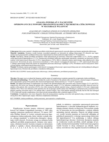 Nowiny Lekarskie 2008, 77, 3, 183–189 BOGDAN KOPEĆ1, RYSZARD MARCINIAK2 ANALIZA POWIKŁAŃ U PACJENTÓW OPEROWANYCH Z POWODU OBJAWOWEJ KAMICY PĘCHERZYKA ŻÓŁCIOWEGO W MATERIALE WŁASNYM ANALYSIS OF COMPLICATIONS IN PATIENTS OPERATED FOR SYMPTOMATIC CHOLECYSTOLITHIASIS. AUTHORS’OWN MATERIAL 1 Oddział Chirurgiczny Szpitala Powiatowego w Radziejowie Ordynator: dr n. med. Bogdan Kopeć 2 Katedra i Klinika Chirurgii Ogólnej, Gastroenterologicznej i Endokrynologicznej Uniwersytet Medyczny im. Karola Marcinkowskiego w Poznaniu Kierownik: prof. dr hab. med. Michał Drews Streszczenie Celem pracy była ocena częstości i charakteru powikłań wśród chorych operowanych z powodu objawowej kamicy pęcherzyka żółciowego. Materiał i metodyka. Oceniono wyniki leczenia wszystkich pacjentów po konwersji do zabiegu klasycznego (32 chorych) oraz reprezentatywnych grup pacjentów poddanych klasycznej i laparoskopowej cholecystektomii (odpowiednio 53 i 75 pacjentów). Wyniki. Największy odsetek powikłań stwierdzono wśród operowanych po konwersji i klasycznie (odpowiednio 31,1% i 28,5%), najmniej wśród operowanych laparoskopowo (17,1%). Dominowały powikłania infekcyjne spostrzegane najczęściej u pacjentów po konwersji (18,6%), rzadziej wśród operowanych klasycznie (11,4%) i laparoskopowo (7,8%). Były to zakażenia miejsca operowanego, dróg oddechowych i dróg moczowych. Krwawienia do jamy otrzewnowej stwierdzono u 9,4% chorych wymagających konwersji i w 1,9% operowanych klasycznie. U jednego operowanego klasycznie doszło do uszkodzenia przewodu żółciowego wspólnego (1,9%). Powikłania sercowo-naczyniowe obserwowano jedynie wśród operowanych klasycznie (3,8%). Wnioski. Powikłania częściej spostrzegano wśród chorych wymagających konwersji i operowanych klasycznie niż wśród poddanych zabiegowi laparoskopowemu. Dominowały powikłania o charakterze infekcyjnym. SŁOWA KLUCZOWE: kamica pęcherzyka żółciowego, cholecystektomia, powikłania pooperacyjne. Summary The aim of the paper was to evaluate the frequency and the nature of complications in patients operated for symptomatic cholecystolithiasis. Material and methodology. The evaluation included the results of treatment of the patients after conversion for a classical surgery (32 patients) and a representative group of the patients after classical and laparoscopic cholecystectomy (n = 53 and 75, respectively). Results. The highest percentage of complications was found in the operated patients after conversion and a classical surgery (31.1% and 28.5%, respectively), the lowest one among the patients after a laparoscopic surgery (17.1%). Infectious complications prevailed, observed most frequently in the patients after conversion (18.6%), less often among the patients operated using a classical method (11.4%) and a laparoscopic method (7.8%). These were infections of the operation site, the air passages and the urinary tract. Bleeding to a peritoneal cavity occurred in 9.4% patients requiring conversion and in 1.9% patients after a classical surgery. One of the patients operated classically had his bile duct damaged (1.9%). Heart and vascular complications were observed only among patients after a classical surgery (3.8%). Conclusions. Complications were more frequently observed among patients requiring conversion and operated using a classical method than among those after a laparoscopic surgery. Infectious complications dominated. KEY WORDS: cholecystolithiasis, cholecystectomy, post-operative complications. Wprowadzenie Współczesne leczenie kamicy żółciowej zapoczątkował Carl Johann Langenbuch usuwając w 1882 roku zapalnie zmieniony pęcherzyk żółciowy. W marcu 1987 roku Phillipe Mouret w Lyonie wykonał pierwszą laparoskopową cholecystektomię, która wkrótce zyskała miano „złotego standardu” w środowisku chirurgów i akceptację wśród chorych. Zwrócono uwagę na mniejszą liczbę ogólnych powikłań pooperacyjnych, mniejszy uraz operacyjny, obniżenie kosztów leczenia związane ze skróceniem pobytu w szpitalu i okresu rekonwalescencji poszpitalnej [1, 2, 3, 4, 5, 6, 7, 8, 9, 10, 11, 12, 13, 14]. Okazało się jednak, że niektórzy z pacjentów operowanych pierwotnie laparoskopowo, z powodu śródoperacyjnych trudności wymagają zamiany metody na klasyczną. Powszechnie uznaje się, że konwersja nie jest powikłaniem, a jedynie efektem racjonalnej decyzji operatora. Pojawia się jednak pytanie czy wyniki leczenia pacjenta po konwersji odbiegają od podobnych parametrów u chorego operowanego klasycznie lub laparoskopowo? Czy podejmując w trakcie zabiegu laparoskopowego decyzję o konwersji skazujemy pacjenta na zwiększone ryzyko powikłań, aniżeli operując od początku metodą konwencjonalną? Jeżeli konwersja pogarsza wyniki leczenia to chcąc zmniejszyć jej odsetek, może należy zrewidować zbyt łagodne kryteria kwalifikacji do 184 Bogdan Kopeć, Ryszard Marciniak tów poddanych zabiegowi usunięcia pęcherzyka żółciowego, analizując dane zgromadzone w dokumentacji medycznej dotyczące pacjentów po konwersji do zabiegu klasycznego (32 chorych) oraz reprezentatywne, wybrane drogą losowania systematycznego, grupy pacjentów poddanych klasycznej i laparoskopowej cholecystektomii (odpowiednio 53 i 75 pacjentów). zabiegu laparoskopowego? Może nie należy kwalifikować wszystkich chorych do zabiegu laparoskopowego, bo „zawsze można wykonać konwersję”? Cel pracy Celem pracy była ocena częstości i charakteru powikłań wśród chorych operowanych z powodu objawowej kamicy pęcherzyka żółciowego, w tym pacjentów wymagających zamiany metody operacyjnej (konwersji). Poddano ocenie wpływ konwersji na wyniki leczenia w porównaniu z chorymi leczonymi od początku sposobem konwencjonalnym. Wyniki W tabeli 1. przedstawiono powikłania z podziałem na infekcyjne, sercowo-naczyniowe, brzuszne, śródoperacyjne i inne. Zakażenie miejsca operowanego obserwowano