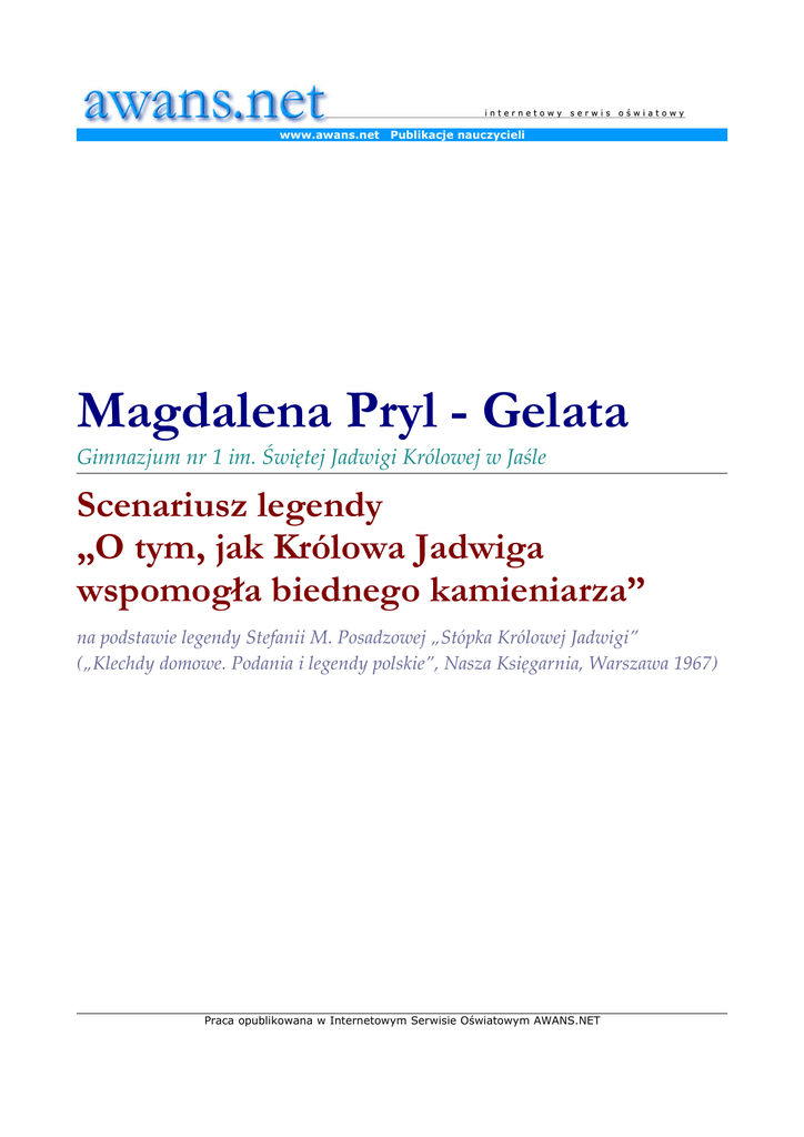 www.awans.net Publikacje nauczycieli Magdalena Pryl - Gelata Gimnazjum nr 1 im. Świętej Jadwigi Królowej w Jaśle Scenariusz legendy „O tym, jak Królowa Jadwiga wspomogła biednego kamieniarza” na podstawie legendy Stefanii M. Posadzowej „Stópka Królowej Jadwigi” („Klechdy domowe. Podania i legendy polskie”, Nasza Księgarnia, Warszawa 1967) Praca opublikowana w Internetowym Serwisie Oświatowym AWANS.NET Opis Scenariusz tej legendy powstał z myślą o inscenizacji przygotowanej przez młodzież gimnazjalną i pokazanej na uroczystości nadania imienia Świętej Jadwigi Królowej Gimnazjum nr 1 w Jaśle. Uroczystość ta miała miejsce w JDK 7 czerwca 2004 roku. Za kanwę do tego scenariusza posłużył tekst legendy pochodzący ze zbioru autorstwa Hanny Kostyrko „Klechdy domowe. Podania i legendy polskie”, Nasza Księgarnia, Warszawa 1967. Tekst legendy autorstwa Stefanii M. Posadzowej. Z uwagi na czas trwania inscenizacji: 10 min – przedstawienie to może być znakomitym uzupełnieniem lekcji języka polskiego lub historii na lekcjach w szkole podstawowej i gimnazjum. Widowisko przygotowane na uroczystość nadania imienia szkole otwierała pieśń „Bogurodzica” (CD „Świat w słowach i obrazach. Literatura i muzyka dla gimnazjum”, WSiP, Warszawa 2003), przy której taktach zjeżdżała w dół dekoracja sceny przedstawiająca Wzgórze Wawelskie z masywem zamku królewskiego górującego nad miastem. Całość, lekko podświetlona, wyłaniała się stopniowo z mroku kryjącego scenę, tworząc w ten sposób klimat i scenerię średniowiecznego Krakowa, adekwatnych do świata przedstawionego legendy o Jadwidze Andegaweńskiej. Kostiumy – starannie dobrane – dodatkowo współtworzyły i dopełniały obrazu „zamierzchłych czasów”. W tej dziedzinie istotne było znalezienie odpowiednich kostiumów teatralnych, zwłaszcza sukni królowej i dam dworu. – To prawdziwe wyzwanie dla inscenizatorów. Legendę można ubogacić tłem muzycznym - np. (jak to miało miejsce w opisywanej inscenizacji) muzyką średniowiecza: Psalm 33, sł. J. Kochanowski, muz. M. Gomółka, CD „Świat w słowach i obrazach. Literatura i muzyka dla gimnazjum”, WSiP, Warszawa 2003. Krótki fragment muzyczny może być wydłużony w czasie komputerowo do potrzebnych 10 minut. Jednym słowem jest to wdzięczny materiał do inscenizacji, już choćby przez wzgląd na niezwykły urok starej legendy. Zachęcam do podejmowania razem z utalentowaną młodzieżą takich przedsięwzięć. mgr Magdalena Pryl - Gelata 2 Osoby: N1 – narrator I (chłopak lub dziewczyna) N2 – narrator II (chłopak lub dziewczyna) Kr. J. - Królowa Jadwiga Orszak: (2)3 dwórki, paź królowej (statyści) R1 R2 R3 R4 – – – – robotnik robotnik robotnik robotnik I II III IV stanowią gromadę murarzy, kamieniarzy, budujących świątynię Murarz – kamieniarz – obdarowany przez królową Legenda: „O tym jak Królowa Jadwiga wspomogła biednego kamieniarza” Rekwizyty: narzędzia pracy murarzy: młotki, kielnie, „materiał budowlany”: kamienie, cegły; złota klamra z trzewika, trzewiki z noskami; tło: zarys niedokończonej budowli ewentualnie murów miejskich, zarys Wawelu. Światło: imitujące światło słoneczne, dzienne. 3 (Narratorzy mówią ze swobodą, z zacięciem gawędziarskim...) N1: (wchodząc pomału na scenę, zaczyna snuć opowieść.) „Był Rok Pański 1390. W Krakowie budowano właśnie świątynię niedaleko od Rynku Głównego, ale już za murami miejskimi – Tam gdzie dziś jest ulica Karmelicka, na przedmieściu nazwanym – Na Piasku.” N2: (dochodząc do narratora pierwszego – także wolnym krokiem.) „A na wawelskim zamku żyła królowa Jadwiga. – Pani bardzo piękna i młoda, ale i bezgranicznie dobra. Mówiono o niej, iż serce miała czułe na wszystkie niedole i chętnie spieszyła z pomocą ludziom biednym i nieszczęśliwym. – Nic więc dziwnego, że kochano ją i poważano wielce”. N1: „Królowa wielkie dała skarby, aby piękny kościół wystawić Bogu w stolicy. Sama też często przychodziła spojrzeć na robotę dzielnych murarzy i kamieniarzy”. N2: (I dalej tak samo, snując gawędę ...) „Pewnego dnia wracała Miłościwa Pani ze swym orszakiem ze spaceru za murami miejskimi i postanowiła przyjrzeć się jeszcze raz budowie ... (Pojawia się orszak Królowej Jadwigi – 3 dwórki, paź, podtrzymujący płaszcz królowej, stąpający za nią kilka kroków. Dostojnie przesuwają się ku gromadzie.) N1: „Słonko jeszcze świeciło. Robota szła żwawo...” Robotnicy: ([R1 ] - jeden z nich pogwizduje, [R2] – drugi podśpiewuje sobie, inny [R3] – coś wesołego opowiada pracującej gromadzie.) Kr. J.: „Snadź im dobrze na sercu ! – Ale cóż to? (zapytała z lekkim niepokojem w głosie) – Jeden z murarzy, choć pracuje pilnie, smutny jakiś, nie słucha wesołych gawęd towarzyszy, wzdycha, łzę ukradkiem ociera?... I nikt tego nie widzi?!!” N2: „Zdumiała się i zasmuciła dobra królowa!!” N1: „Wtem...” (Jeden z robotników [R1] - który pierwszy zauważył orszak królowej – zawołał z wysokości rusztowania) R1: „Królowa, pani Jadwiga idzie!” Robotnicy: (wszyscy powtarzają wesoło) „Królowa, pani nasza idzie !” 4 R2: (wesoło do gromady) „Dalej chłopcy do roboty!” N1: „Stuknęły raźniej młotki, zadzwoniły kielnie, rozjaśniły się twarze murarzy.” N2: „Królowa witała uśmiechem łaskawym pracowników, oglądała roboty.” N1: „Gdy spostrzegła owego smutnego człowieka, który ociosywał pilnie kamień, nie zważając na to, co się wkoło niego dzieje; podeszła doń.” Kr. J.: „Co wam dolega, przyjacielu? (zapytała z troską w głosie) Czy was ktoś skrzywdził? – Bladzi jesteście i wynędzniali. – Chorzyście?!!” Murarz – kamieniarz: (ocierając rękawem łzy płynące z oczu.) „Nikt mnie skrzywdził, Miłościwa Pani, i zdrów jestem. Jeno żona moj