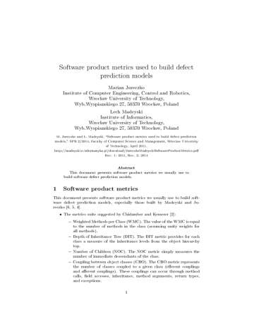 Software product metrics used to build defect prediction models Marian Jureczko Institute of Computer Engineering, Control and Robotics, Wrocß law University of Technology, Wyb.Wyspianskiego 27, 50370 Wrocß law, Poland Lech Madeyski Institute of Informatics, Wrocß law University of Technology, Wyb.Wyspianskiego 27, 50370 Wrocß law, Poland M. Jureczko and L. Madeyski, Software product metrics used to build defect prediction models, SPR 2/2014, Faculty of Computer Science and Management, Wroclaw University of Technology, April 2011. http://madeyski.e-informatyka.pl/download/JureczkoMadeyskiSoftwareProductMetrics.pdf Rev. 1: 2011, Rev. 2: 2014 Abstract This document presents software product metrics we usually use to build software defect prediction models. 1 Software product metrics This document presents software product metrics we usually use to build software defect prediction models, especially those built by Madeyski and Jureczko [6, 5, 4]. • The metrics suite suggested by Chidamber and Kemerer [2]: Weighted Methods per Class (WMC). The value of the WMC is equal to the number of methods in the class (assuming unity weights for all methods). Depth of Inheritance Tree (DIT). The DIT metric provides for each class a measure of the inheritance levels from the object hierarchy top. Number of Children (NOC). The NOC metric simply measures the number of immediate descendants of the class. Coupling between object classes (CBO). The CBO metric represents the number of classes coupled to a given class (eerent couplings and aerent couplings). These couplings can occur through method calls, eld accesses, inheritance, method arguments, return types, and exceptions. 1 Response for a Class (RFC). The RFC metric measures the number of dierent methods that can be executed when an object of that class receives a message. Ideally, we would want to nd for each method of the class, the methods that class will call, and repeat this for each called method, calculating what is called the transitive closure of the method call graph. This process can however be both expensive and quite inaccurate. Ckjm calculates a rough approximation to the response set by simply inspecting method calls within the class method bodies. The value of RFC is the sum of number of methods called within the class method bodies and the number of class methods. This simplication was also used in the original description of the metric. Lack of cohesion in methods (LCOM). The LCOM metric counts the sets of methods in a class that are not related through the sharing of some of the class elds. The original denition of this metric (which is the one used in Ckjm) considers all pairs of class methods. In some of these pairs both methods access at least one common eld of the class, while in other pairs the two methods do not share any common eld accesses. The lack of cohesion in methods is then calculated by subtracting from the number of method pairs that do not share a eld access the number of method pairs that do. • Lack of Cohesion in Methods (LCOM3) suggested by Henderson-Sellers [3]. LCOM3 is a normalized version of the Chidamber and Kemerer's LCOM metric and can be calculated using the following equation: ( a1 LCOM 3 = a P µ(Aj )) − m j=1 1−m (1) where m is the number of methods in a class; a is the number of attributes in a class and µ(A) is the number of methods that access the attribute A. • The metrics suite suggested by Bansiy and Davis [1]: Number of Public Methods (NPM). The NPM metric simply counts all the methods in a class that are declared as public. The metric is known also as Class Interface Size (CIS) Data Access Metric (DAM). This metric is the ratio of the number of private (protected) attributes to the total number of attributes declared in the class. Measure of Aggregation (MOA). The metric measures the extent of the part-whole relationship, realized by using attributes. The metric is a count of the number of class elds whose types are user dened classes. Measure of Functional Abstraction (MFA). This metric is the ratio of the number of methods inherited by a class to the total number of methods accessible by the member methods of the class. The constructors and the java.lang.Object (as parent) are ignored. 2 Cohesion Among Methods of Class (CAM). This metric computes the relatedness among methods of a class based upon the parameter list of the methods. The metric is computed using the summation of number of dierent types of method parameters in every method divided by a multiplication of number of dierent method parameter types in whole class and number of methods. • The quality oriented extension to Chidamber & Kemerer metrics suite suggested by Tang et al. [9]. Inheritance Coupling (IC). This metric provides the number of parent classes to which a given class is coupled. A class is coupled to its parent class if one of its inherited methods functionally dependent on the new or redened methods in the class. A class is coupled to its parent class if one of the following conditions is satised: ∗ One of its inherited methods uses an attribute that is dened in a new/redened method. ∗ One of its inherited methods calls a redened method. ∗ One of its inherited methods is called by a redened method and uses a parameter that is dened in the redened method. Coupling Between Methods (CBM). The metric measures the total number of new/redened methods to which all the inherited methods are coupled. There is a coupling when at least one of the given in the IC metric denition conditions is held. Average Method Complexity (AMC). This metric measures the av- erage method size for each class. Size of a method is equal to the number of Java binary codes in the method. • Two metrics suggested by Martin [7]: Aerent couplings (Ca). The Ca metric represents the number of classes that depend upon the measured class. Eerent couplings (Ce). The Ca metric represents the number of classes that the measured class is de