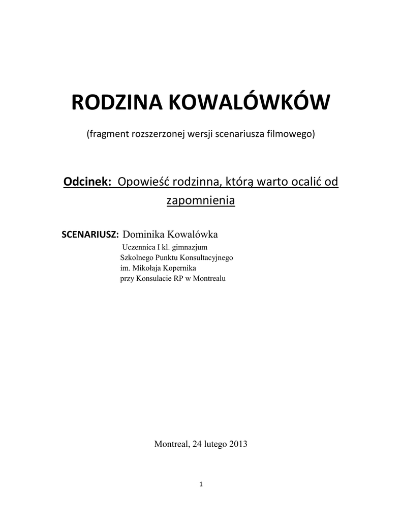 RODZINA KOWALÓWKÓW (fragment rozszerzonej wersji scenariusza filmowego) Odcinek: Opowieść rodzinna, którą warto ocalić od zapomnienia SCENARIUSZ: Dominika Kowalówka Uczennica I kl. gimnazjum Szkolnego Punktu Konsultacyjnego im. Mikołaja Kopernika przy Konsulacie RP w Montrealu Montreal, 24 lutego 2013 1 RODZINA KOWALÓWKÓW (fragment rozszerzonej wersji scenariusza filmowego) SCENA 129 F-138 5m Dekor.Pl. Noc/ Burza śnieżna CZECHOWICE Pociąg towarowy Pociąg towarowy ciągnie skład wagonów ze zwierzętami z Czechowic do Krakowa w czasie burzy śnieżnej w listopadzie . W pewnym miejscu najeżdża na taką dużą zaspę, że nawet ogromna ciuchcia utyka nie dając rady przepchać ogromnej kupy śniegu nawianej przez wiatr. Próbując przez kilka godzin zepchnąć śnieg posuwa się po kilka centymetrów. SCENA 130 F-139 15m Dekor.Pl. Noc lub świt/ Burza śnieżna CZECHOWICE Lokomotywa W lokomotywie siedzą Pradziadek Władysław( maszynista) i pomocnik Kazek. POMOCNIK KAZEK – Panie Maszynisto, ale napadało śniegu! Ciężko nam się rusza, tory całe zasypane! PRADZIADEK WŁADYSŁAW – Zimno, jestem ciekawy jak tam "bydlenta". POMOCNIK KAZEK – Ja też pójdę sprawdzić jak im jest. PRADZIADEK WŁADYSŁAW – Dobrze, no idź zobacz, żeby nam te "bydlenta" z zimna nie pomarły. Pomocnik Kazek ubiera kurtkę i czapkę i wyskakuje z lokomotywy i idzie do zwierząt. 2 SCENA 131 F-140 30m Dekor.Pl. Noc lub świt/ Burza śnieżna CZECHOWICE Lokomotywa Kazek wraca do pociągu cały w śniegu i ściąga kurtkę i czapkę. Kazek zbliża się do pieca, aby się ogrzać. PRADZIADEK WŁADYSŁAW – Jak tam "bydlenta"? POMOCNIK KAZEK – Krowy stoją skurczone w kupie i muczą, a barany beczą. PRADZIADEK WŁADYSŁAW – No to trzeba się pospieszyć, bo z zimna pomrą. Przez chwilę jadą w milczeniu. Nagle Kazek odskakuje od pieca. POMOCNIK KAZEK – Panie Maszynisto, ogromna maszyna zżera węgiel, zwierzęta marzną! Zostało bardzo niewiele, żebyśmy ruszyli pełną parą, ale niestety brakło węgla! SCENA 132 F-141 15 m Dekor.Pl. Rano/ Śnieg Las Pociąg staje w lesie. Pradziadek Władysław i Kazek wyglądają przez okno. PRADZIADEK WŁADYSŁAW – Zobacz Kazek, jesteśmy w lesie, będziemy palić drewnem! POMOCNIK KAZEK – To dobry pomysł! PRADZIADEK WŁADYSŁAW – No to chodźmy po te drewno. POMOCNIK KAZEK – Dobrze, już idę. 3 SCENA 133 F-142 30 m Dekor.Pl. Rano/ Śnieg Polana z belkami Pradziadek Władysław i jego pomocnik cieszą się, gdy widzą gotowe ścięte drewniane belki, zaczynają je znosić do pociągu i wrzucać do paleniska. Ich radość nie trwa długo, ponieważ pojawia się leśniczy. LEŚNICZY – Kradną drzewo z państwowego lasu! GŁOSY( pomocnicy leśniczego) – Co tam się dzieje! Złodzieje! Lecimy na pomoc! Po chwili polana pełna jest ludzi. Leśnicy biegną z kijami. Pradziadek Władysław przestaje nosić drzewo i idzie do leśniczego. PRADZIADEK WŁADYSŁAW – Nie kradniemy drzewa, tylko bierzemy drzewo, bo węgiel się skończył, a potrzebujemy, żeby odpalić. LEŚNICZY – Rozumiem, przepraszam. Leśniczy zatrzymuje swoich pomocników i pokazuje ręką, że nie ma niebezpieczeństwa. Scena 134 F-143 15 m Dekor.Pl. Rano/ Śnieg Polana z belkami Leśniczy biegnie do lasu. Pradziadek Władysław, Kazek i leśnicy siedzą na belkach. Leśnicy jedzą śniadanie. PRADZIADEK WŁADYSŁAW – A gdzie Pan Leśniczy biegnie? LEŚNIK 1 – Tu zaraz jest wioska. Na pewno przyprowadzi pomoc. 4 PRADZIADEK WŁADYSŁAW – Chodźcie jeść do lokomotywy. Tam jest cieplej. Scena 135 F-144 15 m Dekor.Pl. Rano/ Śnieg Lokomotywa Pradziadek Władysław, Kazek i leśnicy siedzą w lokomotywie i jedzą. LEŚNIK 1 – Myśleliśmy, że kradniecie drzewo. LEŚNIK 2 – Słyszeliśmy jak leśniczy krzyczy, że kradną drzewo, to od razu poszliśmy na was. LEŚNIK 3 – Dobrze, że was nie pobiliśmy tymi kijami! KAZEK – Ale to by było głupio! Scena 136 F-145 45 m Dekor.Pl. Rano/ Śnieg Polana z belkami Leśniczy wraca z wraca z grupą mężczyzn z łopatami. Część z nich zaczyna odwalać śnieg, a następna znosi drewno z lasu do lokomotywy i pomaga ładować do paleniska. Pradziadek Władysław, Kazek i leśnicy wychodzą z lokomotywy i dołączają do pracujących mężczyzn. Po pewnym czasie Pradziadek Władysław i Kazek wchodzą do lokomotywy. Machają na pożegnanie i całą parą ruszają naprzód. PRADZIADEK WŁADYSŁAW – Dobrze, że nam ci ludzie pomagali, bo jakby nie, to by nam "bydlenta" z zimna pomarły. KAZEK – To prawda! 5 6