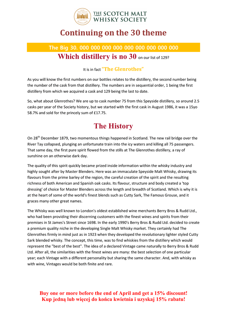 Continuing on the 30 theme The Big 30. 000 000 000 000 000 000 000 000 000 Which distillery is no 30 on our list of 129? It is in fact “The Glenrothes” As you will know the first numbers on our bottles relates to the distillery, the second number being the number of the cask from that distillery. The numbers are in sequential order, 1 being the first distillery from which we acquired a cask and 129 being the last to date. So, what about Glenrothes? We are up to cask number 75 from this Speyside distillery, so around 2.5 casks per year of the Society history, but we started with the first cask in August 1986, it was a 15yo 58.7% and sold for the princely sum of £17.75. The History On 28th December 1879, two momentous things happened in Scotland. The new rail bridge over the River Tay collapsed, plunging an unfortunate train into the icy waters and killing all 75 passengers. That same day, the first pure spirit flowed from the stills at The Glenrothes distillery, a ray of sunshine on an otherwise dark day. The quality of this spirit quickly became prized inside information within the whisky industry and highly sought after by Master Blenders. Here was an immaculate Speyside Malt Whisky, drawing its flavours from the prime barley of the region, the careful creation of the spirit and the resulting richness of both American and Spanish oak casks. Its flavour, structure and body created a 'top dressing' of choice for Master Blenders across the length and breadth of Scotland. Which is why it is at the heart of some of the world's finest blends such as Cutty Sark, The Famous Grouse, and it graces many other great names. The Whisky was well known to London's oldest established wine merchants Berry Bros & Rudd Ltd., who had been providing their discerning customers with the finest wines and spirits from their premises in St James's Street since 1698. In the early 1990's Berry Bros & Rudd Ltd. decided to create a premium quality niche in the developing Single Malt Whisky market. They certainly had The Glenrothes firmly in mind just as in 1923 when they developed the revolutionary lighter styled Cutty Sark blended whisky. The concept, this time, was to find whiskies from the distillery which would represent the "best of the best". The idea of a declared Vintage came naturally to Berry Bros & Rudd Ltd. After all, the similarities with the finest wines are many: the best selection of one particular year; each Vintage with a different personality but sharing the same character. And, with whisky as with wine, Vintages would be both finite and rare. Buy one or more before the end of April and get a 15% discount! Kup jedną lub więcej do końca kwietnia i uzyskaj 15% rabatu! The Glenrothes is regarded as a Top quality Speyside and is recognisable by its distinctive bottle. A Toast to the Ghost As an orphaned child found under a bush on a track in Africa during the Boer War Biawa "Byeway" Makalaga was rescued at the turn of the 20th Century by Colonel Grant of Rothes who took him back to Scotland. When he grew up he became the Colonel's helper and was a well known figure in Rothes, at one stage playing for the village football team. He died in 1972. Seven years later, following the installation of a new pair of stills the ghost of Byeway was said to have appeared on two separate occasions in the distillery itself. Nothing sinister but sufficient concern was caused to encourage the calling of Cedric Wilson a university professor to investigate. His analysis? An invisible energy line called a ley-line had been disturbed with the installation of the new stills. He put this to right and then stood for some minutes outside the distillery's neighbouring cemetery in silent contemplation. It was his first time at the cemetery. He then went straight to a single gravestone some 70 yards from the distillery. He appeared to be talking to the deceased. After a few minutes he returned announcing that the issue had been amicably resolved. The gravestone was that of Byeway Makalaga. The ghost of Byeway has never been seen since and as a sign of respect it has become a tradition at Glenrothes to 'Toast to the Ghost' with a dram of The Glenrothes. Kontynuując temat 30-lecia Wielka liczba 30. 000 000 000 000 000 000 000 000 000 Która gorzelnia jest nr 30 spośrod 129? To jest rzeczywiście "The Glenrothes" Jest rzeczą powszechnie znaną, że pierwsza liczba na naszych butelka oznacza gorzelnię, druga zaś numer beczki z tej gorzelni. Numery idą w kolejności czyli nr 1 odnosi się do gorzelni gdzie nabyliśmy pierwszą beczkę, zaś 129 najnowszą zakupioną do tej pory. A jak to jest z Glenrothes? Obecnie dochodzimy do numeru beczki 75 z tej gorzelni regionu Speyside co daje niezły wynik około 2,5 beczki na rok w historii Stowarzyszenia, a pierwszą beczkę nabyliśmy w sierpniu 1986 roku. Była to 15-latka o mocy 58.7%, kupiona za bajońską cenę £ 17,75 za beczkę! Buy one or more before the end of April and get a 15% discount! Kup jedną lub więcej do końca kwietnia i uzyskaj 15% rabatu! Historia 28 grudnia 1879 r. miały miejsce w Szkocji dwa przełomowe wydarzenia. Pierwsze, zawalił sie nowy most kolejowy na rzece Tay zatapiając w lodowatej wodzie nieszczęsny pociąg i zabijając wszystkich 75 pasażerów.Tego samego dnia, z kadzi gorzelni The Glenrothes popłynął pierwszy czysty alkohol, taki promyk słońca w tym ponurym i smutnym dniu. Jakość tego trunku szybko stała się tajemnicą poliszynela całego szkockiego gorzelnictwa, a sama whisky zyskała szacunek Master Blenders. Bo Speyside Malt Whisky była nieskazitelnym trunkiem. Jej smak wywodził się z doskonałej jakości lokalnego jęczmienia uzupełnionego bogactwem drewna amerykańskiego i hiszpańskiego dębu, z którego wykonano beczki. Jej aromat, struktura i ‘body’ stanowiło przysłowiową „wisienkę na torcie”, której poszukiwali Master Blenders jak Szkocja długa i szeroka. Właśnie ta whisky użycza swego bogactwa naj