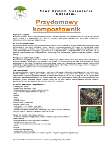 Nowy System Gospodar ki Odpadami Czym jest kompost Kompost to nawóz organiczny powstający głównie z resztek roślinnych. Charakteryzuje się znaczącą zawartością azotu, potasu i przyswajalnych form fosforu. Kompost jest łatwo przys wajalnym dla roślin organicznym składnikiem gleby, zwanym też próchnicą. Co to jest kompostowanie Kompostowanie to proces rozkładu materii organicznej na proste związki w po staci kompostu. Innymi słowy jest to biologiczna przemiana odpadów z domu i ogrodu na pożyteczny nawóz. Na proces ten mają wpływ: rodzaj kompostowanego materiału oraz stopień jego rozdrobnienia, dostępność tlenu, wilgotność, temperatura oraz ilość mikroorganizmów biorących czynny udział w kompostowaniu. Kompostowanie może odbywać się na pryzmie kompostowej lub w kompostowniku (drewnianym lub plastikowym), gdzie warunki dla rozkładu są dużo lepsze. Umiejscowienie kompostownika Kompostownik najlepiej umieś cić w miejscu zacienionym bezpośrednio na gruncie, tak aby nadmiar wilgoci z kompostowanego materiału mógł odpłynąć do gleby, a mikroorganizmy glebowe oraz dżdżownice mogły przeniknąć do kompostu. Ustawienie kompostownika w ustronnym i zacienionym miejscu będzie korzystne dla rozkładu (kompost będzie równomiernie się rozkładał). Kompostownik powinien być umiejscowiony w miejscu nie powodującym uciążliwości dla nieruchomości sąsiednich. Jak kompostować Do kompostownika materiał umieszczamy warstwami. W miarę możliwości materiał powinien być różnorodny. Należy zadbać o to aby jedna warstwa materiału nie miała więcej niż 30 cm. Bardzo ważna j est także odpowiednia wilgotność kompostu. Materiał w kompostowniku nie może być wysuszony (nie może się kruszyć w dłoni), lecz także nie powinien być zbyt mokry - widoczne krople wody (także w dolnej części kompostownika pod klapkami). Kompostowanie będzie szybsze jeżeli raz na kilka tygodni kompostowany materiał zostanie powierzchniowo przemieszany. Nie powinno się ubijać kompostu. Co można wrzucać do kompostownika: -chwasty bez nasion, -powiędniętą skoszoną trawę, -liście (wyłączając liście dębu, orzecha, olchy), -rozdrobnione gałęzie oraz drobne gałązki, -darń, -igliwie, -korę, -trociny, -opadłe owoce, -kwiaty cięte i doniczkowe, -zielone części roślin, -podsuszony osad z oczka wodnego, -niezadrukowaną rozdrobnioną tekturę, -odpadki kuchenne pochodzenia roślinnego (np. obierki warzyw , owoców), -popiół drzewny z kominka, ogniska (musi być zimny). Czego nie powinno się kompostować: -materiału nieorganicznego (szkła, plastiku, metalu, gruzu, piasku, środków chemicznych), -zakonserwowanych solą lub octem odpadków, -skórek owoców cytrusowych, -resztek potraw zawierających dużą ilość tłuszczy, -kości, -mięsa, -zadrukowanego papieru, -porażonych, chorych roślin, -chwastów z dojrzałymi nasionami oraz m.in. perzu i innych mogących rosnąć z kłącza. Wykonano: Referat Ochrony Środowiska i Leśnictwa Urzędu Miejskiego w Kluczborku