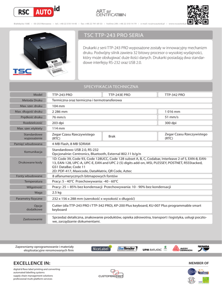 Białołęcka 158E • 03-253 Warszawa • tel.: +48 22 510 14 40 • fax: +48 22 741 69 33 • hotline 24h: +48 22 510 14 79 • e-mail: [email protected] • www.rscautoid.pl TSC TTP-243 PRO SERIA Drukarki z serii TTP-243 PRO wyposażone zostały w innowacyjny mechanizm druku. Podwójny silnik zawiera 32 bitowy procesor o wysokiej wydajności, który może obsługiwać duże ilości danych. Drukarki posiadają dwa standardowe interfejsy RS-232 oraz USB 2.0. SPECYFIKACJA TECHNICZNA Model Metoda Druku Max. szer. druku Max. długość druku Prędkość druku Rozdzielczość Max. szer. etykiety Standardowe wyposażenie Pamięć wbudowana Komunikacja Drukowane kody Fonty wbudowane Temperatura Wilgotność Waga Parametry fizyczne Opcje dodatkowe Zastosowanie TTP-243 PRO TTP-243E PRO TTP-342 PRO Termiczna oraz termiczna i termotransferowa 104 mm 2 286 mm 1 016 mm 76 mm/s 51 mm/s 203 dpi 300 dpi 114 mm Zegar Czasu Rzeczywistego (RTC) Brak Zegar Czasu Rzeczywistego (RTC) 4 MB Flash, 8 MB SDRAM Standardowo: USB 2.0, RS-232 Opcjonalnie: Centronics, Bluetooth, External 802.11 b/g/n 1D: Code 39, Code 93, Code 128UCC, Code 128 subset A, B, C, Codabar, Interleave 2 of 5, EAN-8, EAN13, EAN-128, UPC-A, UPC-E, EAN and UPC 2 (5) digits add-on, MSI, PLESSEY, POSTNET, RSSStacked, GS1 DataBar, Code 11 2D: PDF-417, Maxicode, DataMatrix, QR Code, Aztec 8 alfanumerycznych bitmapowych fontów Pracy: 5 - 40°C Przechowywania: -40 - 60°C Pracy: 25 ~ 85% bez kondensacji Przechowywania: 10 - 90% bez kondensacji 2.5 kg 232 x 156 x 288 mm (szerokość x wysokość x długość) Cutter (dla TTP-243 PRO i TTP-342 PRO), KP-200 Plus keyboard, KU-007 Plus programmable smart keyboard Sprzedaż detaliczna, znakowanie produktów, opieka zdrowotna, transport i logistyka, usługi pocztowe, zarządzanie dokumentami. Zapewniamy oprogramowanie i materiały eksploatacyjne renomowanych firm EXCELLENCE IN: digital & flexo label printing and converting automated labelling systems supply chain management solutions professional multi-platform services MEMBER OF