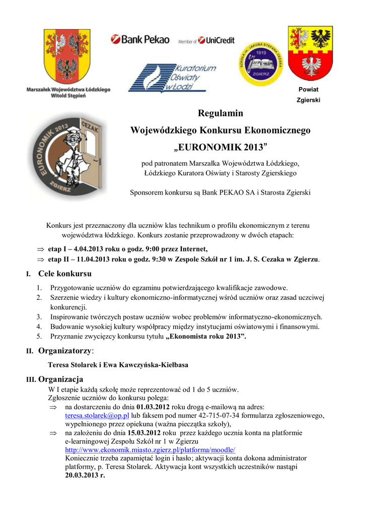 Powiat Zgierski Regulamin Wojewódzkiego Konkursu Ekonomicznego „EURONOMIK 2013” pod patronatem Marszałka Województwa Łódzkiego, Łódzkiego Kuratora Oświaty i Starosty Zgierskiego Sponsorem konkursu są Bank PEKAO SA i Starosta Zgierski Konkurs jest przeznaczony dla uczniów klas technikum o profilu ekonomicznym z terenu województwa łódzkiego. Konkurs zostanie przeprowadzony w dwóch etapach: etap I – 4.04.2013 roku o godz. 9:00 przez Internet, etap II – 11.04.2013 roku o godz. 9:30 w Zespole Szkół nr 1 im. J. S. Cezaka w Zgierzu. I. Cele konkursu 1. 2. 3. 4. 5. Przygotowanie uczniów do egzaminu potwierdzającego kwalifikacje zawodowe. Szerzenie wiedzy i kultury ekonomiczno-informatycznej wśród uczniów oraz zasad uczciwej konkurencji. Inspirowanie twórczych postaw uczniów wobec problemów informatyczno-ekonomicznych. Budowanie wysokiej kultury współpracy między instytucjami oświatowymi i finansowymi. Przyznanie zwycięzcy konkursu tytułu „Ekonomista roku 2013”. II. Organizatorzy: Teresa Stolarek i Ewa Kawczyńska-Kiełbasa III. Organizacja W I etapie każdą szkołę może reprezentować od 1 do 5 uczniów. Zgłoszenie uczniów do konkursu polega: na dostarczeniu do dnia 01.03.2012 roku drogą e-mailową na adres: [email protected] lub faksem pod numer 42-715-07-34 formularza zgłoszeniowego, wypełnionego przez opiekuna (ważna pieczątka szkoły), na założeniu do dnia 15.03.2012 roku przez każdego ucznia konta na platformie e-learningowej Zespołu Szkół nr 1 w Zgierzu http://www.ekonomik.miasto.zgierz.pl/platforma/moodle/ Koniecznie trzeba zapamiętać login i hasło; aktywacji konta dokona administrator platformy, p. Teresa Stolarek. Aktywacja kont wszystkich uczestników nastąpi 20.03.2013 r. rozwiązaniu do dnia 01.04.2013 roku testu próbnego na platformie w celu zapoznania się z podstawowymi zasadami korzystania z platformy i obsługi zadań (szczegółowe informacje zostaną podane na stronie konkursu www.cezak.pl/euronomik2013.htm i /lub w e-mailu zwrotnym). IV. Przebieg konkursu ETAP I Konkurs rozpocznie się 04.04.2013 r. o godzinie 9.00 – wtedy pojawią się na platformie zadania do wykonania (test 30 pytań teoretycznych + 1 zadanie praktyczne) oraz plik do pobrania z firmą do zadania praktycznego. Każdy uczestnik musi umieć odtwarzać dane firmy z pliku w programie Insert (dearchiwizacja firmy). Zadania będą podlegać ograniczeniom czasowym i będą wyświetlane w innej kolejności dla każdego uczestnika. Uczniowie będą rozwiązywać zadania pod okiem opiekunów w swojej szkole, w pracowni komputerowej wyposażonej w programy: Subiekt, Gratyfikant i Rewizor firmy INSERT, konwerter plików pdf (np. Dopdf) oraz w Internet. Podczas trwania konkursu uczestnicy są zobowiązani do samodzielnej pracy. Sposób przesłania zadań do organizatorów będzie szczegółowo przedstawiony na platformie e-learningowej i stronie www.cezak.pl/euronomik2013.htm . ETAP II Do etapu II, który odbędzie się w Zespole Szkół nr 1 w Zgierzu, przystąpi 15 uczniów, którzy uzyskają największą liczbę punktów w etapie I. Etap ten będzie obejmował: test 30 zadań rozwiązywanych na platformie, zadanie praktyczne do rozwiązania w programie: Subiekt, Gratyfikant i Rewizor firmy INSERT. V. Kalendarz konkursu – ostateczny termin składania zgłoszeń przez opiekunów. – zakładanie kont przez uczniów na platformie e-learningowej Zespołu Szkół nr 1 w Zgierzu http://www.ekonomik.miasto.zgierz.pl/platforma/moodle/ 20.03-01.04.2013 r. – rozwiązywanie zadań testowych (próbnych) na platformie. 04.04.2013 r. godz. 9.00 – rozpoczęcie I etapu konkursu w Internecie. 09.04.2013 r. godz. 12.00 – opublikowanie listy laureatów konkursu na platformie i stronie www.cezak.pl/euronomik2013.htm. 11.04.2013 r. godz. 9.30 – rozpoczęcie II etapu konkursu. 11.04.2013 r. godz. 13.30 – uroczyste wręczenie dyplomów i nagród najlepszym uczniom w Zespole Szkół nr 1 w Zgierzu. Do 01 marca 2013 r. Do 15 marca 2013 r. VI. Nagrody Dla laureatów konkursu przewidziane są dyplomy i cenne nagrody.