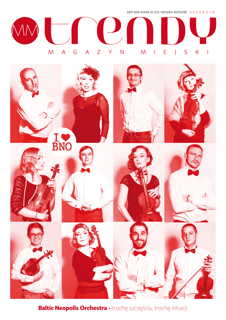 LUTY 2015 NUMER 02 (23) / WYDANIE BEZPŁATNE Baltic Neopolis Orchestra - trochę szczęścia, trochę intuicji 30 Wnętrza Surowy urok wnętrza z północy # 20 Showroom Zmysłowa randka/Tłusty czwartek 48 / Kulinaria # 22 Moda Ogrody Sanssouci - kolekcja Michała Marczewskiego # 28 Rozmowa miesiąca Tomasz Jacyków # 30 Wnętrze Surowy urok wnętrza z północy # 38 Styl OK! Super - szczeciński design # 42 Kulinaria Leszek Wodnicki gotuje # 46 Moto Spis treści 02/ 2015 Premiera u Mojsiuka # 06 Newsroom # 48 Kultura Design, moda, wydarzenia, kultura Na co wybrać się w lutym # 07 Plebiscyt # 52 Rozmowa Wybieramy Trendy Roku Co słychać u Dariusza Więcaszka # 12 Felieton Paweł Krzych: Czas na zakończenie dużych inwestycji # 54 Rozmowa Piotr Niemczyk o skutkach władzy # 14 Temat z okładki # 56 Trendy towarzyskie Baltic Neopolis Orchestra Kto, z kim, gdzie, kiedy i dlaczego #3 MAGAZYN MIEJSKI | NUMER 02/2015 Dobre wieści są takie, że do wiosny zostały nam zaledwie dwa miesiące, a konkretnie mniej niż sześćdziesiąt dni. Luty to pora, kiedy zimy mamy już powyżej dziurek w nosie, tym bardziej takiej jak obecna, która bardziej przypomina kapryszącą jesień. Zwyczajowo temperaturę w lutym u części populacji podnosi dzień zakochanych, ale to zdecydowanie za mało, by doprowadzić do trwalszego ocieplenia klimatu. Co najwyżej, tego dnia zwiększy się liczba rezerwacji w knajpach. Dlatego cierpliwie musimy poczekać na zmiany, umilając sobie czas np. lekturą. Jarosław Jaz / Redaktor naczelny Tym razem na naszej okładce wyjątkowo tłoczno. Choć trudno było zmieścić tam całą Baltic Neopolis Orchestrę, ostatecznie operacja się udała. Pacjent przeżył i ustami swojej szefowej Emilii Goch opowiedział nam o tym, jak spróbować odnieść sukces w branży, jaką jest tzw. kultura. Niedoinwestowana, opanowana przez wydziały, ograniczana przez ludzką wyobraźnię i instytucje powołane do jej finansowania. Cóż... Słowem kluczem, które może tu posłużyć za wskazówkę jest naprawdę ciężka praca. Po więcej szczegółów odsyłam do rozmowy z Emilią. W tym roku chcemy ponownie wskazać na Trendy, które kształtowały życie w mieście podczas minionych dwunastu miesięcy. Wybrać Osobowość, Miejsce, które generowało największą energię i Wydarzenie Roku. Wbrew utartym schematom i internetowym opiniom jest w czym wybierać, a rozmach niektórych wydarzeń przerósł oczekiwania nie tylko organizatorów. Zapraszam do zapoznania się z listą kandydatów, bo tym razem to Wy będziecie decydować, kto zostanie laureatem. O szczegółach będziemy pisać na naszym facebookowym profilu. W tym miesiącu do MM Trendy, zapewne na dłużej, dołączył pasjonat gotowania, jeden z uczestników programu TVN - MasterChef, Leszek Wodnicki. Co miesiąc przygotuje coś specjalnego na naszych łamach, a sekrety swojego zawodu na pewno zdradzi w „Kulinarnym Atelier”, które wkrótce zamierza w Szczecinie otworzyć. Mi wypada tylko życzyć smacznego i powodzenia. A pozostałym oczywiście miłej lektury. Redakcja/ OKŁADKA: Na zdjęciu Baltic Neopolis Orchestra Foto: Radek Kurzaj MUA: Maja Holcman Redakcja: Nowy Rynek 3, 71-875 Szczecin tel. 91 48 13 341; fax 91 48 13 342 e-mail: [email protected] www.mmszczecin.pl/trendy Redaktor naczelny: Jarosław Jaz Product manager: Ewa Żelazko Promocja i marketing: Marta Rospara Redakcja: Paulina Targaszewska, Bogna Skarul, Małgorzata Klimczak, Tomasz Kuczyński, Anna Folkman / Korekta: Beata Pikutowska Dział foto: Sebastian Wołosz, Andrzej Szkocki Skład magazynu: Ewa Kaziszko / MOTIF studio Dystrybucja: Piotr Grudziecki / Druk: COMgraph Sp. z o.o. Dyrektor Zarządzający: Piotr Grabowski Reklama: tel. 500 324 240, fax 91 48 13 360, [email protected] Wydawnictwo: Media Regionalne sp. z o.o. ul. Domaniewska 45, 02-672 Warszawa Prezes: Dariusz Świąder MAGAZYN MIEJSKI | NUMER 02/2015 #4 Dołącz do nas na www.facebook.com/ MagazynMMTrendy Redakcja nie ponosi odpowiedzialności za treść ogłoszeń. Materiałów, które nie zostały zamówione redakcja nie zwraca. Na podstawie art. 25 ust. 1 pkt 1 b ustawy z dnia 4 lutego 1994 r. o prawie autorskim i prawach pokrewnych Media Regionalne sp. z o.o. zastrzegają, że dalsze rozpowszechnianie materiałów opublikowanych w MM Trendy jest zabronione bez zgody Wydawcy. Newsroom Foto: Andrzej Szkocki # Weronika pisze o Zuzi Foto: Andrzej Szkocki Weronika Kowalska ma 11 lat i napisała wraz z tatą Sylwestrem Kowalskim książkę „Szalona Siódemka. Eliksir zapomnienia”. Pozycja pojawiła się na targach książki w Krakowie i przyniosła autorom wspaniałe recenzje. - Zaczęłam pisać podczas wakacji mówi Weronika. - Dużo podróżowaliśmy z tatą. Trochę nam się nudziło w samochodzie, więc zaczęliśmy wymyślać różne historie, aby czas się nie dłużył. I tak się zaczęło. „Szalona Siódemka”, to opowieść o Zuzi i jej przygodach. Razem z koleżankami przeżywa potop w domu, reanimację złotej rybki i wielką ucieczkę po uczcie stulecia w KFC. Książka najpierw miała postać audiobooka. Weronika historie z Zuzią nagrywała na dyktafon. Gdy nagrane fragmenty odsłuchali znajomi, od razu podpowiedzieli, by z tego materiału zrobić książkę. - Pisanie książek wcale nie jest łatwe - przyznaje Weronika. - Najpierw trzeba mieć pomysł. A później trzeba umieć te pomysły przelać na papier, ale tak, by czytelnik zrozumiał „co autor miał na myśli”. Ale ja lubię pisać. (bs) Foto: Archiwum Biżuteria By Dziubeka jest już dostępna Oryginalne naszyjniki, modne bransoletki, okazałe kolczyki, kokieteryjne wisiory i eleganckie broszki firmy „by Dziubeka” można od stycznia kupić w Galerii Kaskada. Firma istnieje od 2006 roku. Jej nazwa pochodzi od nazwiska głównej projektantki, właścicielki i dyrektor artystycznej – Anny Dziubek. Biżuterię jej autorstwa noszą znane polskie aktorki, piosenkarki, dziennikarki i celebrytki, 