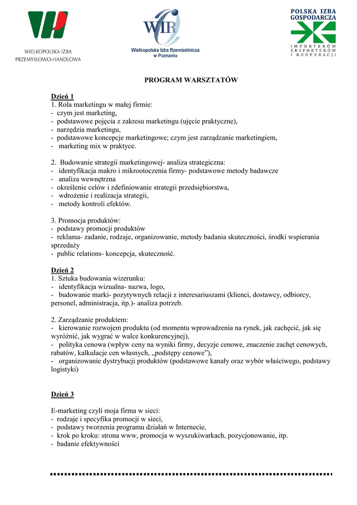 PROGRAM WARSZTATÓW Dzień 1 1. Rola marketingu w małej firmie: - czym jest marketing, - podstawowe pojęcia z zakresu marketingu (ujęcie praktyczne), - narzędzia marketingu, - podstawowe koncepcje marketingowe; czym jest zarządzanie marketingiem, - marketing mix w praktyce. 2. Budowanie strategii marketingowej- analiza strategiczna: - identyfikacja makro i mikrootoczenia firmy- podstawowe metody badawcze - analiza wewnętrzna - określenie celów i zdefiniowanie strategii przedsiębiorstwa, - wdrożenie i realizacja strategii, - metody kontroli efektów. 3. Promocja produktów: - podstawy promocji produktów - reklama- zadanie, rodzaje, organizowanie, metody badania skuteczności, środki wspierania sprzedaży - public relations- koncepcja, skuteczność. Dzień 2 1. Sztuka budowania wizerunku: - identyfikacja wizualna- nazwa, logo, - budowanie marki- pozytywnych relacji z interesariuszami (klienci, dostawcy, odbiorcy, personel, administracja, itp.)- analiza potrzeb. 2. Zarządzanie produktem: - kierowanie rozwojem produktu (od momentu wprowadzenia na rynek, jak zachęcić, jak się wyróżnić, jak wygrać w walce konkurencyjnej), - polityka cenowa (wpływ ceny na wyniki firmy, decyzje cenowe, znaczenie zachęt cenowych, rabatów, kalkulacje cen własnych, „podstępy cenowe”), - organizowanie dystrybucji produktów (podstawowe kanały oraz wybór właściwego, podstawy logistyki) Dzień 3 E-marketing czyli moja firma w sieci: - rodzaje i specyfika promocji w sieci, - podstawy tworzenia programu działań w Internecie, - krok po kroku: strona www, promocja w wyszukiwarkach, pozycjonowanie, itp. - badanie efektywności