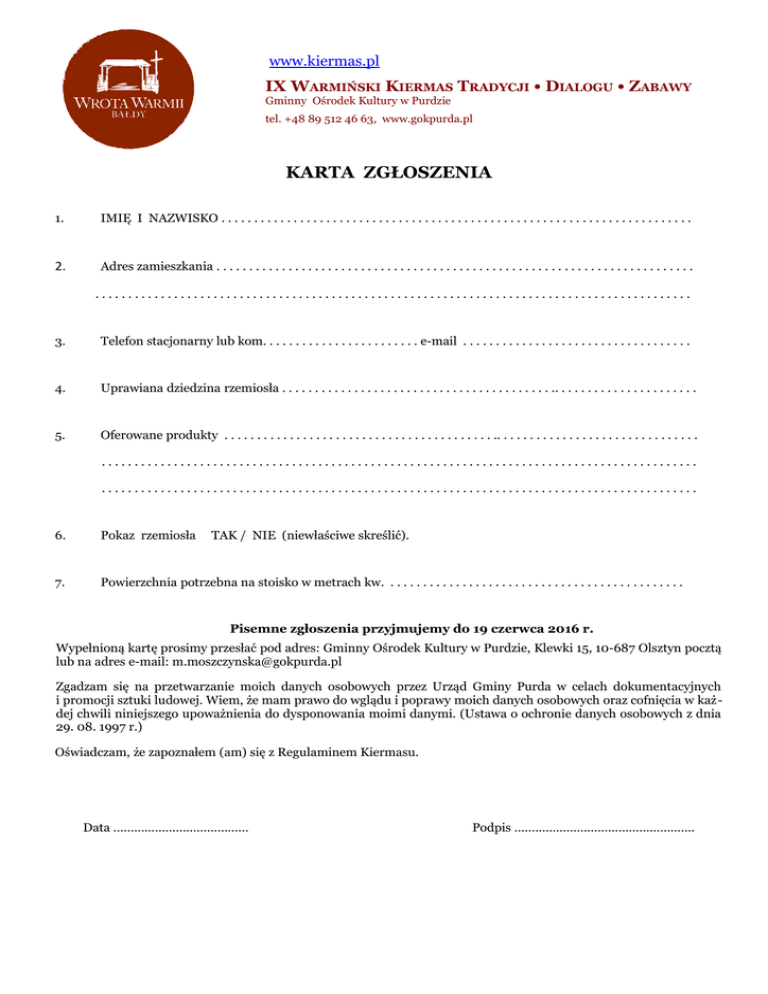 www.kiermas.pl IX WARMIŃSKI KIERMAS TRADYCJI • DIALOGU • ZABAWY Gminny Ośrodek Kultury w Purdzie tel. +48 89 512 46 63, www.gokpurda.pl KARTA ZGŁOSZENIA 1. IMIĘ I NAZWISKO . . . . . . . . . . . . . . . . . . . . . . . . . . . . . . . . . . . . . . . . . . . . . . . . . . . . . . . . . . . . . . . . . . . . . . . . 2. Adres zamieszkania . . . . . . . . . . . . . . . . . . . . . . . . . . . . . . . . . . . . . . . . . . . . . . . . . . . . . . . . . . . . . . . . . . . . . . . . . ........................................................................................... 3. Telefon stacjonarny lub kom. . . . . . . . . . . . . . . . . . . . . . . . e-mail . . . . . . . . . . . . . . . . . . . . . . . . . . . . . . . . . . . 4. Uprawiana dziedzina rzemiosła . . . . . . . . . . . . . . . . . . . . . . . . . . . . . . . . . . . . . . . . . .. . . . . . . . . . . . . . . . . . . . . . 5. Oferowane produkty . . . . . . . . . . . . . . . . . . . . . . . . . . . . . . . . . . . . . . . . . .. . . . . . . . . . . . . . . . . . . . . . . . . . . . . . . ........................................................................................... ........................................................................................... 6. Pokaz rzemiosła TAK / NIE (niewłaściwe skreślić). 7. Powierzchnia potrzebna na stoisko w metrach kw. . . . . . . . . . . . . . . . . . . . . . . . . . . . . . . . . . . . . . . . . . . . . . Pisemne zgłoszenia przyjmujemy do 19 czerwca 2016 r. Wypełnioną kartę prosimy przesłać pod adres: Gminny Ośrodek Kultury w Purdzie, Klewki 15, 10-687 Olsztyn pocztą lub na adres e-mail: [email protected] Zgadzam się na przetwarzanie moich danych osobowych przez Urząd Gminy Purda w celach dokumentacyjnych i promocji sztuki ludowej. Wiem, że mam prawo do wglądu i poprawy moich danych osobowych oraz cofnięcia w każ dej chwili niniejszego upoważnienia do dysponowania moimi danymi. (Ustawa o ochronie danych osobowych z dnia 29. 08. 1997 r.) Oświadczam, że zapoznałem (am) się z Regulaminem Kiermasu. Data ………………………………… Podpis …………………………………………….